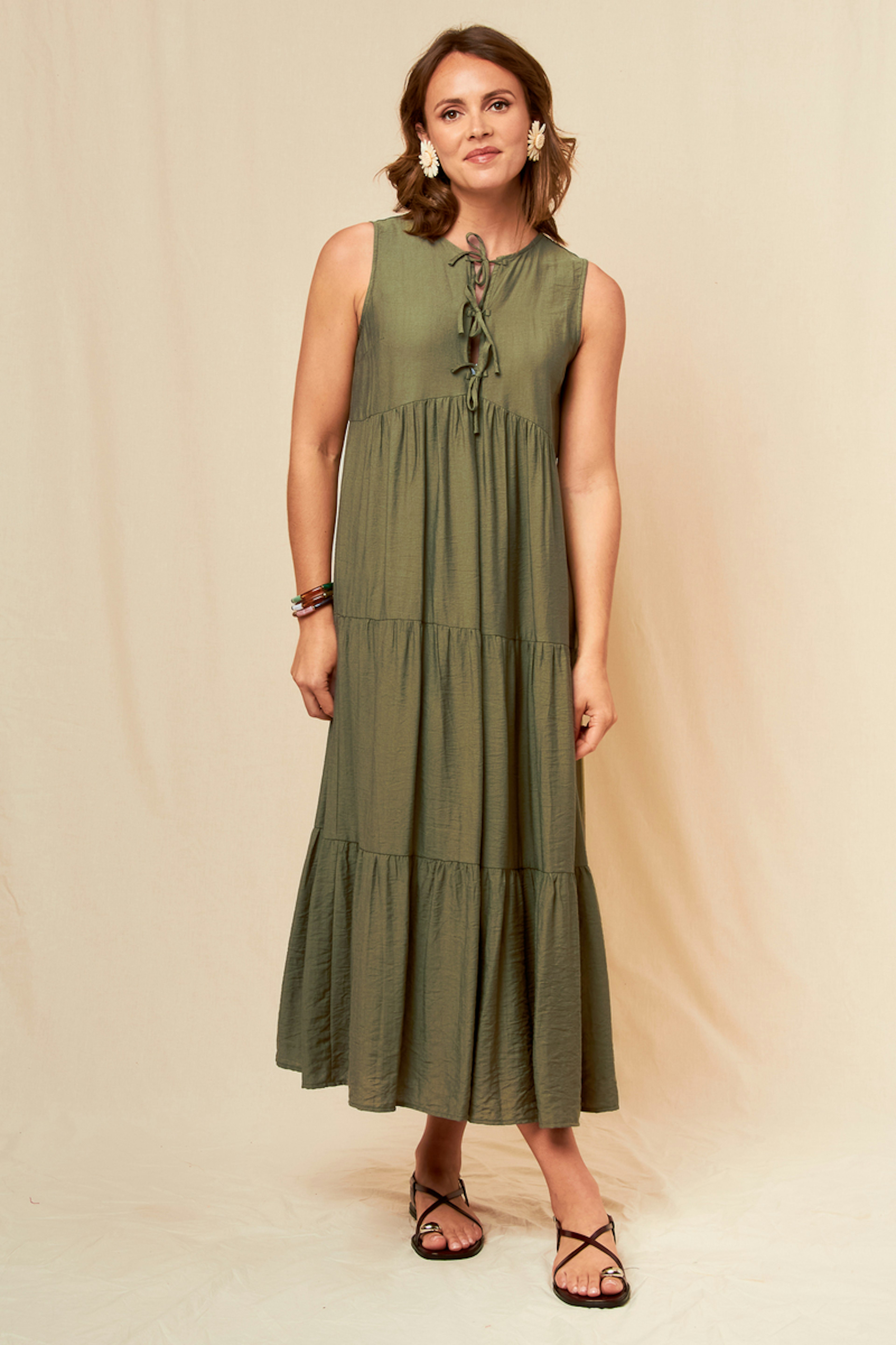 Cette robe légère en viscose se mariera à merveille avec des sandales dorées et un chapeau de paille pour une journée d'été. • Robe longue • Coupe ample et fluide • Sans manches • Détails noués à l'encolure • Volants en étages