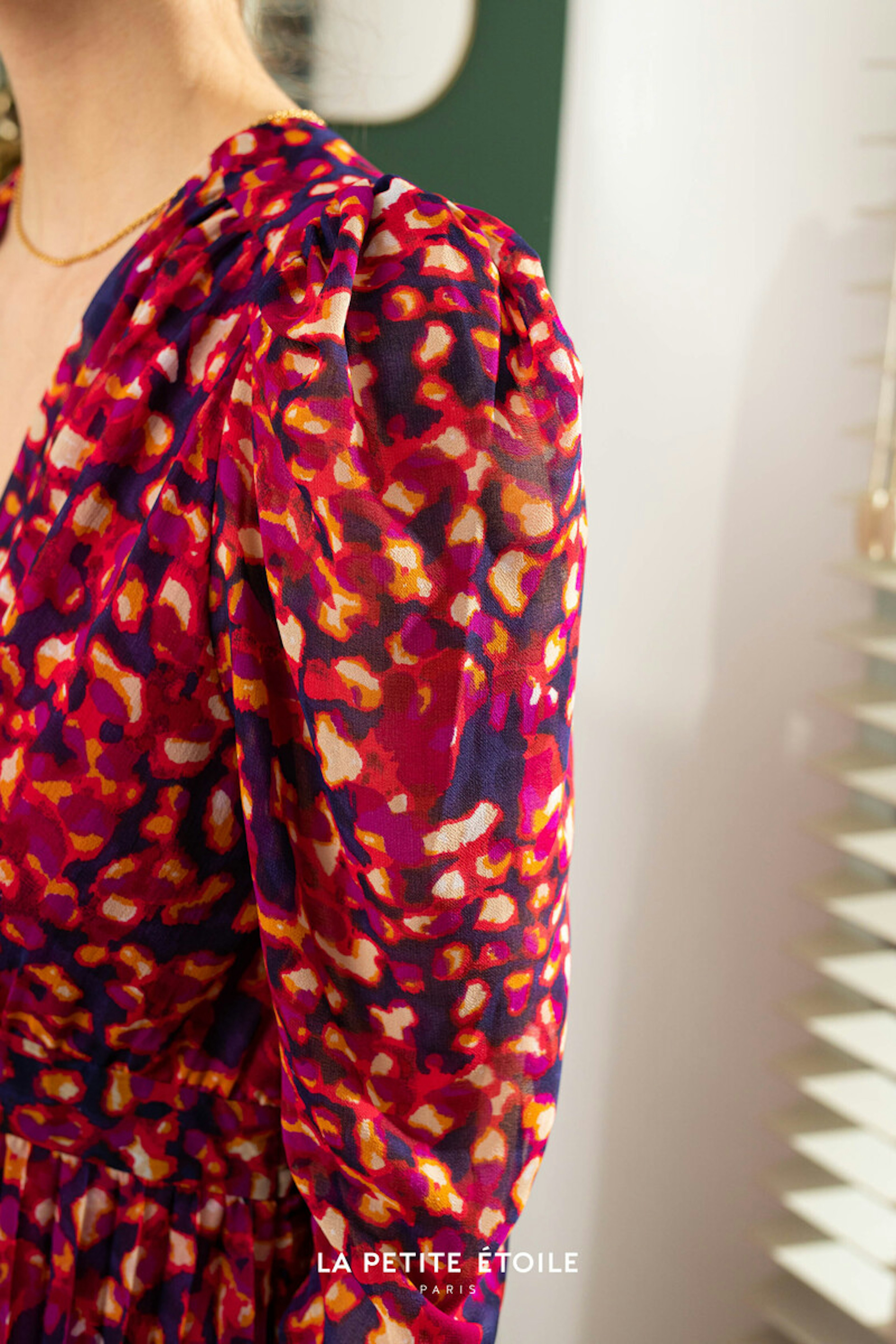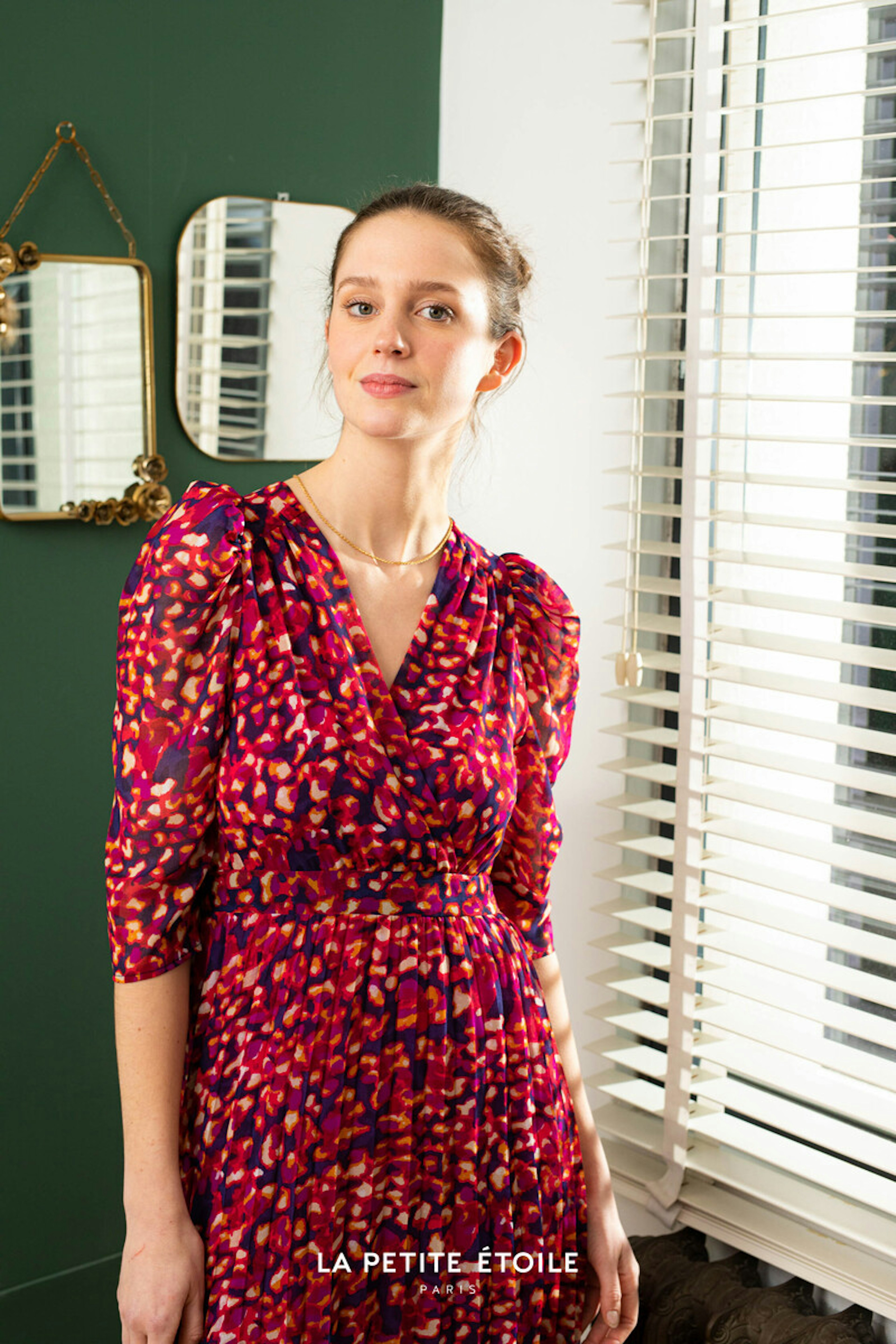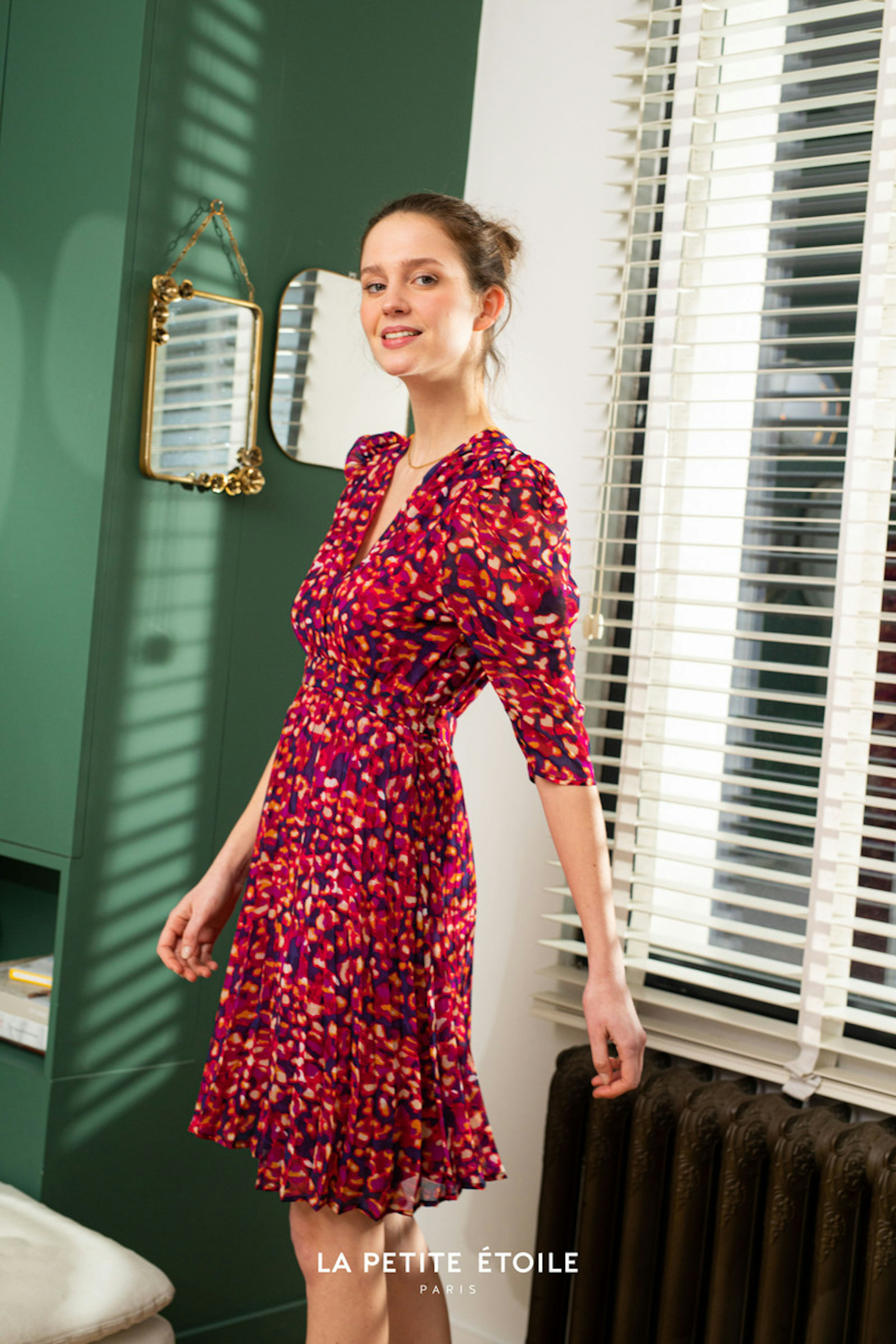 โข Robe courte ร manches 3/4 froncรฉes โข Imprimรฉ lรฉopard violet sur fond rose flash โข Dรฉcolletรฉ V โข Doublure : 70% polyester, 30% rayon