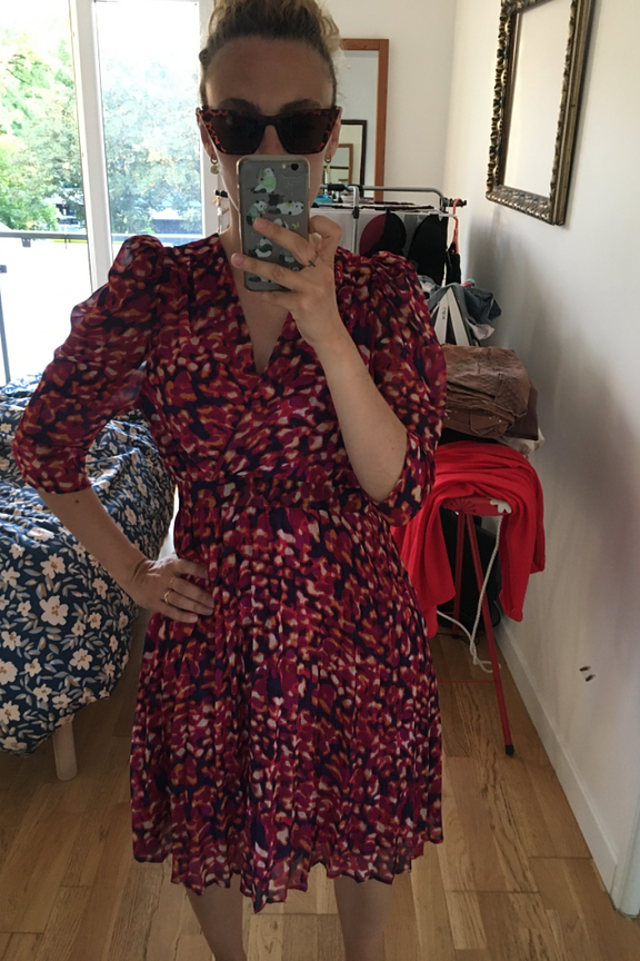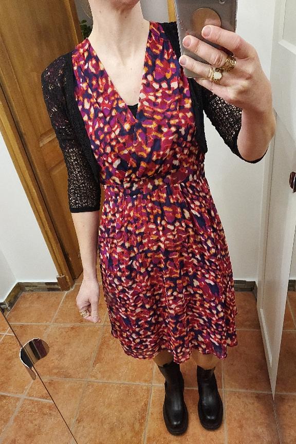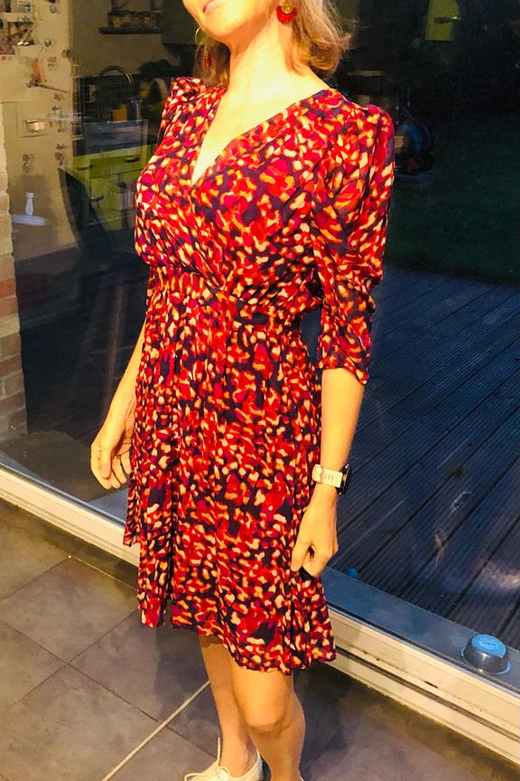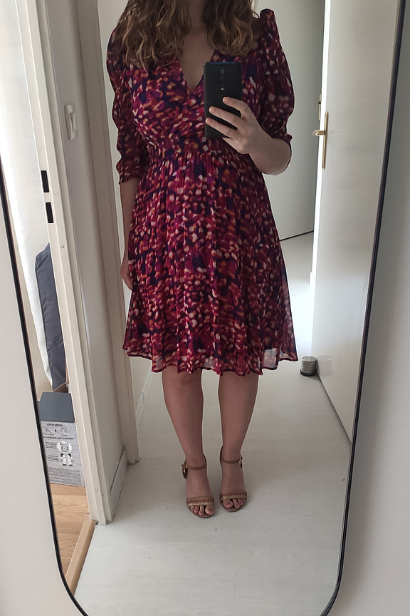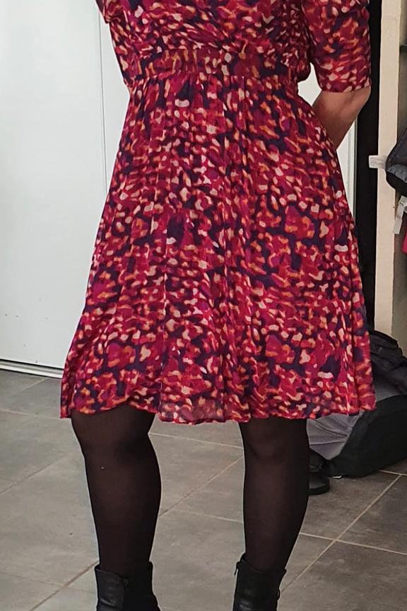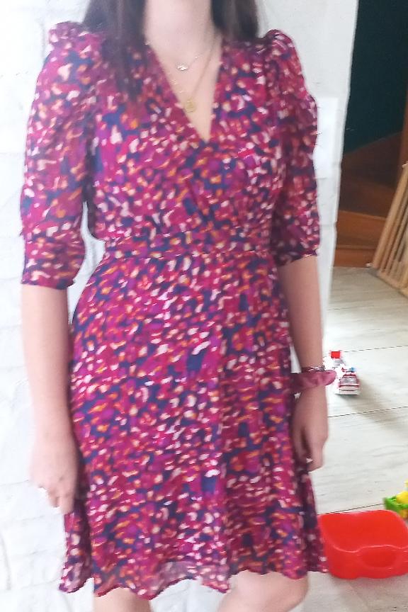 โข Robe courte ร manches 3/4 froncรฉes โข Imprimรฉ lรฉopard violet sur fond rose flash โข Dรฉcolletรฉ V โข Doublure : 70% polyester, 30% rayon