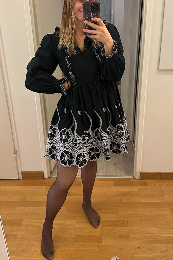 Associez cette robe avec des bottes hautes et un manteau long pour un look hivernal chic. โข Robe courte en coton biologique โข Coupe ample et รฉvasรฉe โข Manches longues bouffantes โข Col avec dรฉtail brodรฉ โข Motif floral contrastรฉ en bas