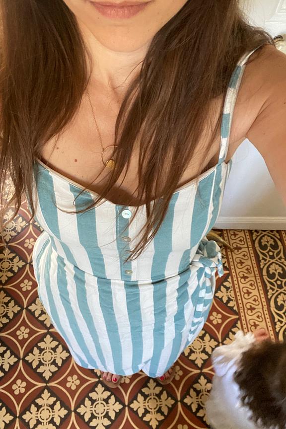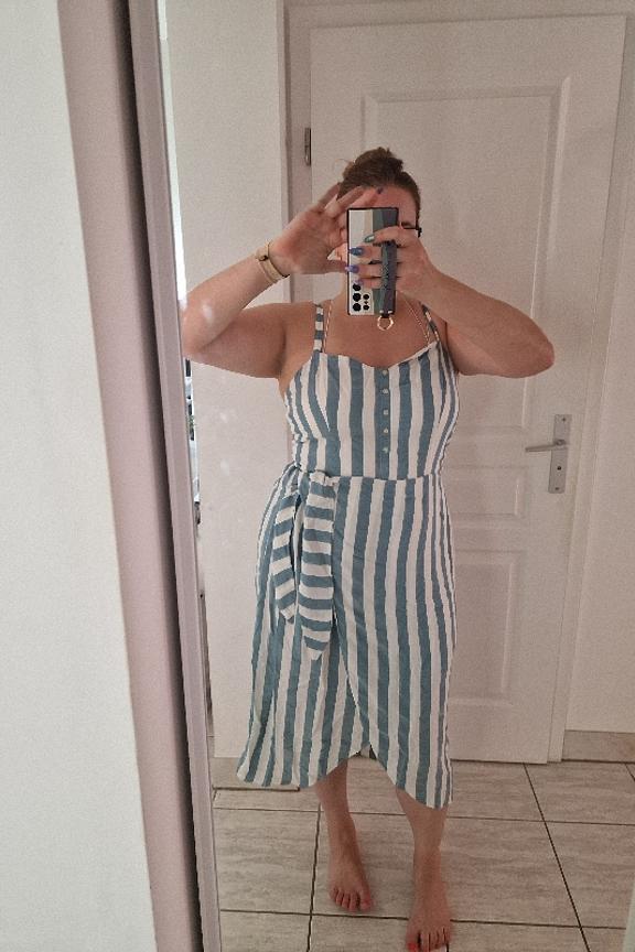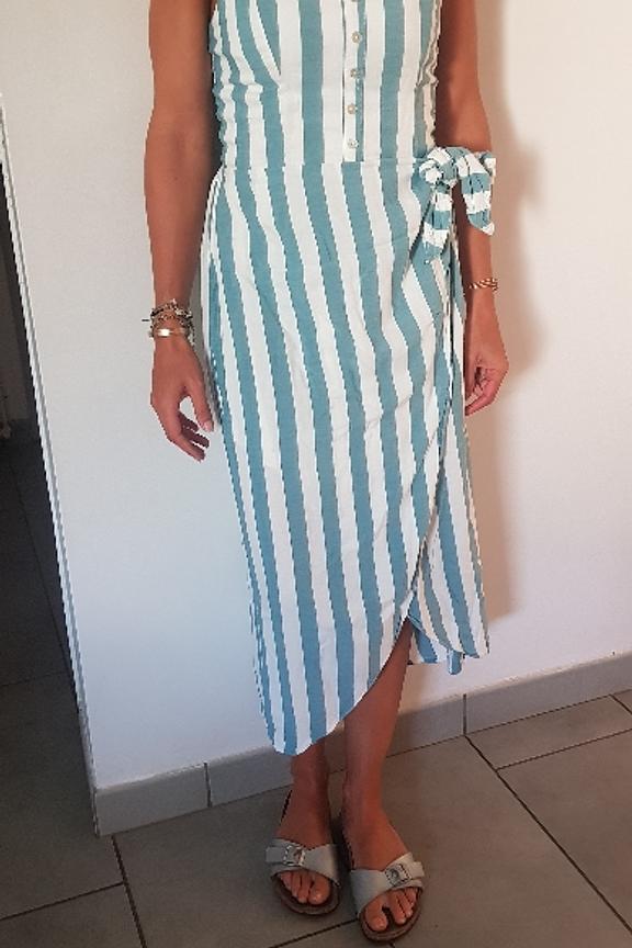 โข Robe sans manches rayรฉe bleue et blanche โข Boutons sur la poitrine โข Taille cintrรฉe โข Partie ร nouer sur la hanche