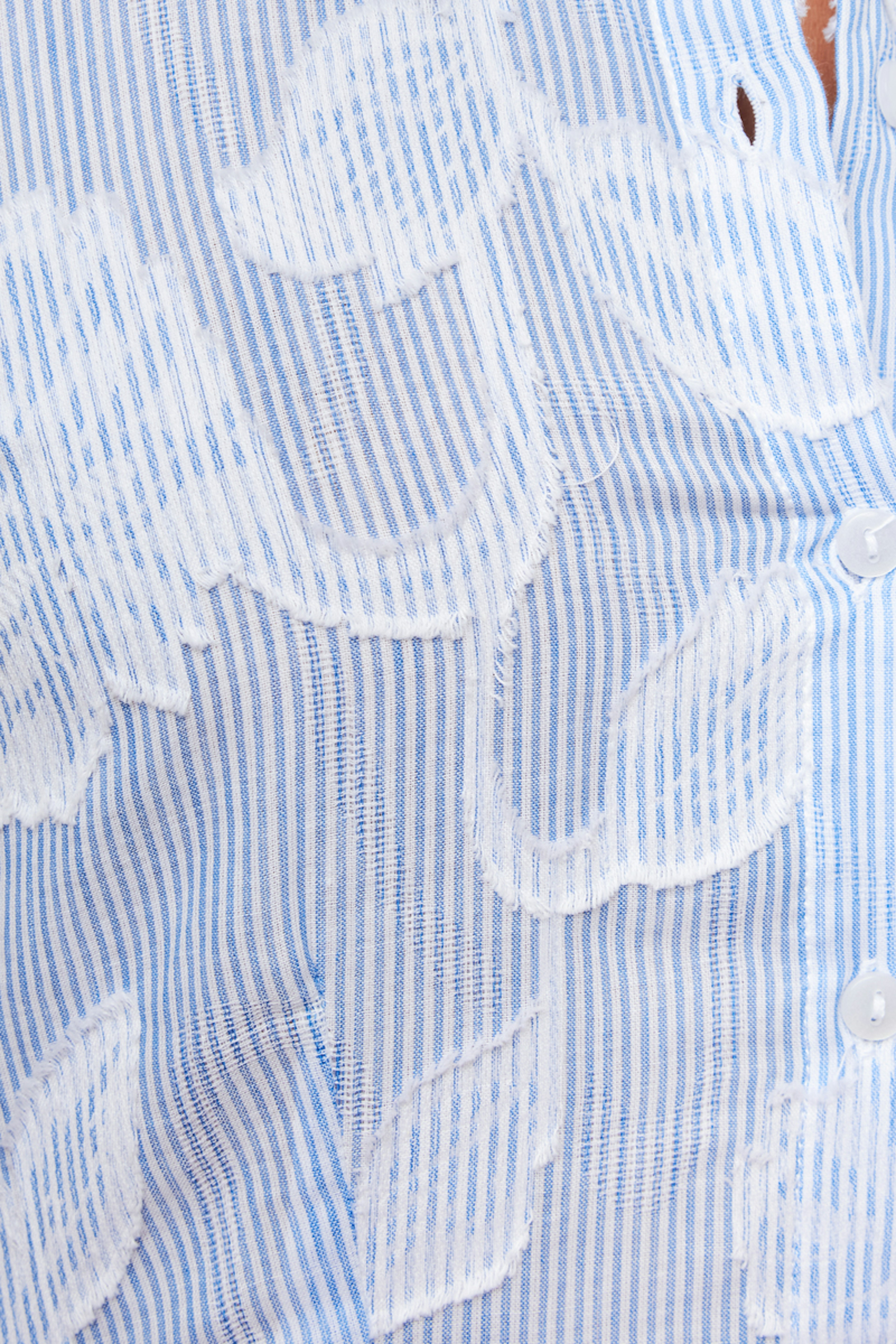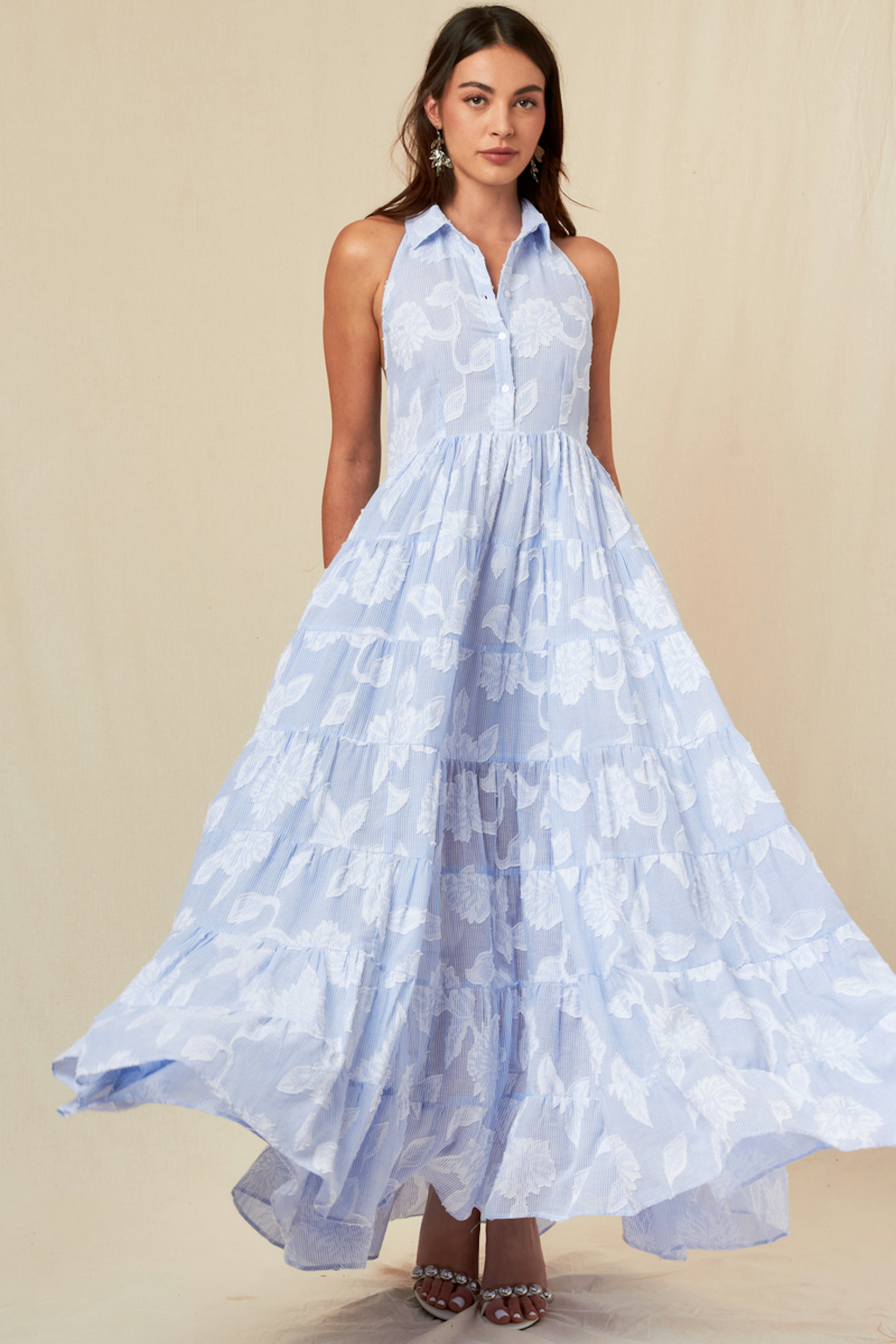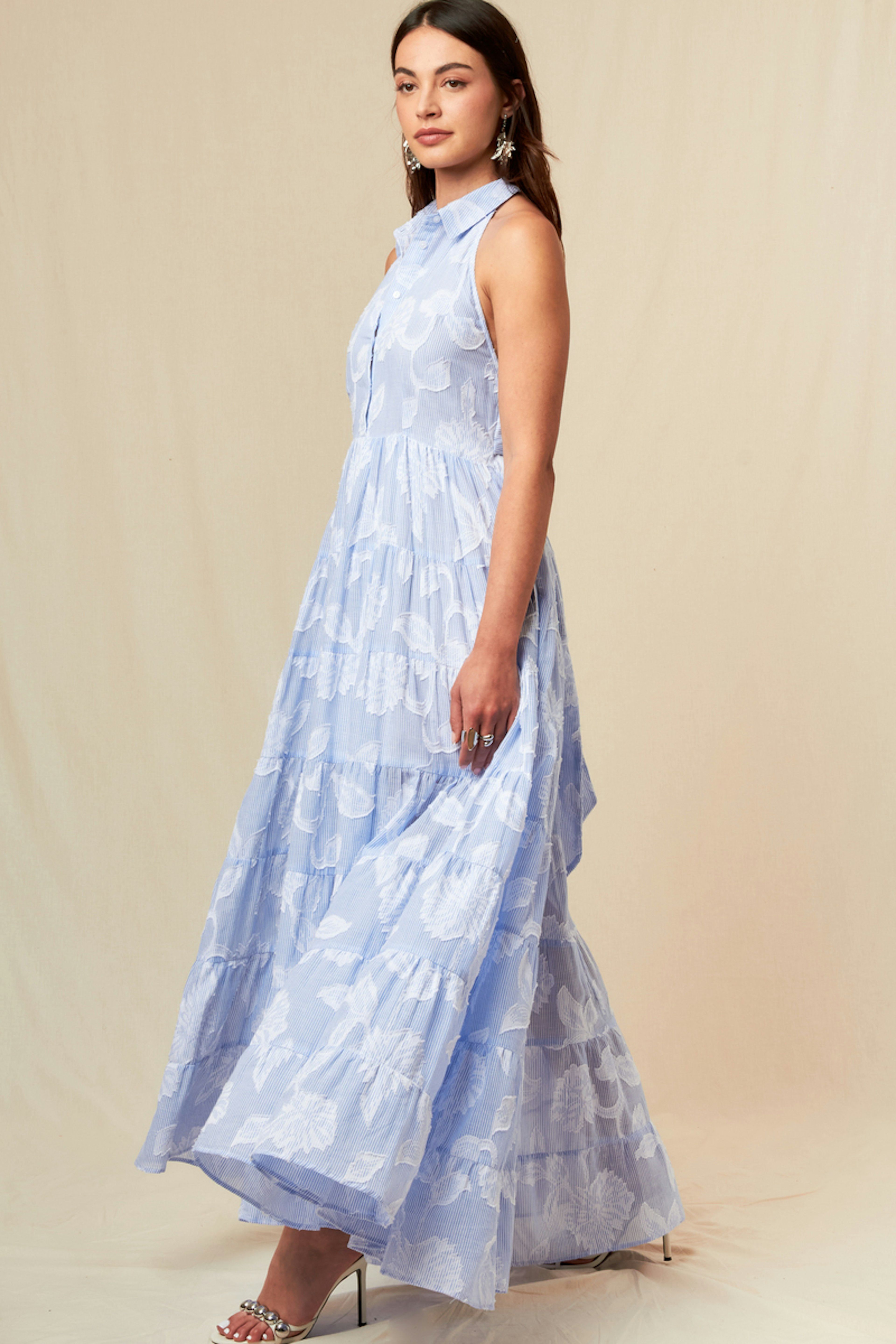 Portez cette robe avec des boucles d'oreilles pendantes et des sandales à talons pour un look estival chic. • Robe longue en coton • Col chemise élégant • Ceinture ajustable à nouer • Sans manches • Motif imprimé floral