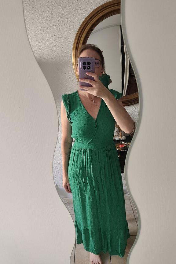 “Reçue très froissée en raison de sa matière (non repassée pour la photo). Jolie couleur mais baille beaucoup au niveau de la poitrine et compliqué de porter un soutien gorge.”