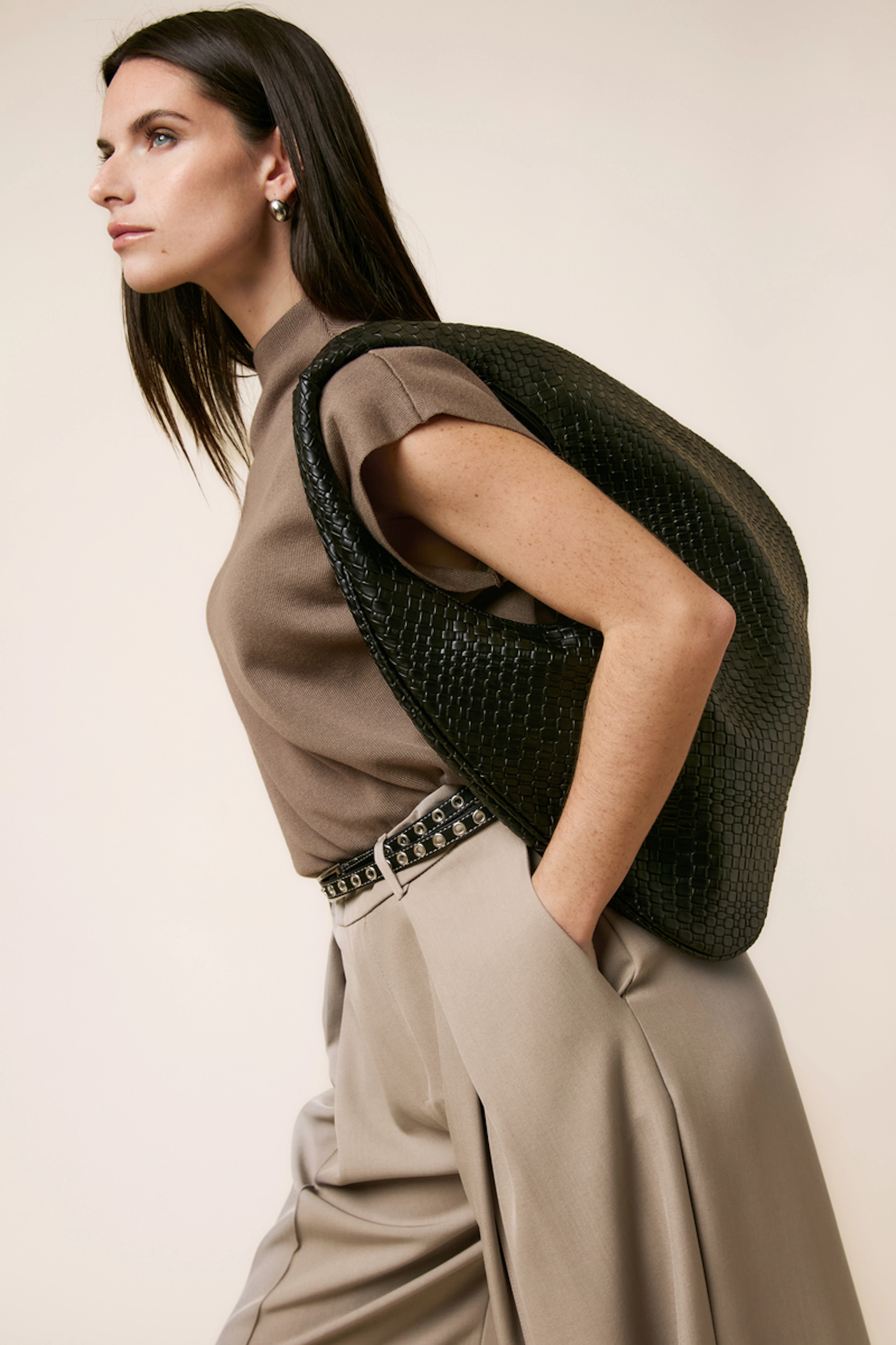 Assorti à une tenue élégante, ce sac à main structuré mettra en valeur votre silhouette. Portez-le avec un manteau long pour un style chic. • Sac à main spacieux • Texture tressée contemporaine • Fermeture zippée pratique • Grandes anses confortables • Design noir intemporel et sophistiqué