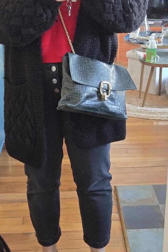 Ce sac en cuir vert se marie élégamment avec un manteau long ou une veste en cuir pour un look sophistiqué. Parfait en toute saison. • Sac à main en cuir • Chaîne dorée élégante • Fermeture à boucle dorée • Motif crocodile • Couleur vert profond