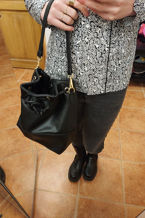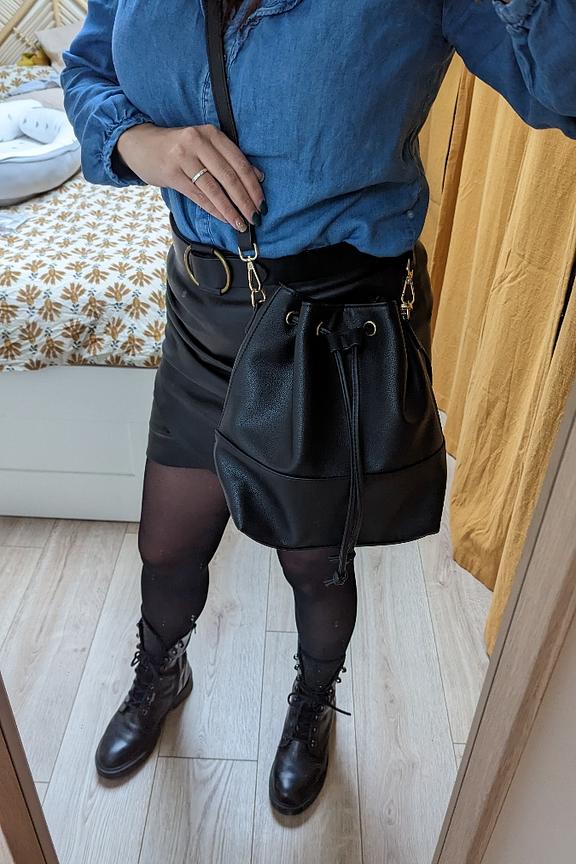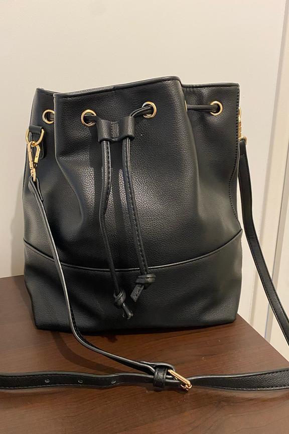 • Sac seau en simili cuir noir • Bandoulière réglable et détachable avec une longueur de chute de 55cm • Poignées amovibles • 1 grande poche • Fermeture en serrant les cordons • Taille : 23 x 28 x 11 cm