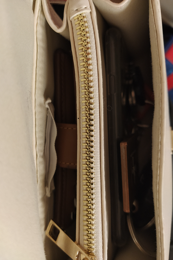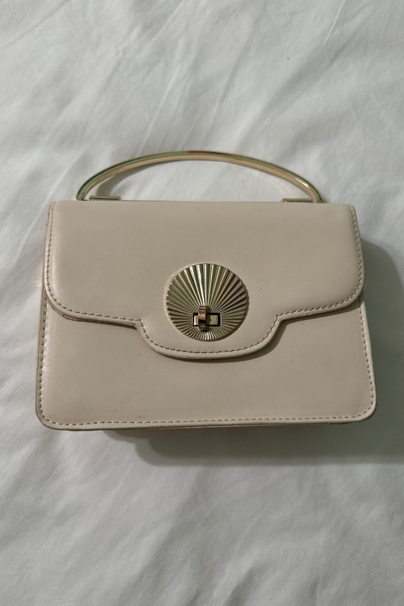 โข Besace รฉcrue dรฉtail poignรฉe mรฉtallique โข Fermoir tourniquet โข Chaรฎne dorรฉe โข Pochette intรฉrieure zippรฉe