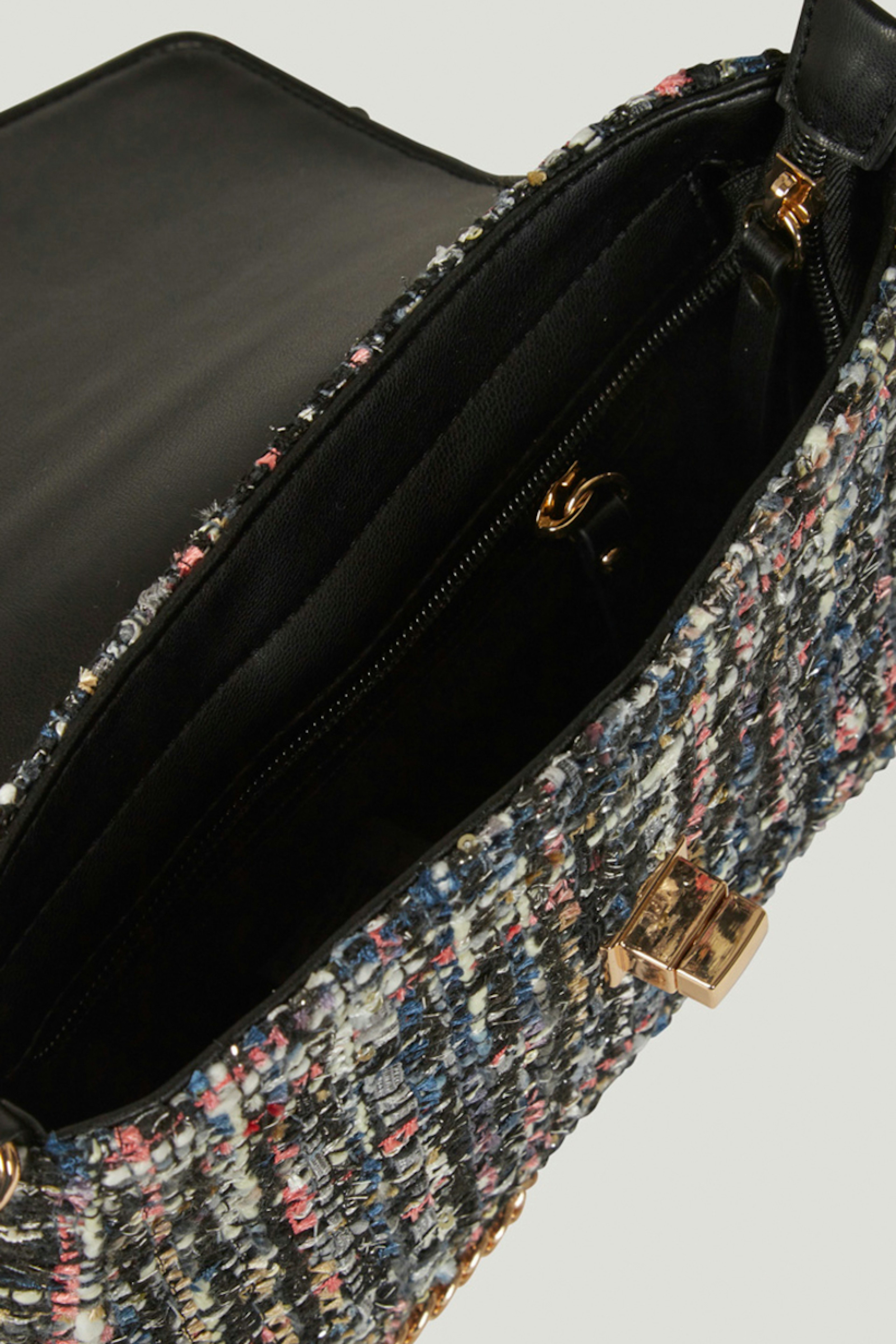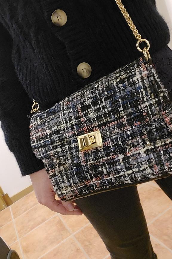 โข Sac ร main conรงu dans une matiรจre effet tweed bleu marine โข Se ferme ร l'aide d'un fermoir โข Fermeture zippรฉe ร l'intรฉrieur du sac โข Chaรฎne dorรฉe โข Donne un cรดtรฉ rรฉtro ร vos tenues โข Dimensions : H17 L22 P7 cm