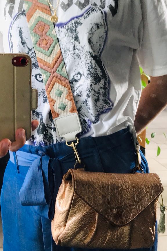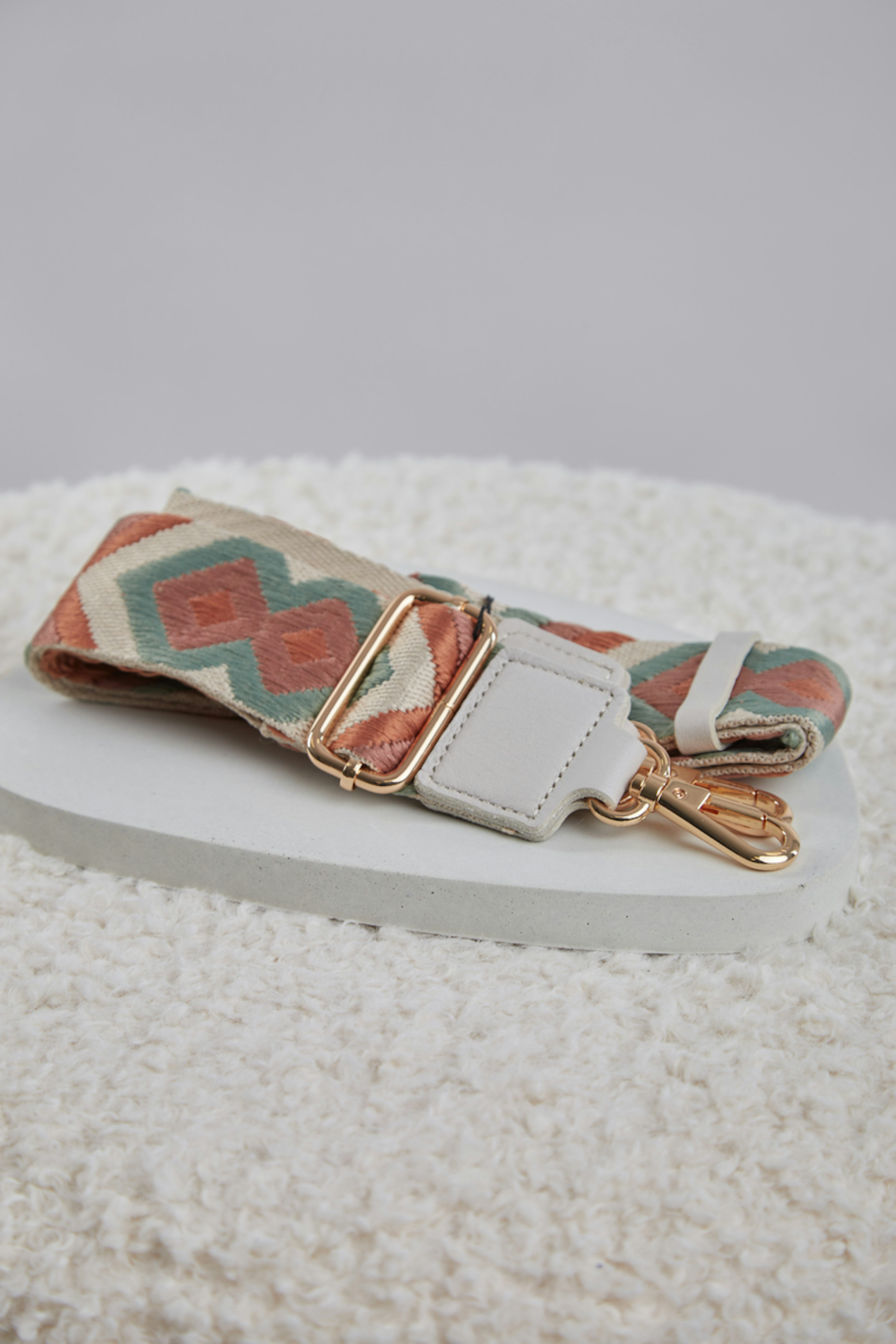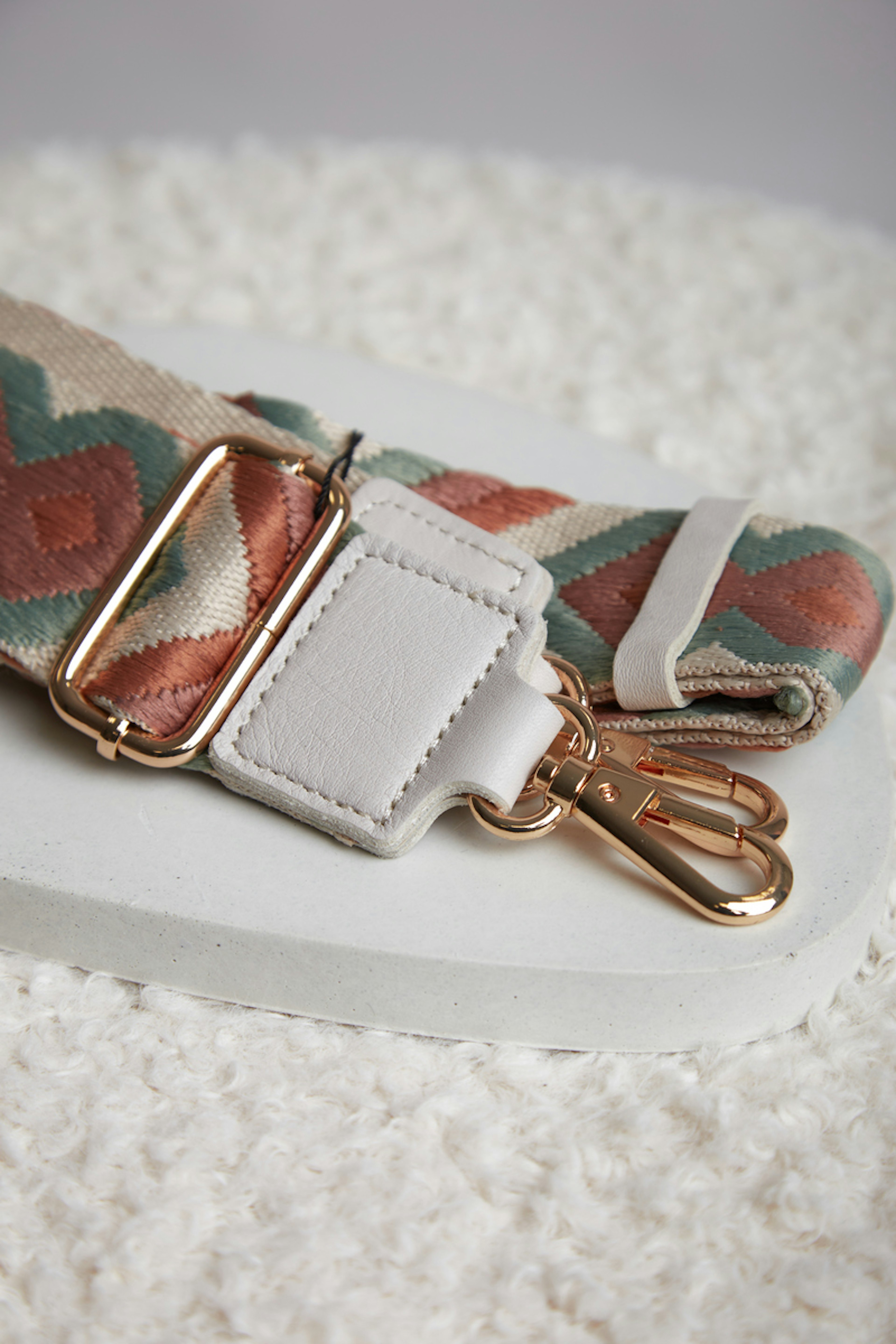 โข Sangle de sac ร main dรฉtachable โข Motifs abstraits roses, verts et beiges โข Mousquetons d'attache dorรฉs โข Longueur rรฉglable pour ajuster votre sac ร vos envies !