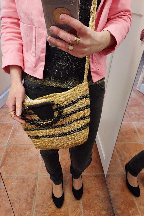 โข Panier avec rayures noires โข Anses en perles โข Se ferme par un pochon interne โข Dimensions : 27 x 33 x 2 cm โข Composition : 100% Jute