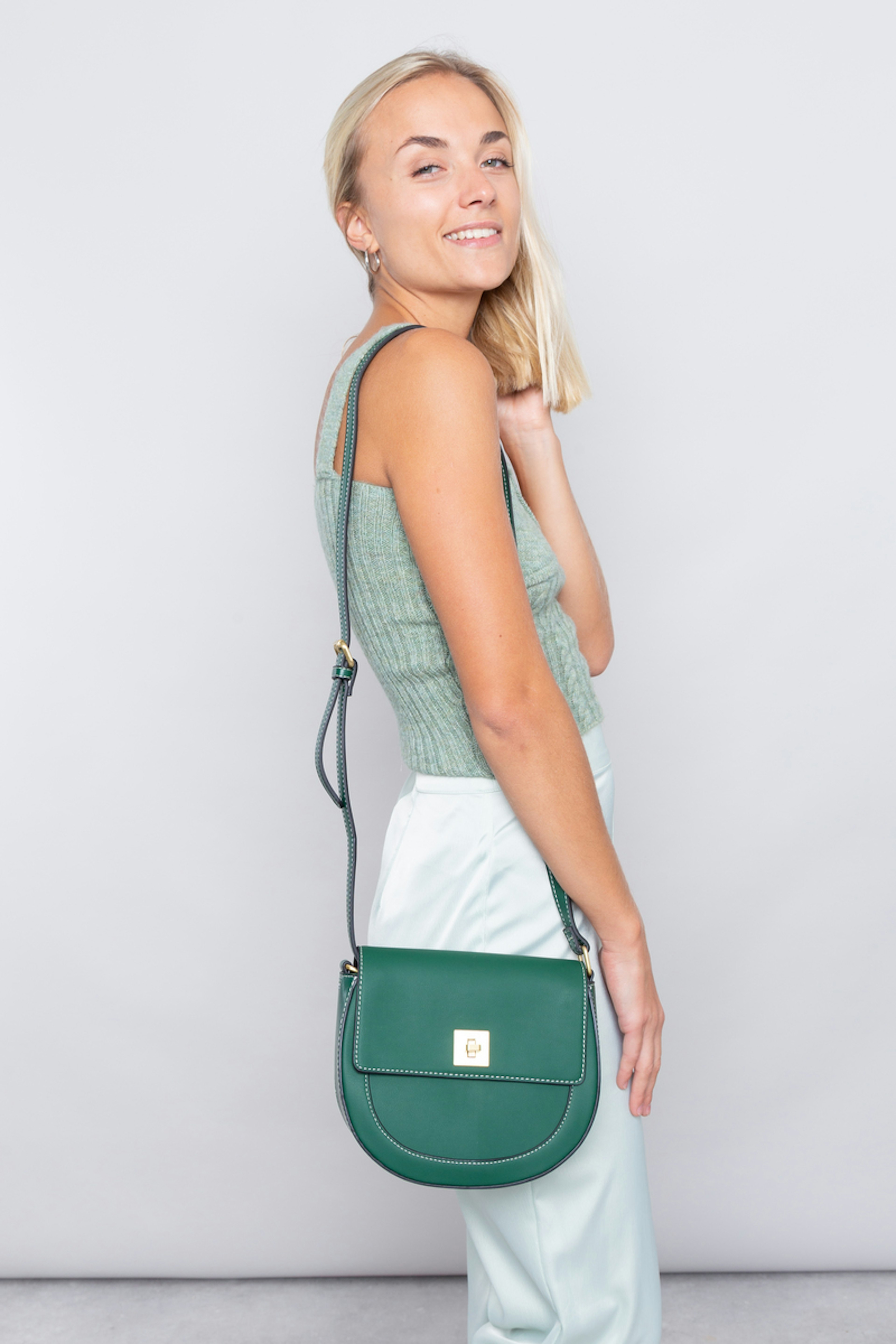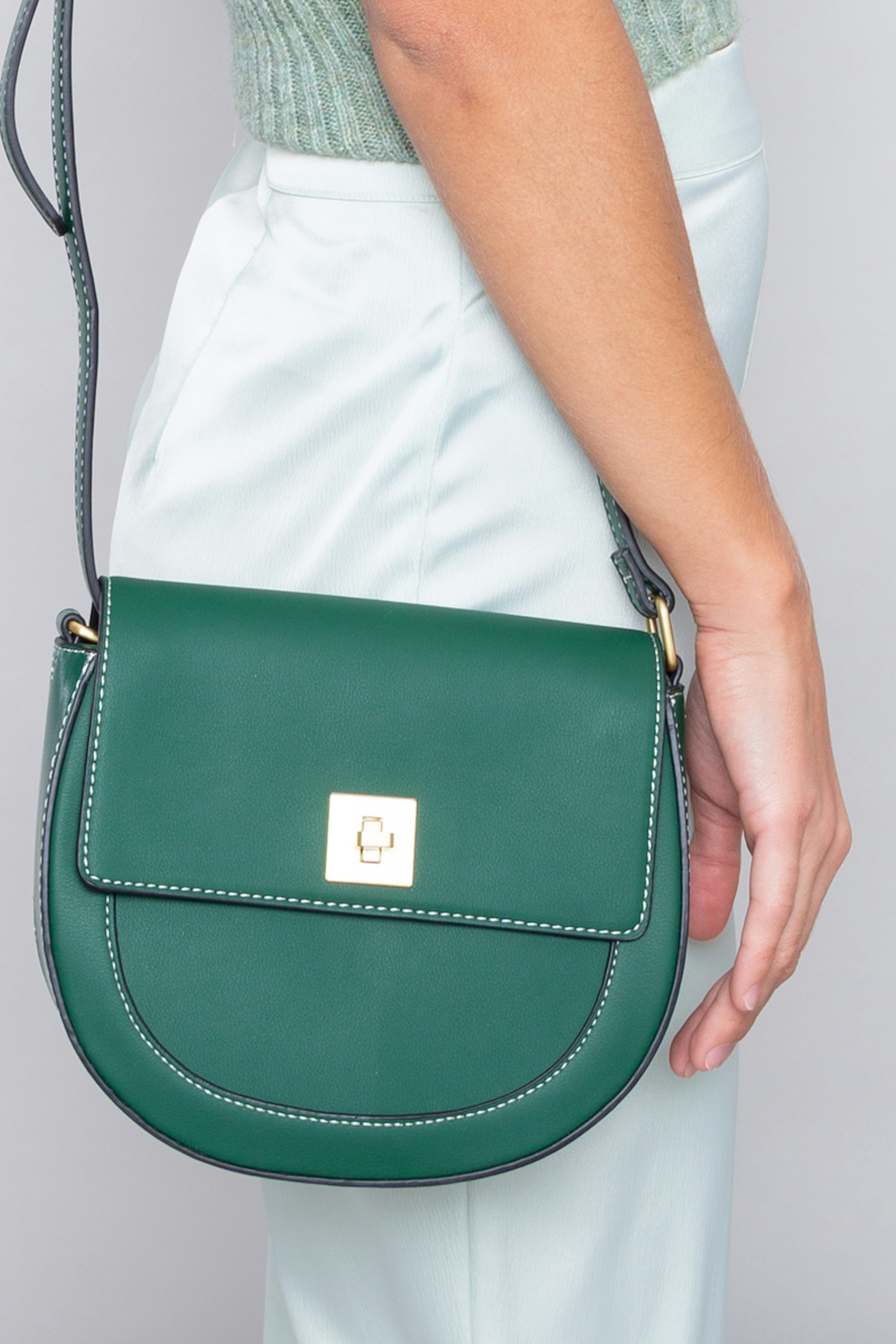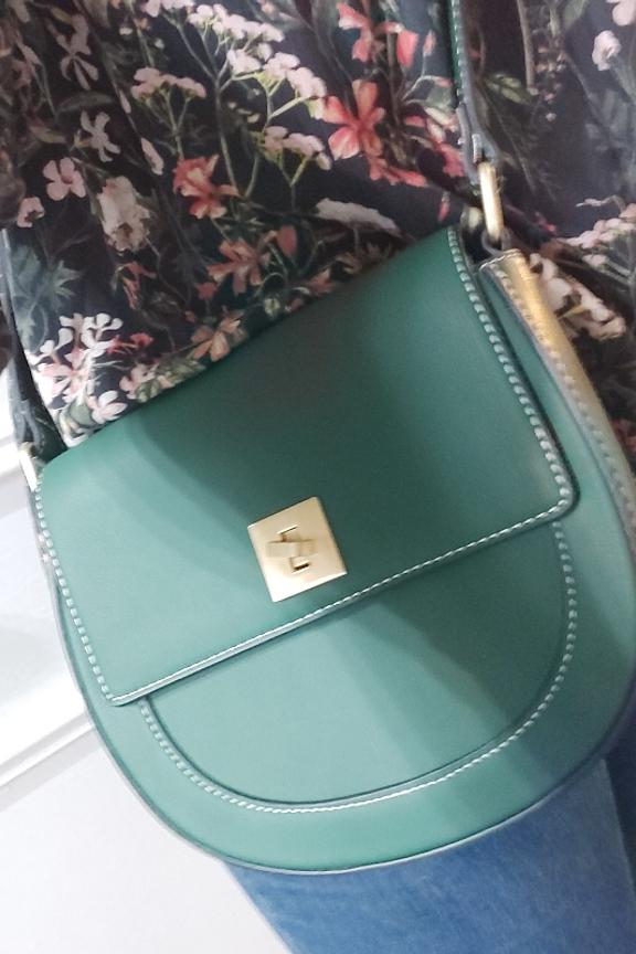 โข Petit sac vert ovale โข Bandouliรจre ajustable โข Fermeture par crochet dorรฉ