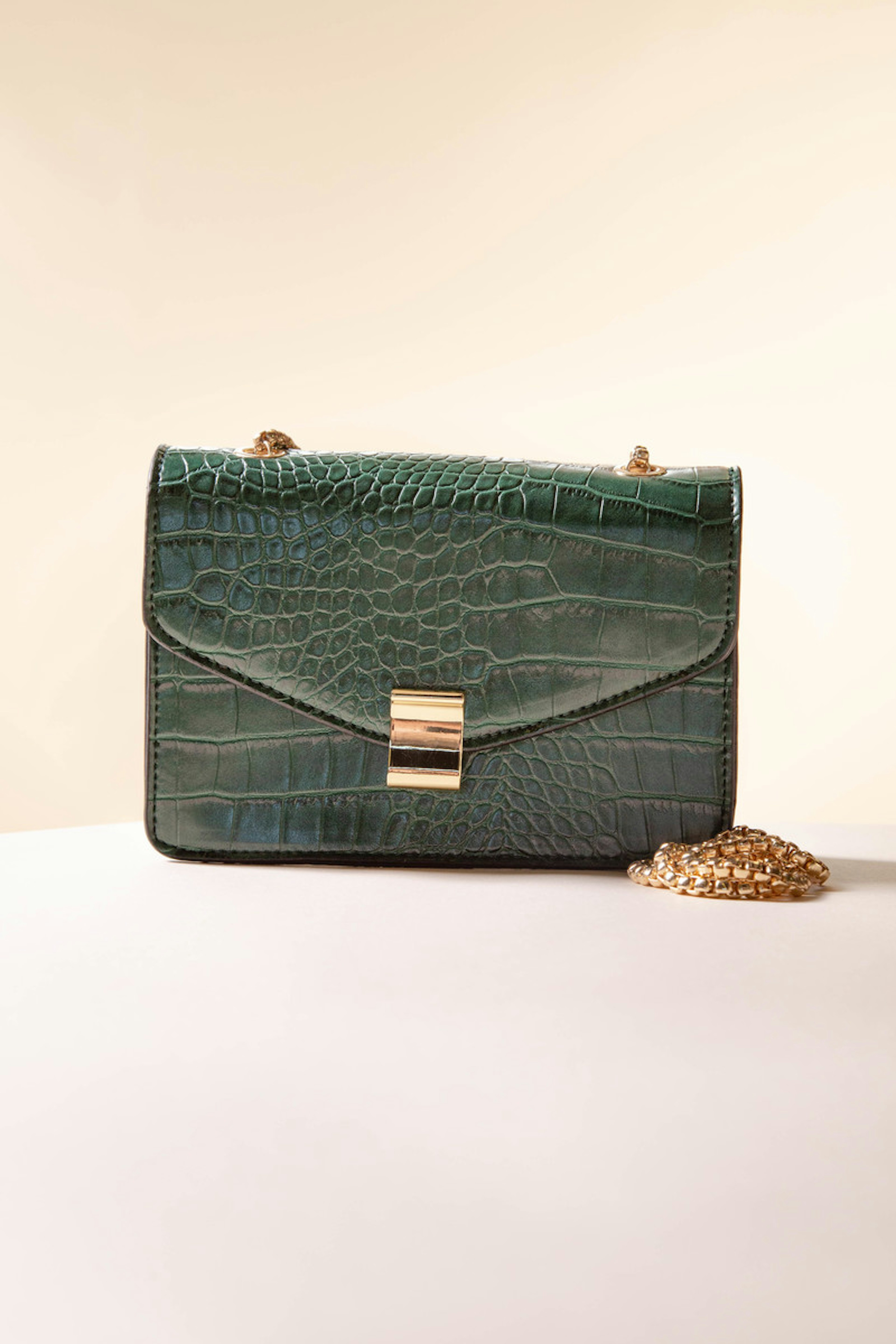Sac ร  main imprimรฉ croco et chaรฎne en mรฉtal dorรฉ.