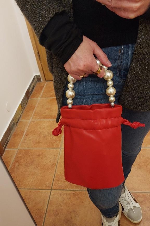 Illuminez votre tenue avec ce sac éclatant. Parfait pour ajouter une touche chic à une tenue décontractée, en toute saison. • Sac seau élégant • Fermeture par cordon • Anse en perles • Couleur rouge vive • Finition lisse