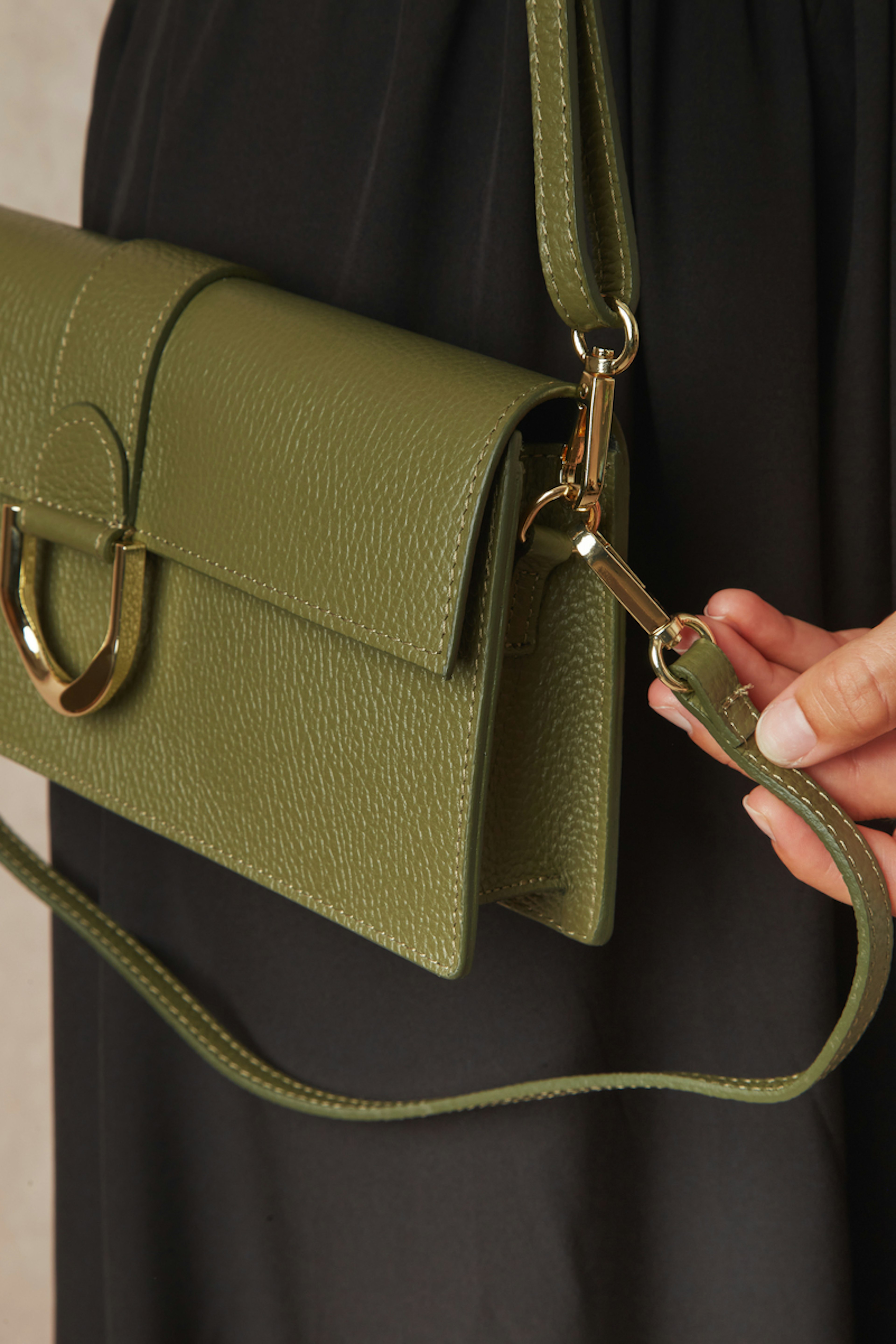 ร‰lรฉgant et intemporel, ce sac en cuir vert se marie parfaitement avec une robe noire pour un look chic et sophistiquรฉ. Il rehaussera รฉgalement un ensemble dรฉcontractรฉ comme un jean slim et un chemisier blanc. โ€ข Sac en cuir โ€ข Fermeture ร  rabat โ€ข Dรฉtail boucle dorรฉe โ€ข Sangle ajustable โ€ข Texture grainรฉe