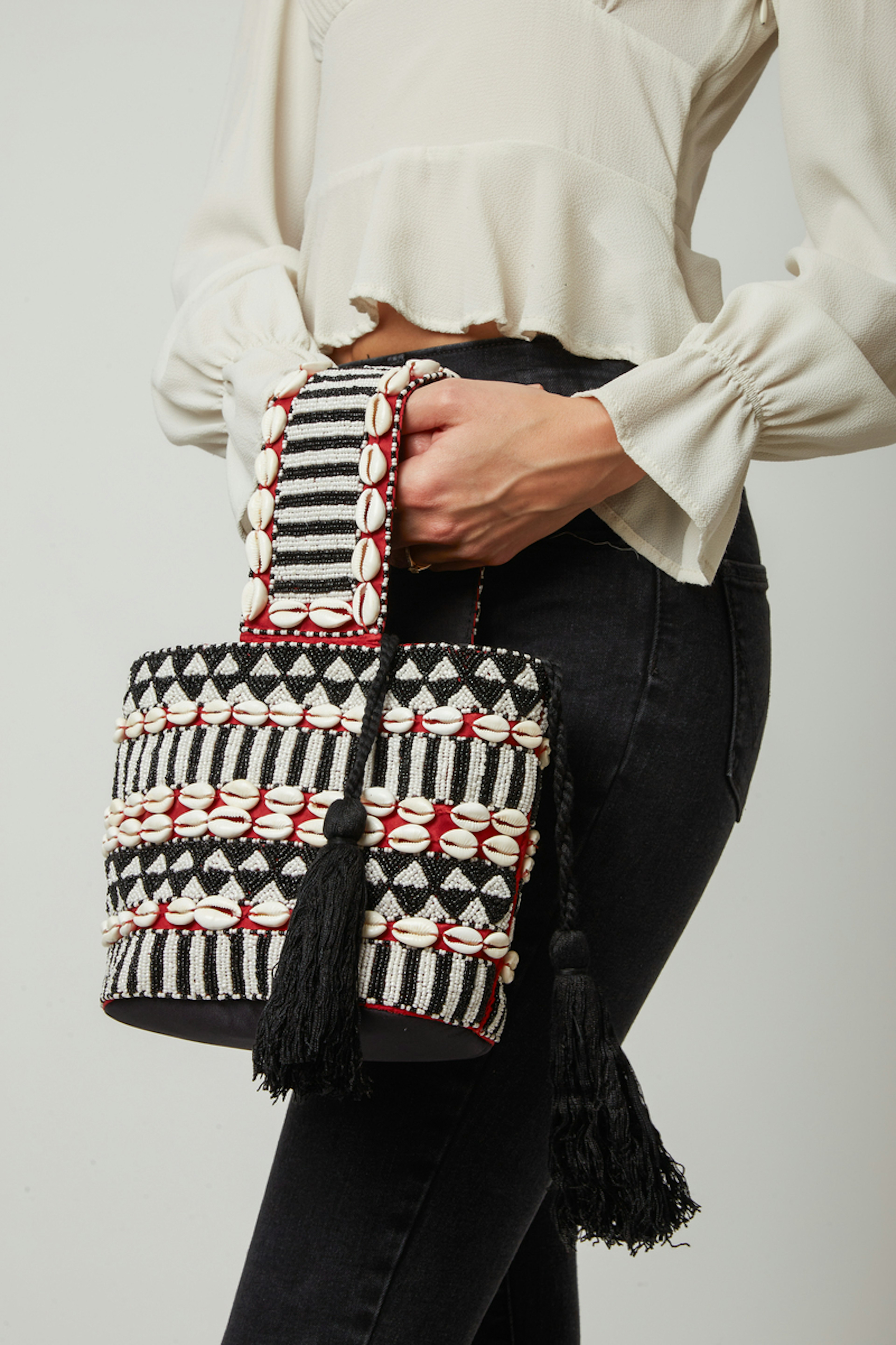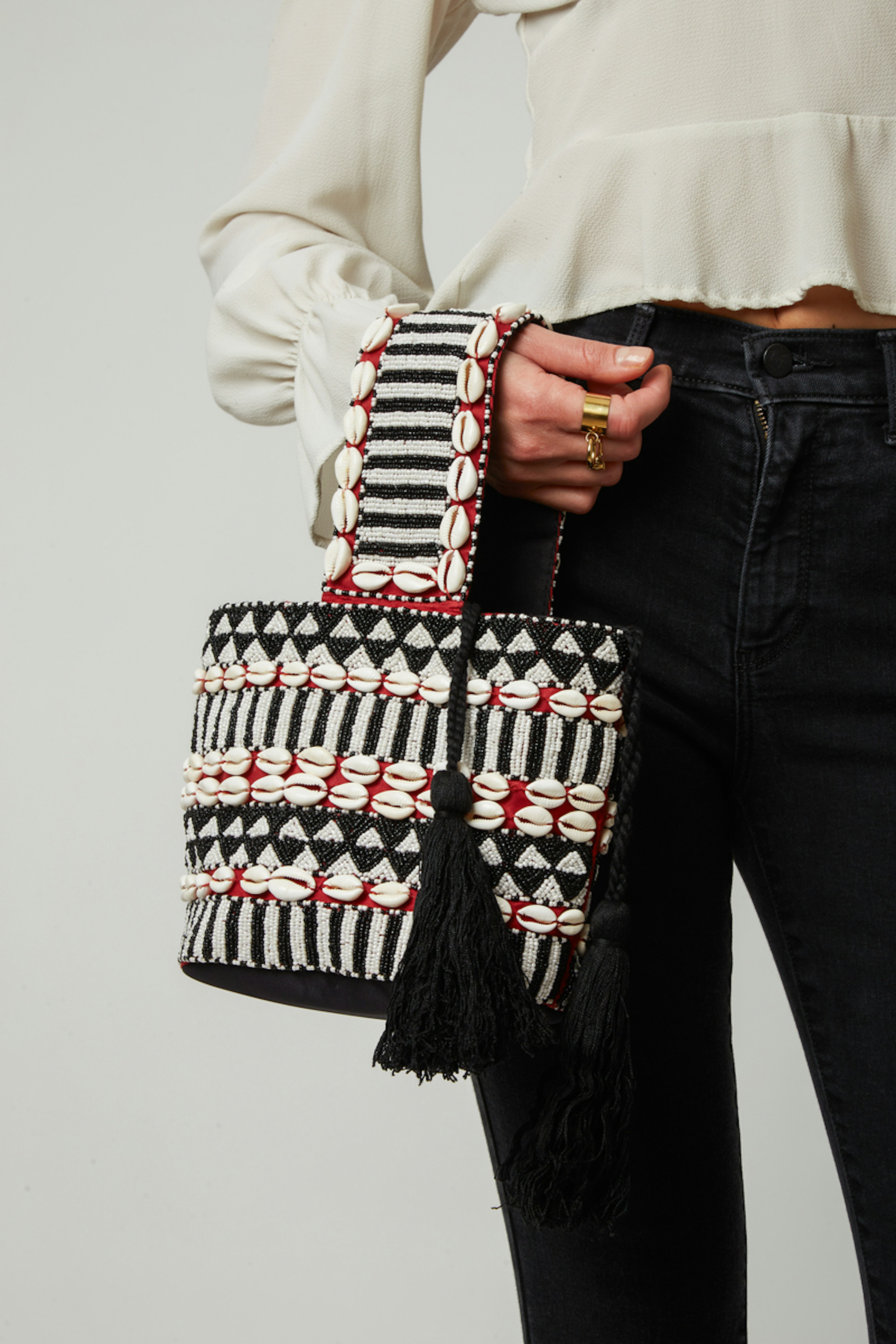 Envie de rayonner sous le soleil estival ? Associez ce sac Hipanema ร une robe blanche bohรจme pour un contraste รฉclatant. โข Sac tissรฉ ร motifs โข Forme seau โข Dรฉtails pompons noirs