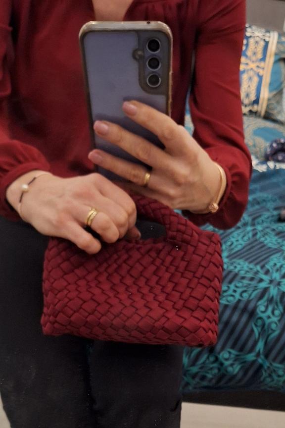 Ajoutez une touche de chic à votre tenue avec ce sac tressé. À porter avec une robe noire pour une soirée élégante, parfait en toute saison. • Sac à main • Design tressé • Poignées intégrées • Bandoulière amovible • Couleur rouge intense
