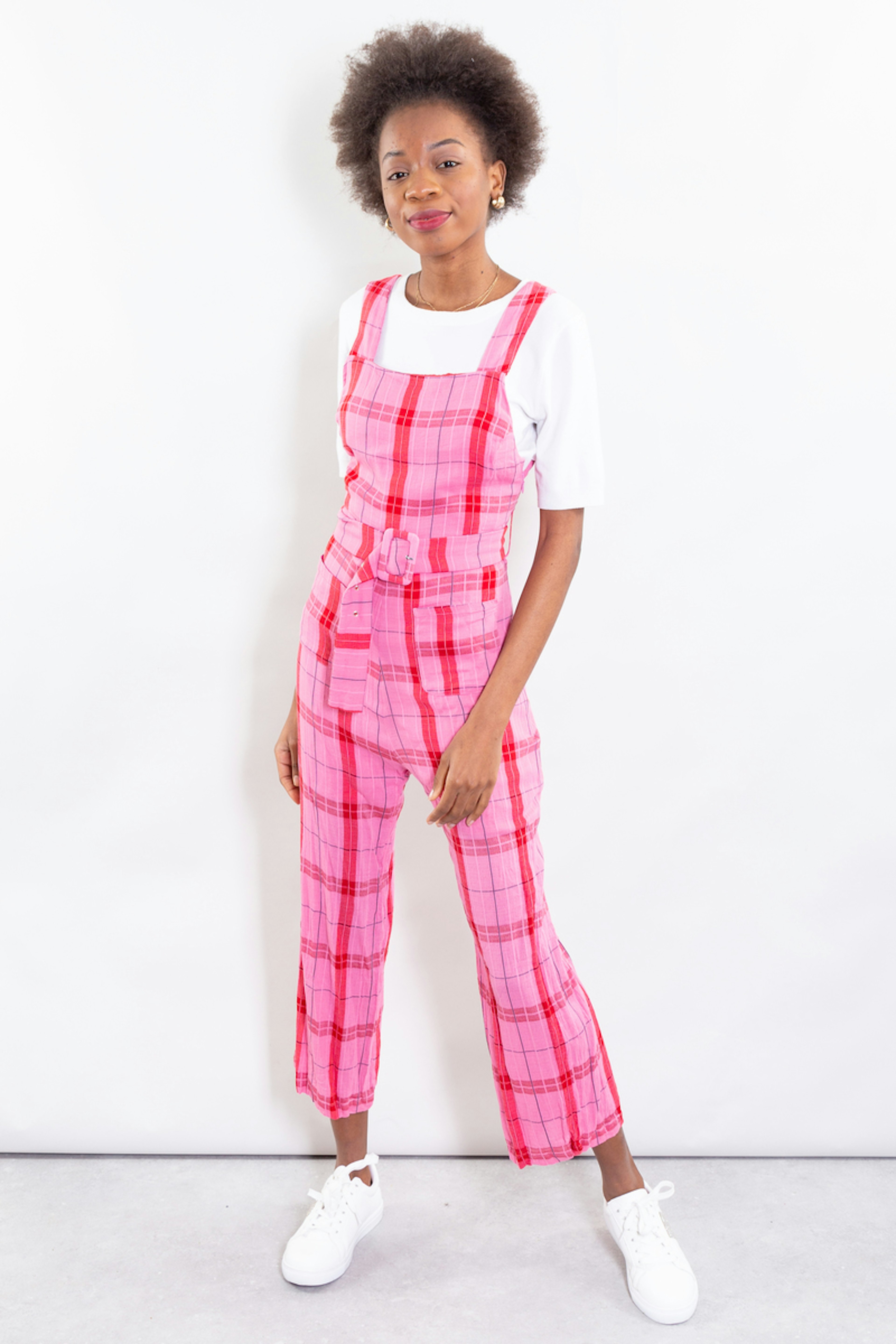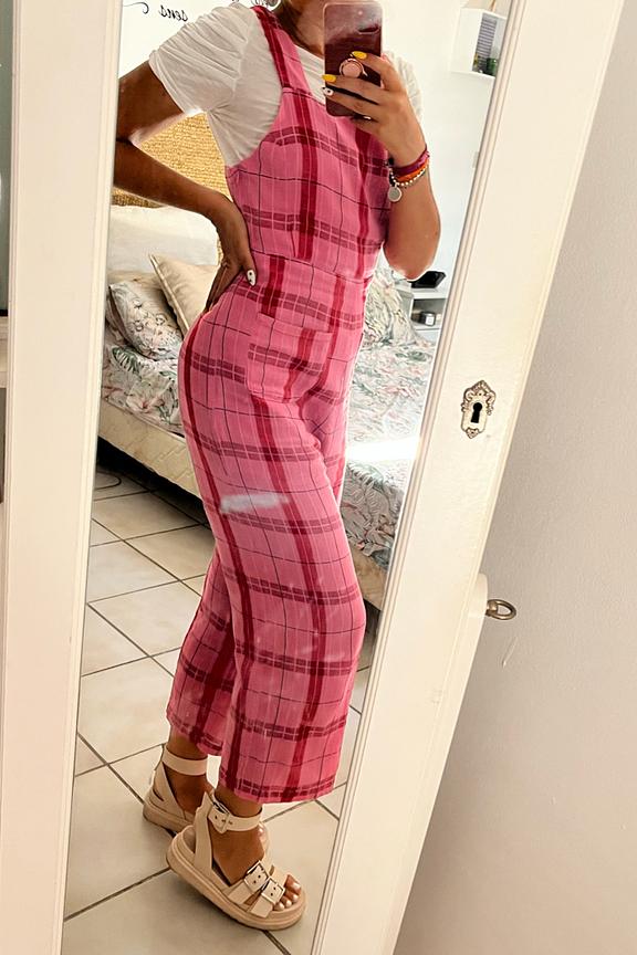 Combi pantalon parfaite pour รชtre la STAR des terrasses cet รฉtรฉ ! Fermeture sur le cรดtรฉ par un zip et partie dos smockรฉe. โข Salopette ร carreaux rose et rouge โข Ceinture dans le tissu de la salopette โข A porter avec un t-shirt ou un pull