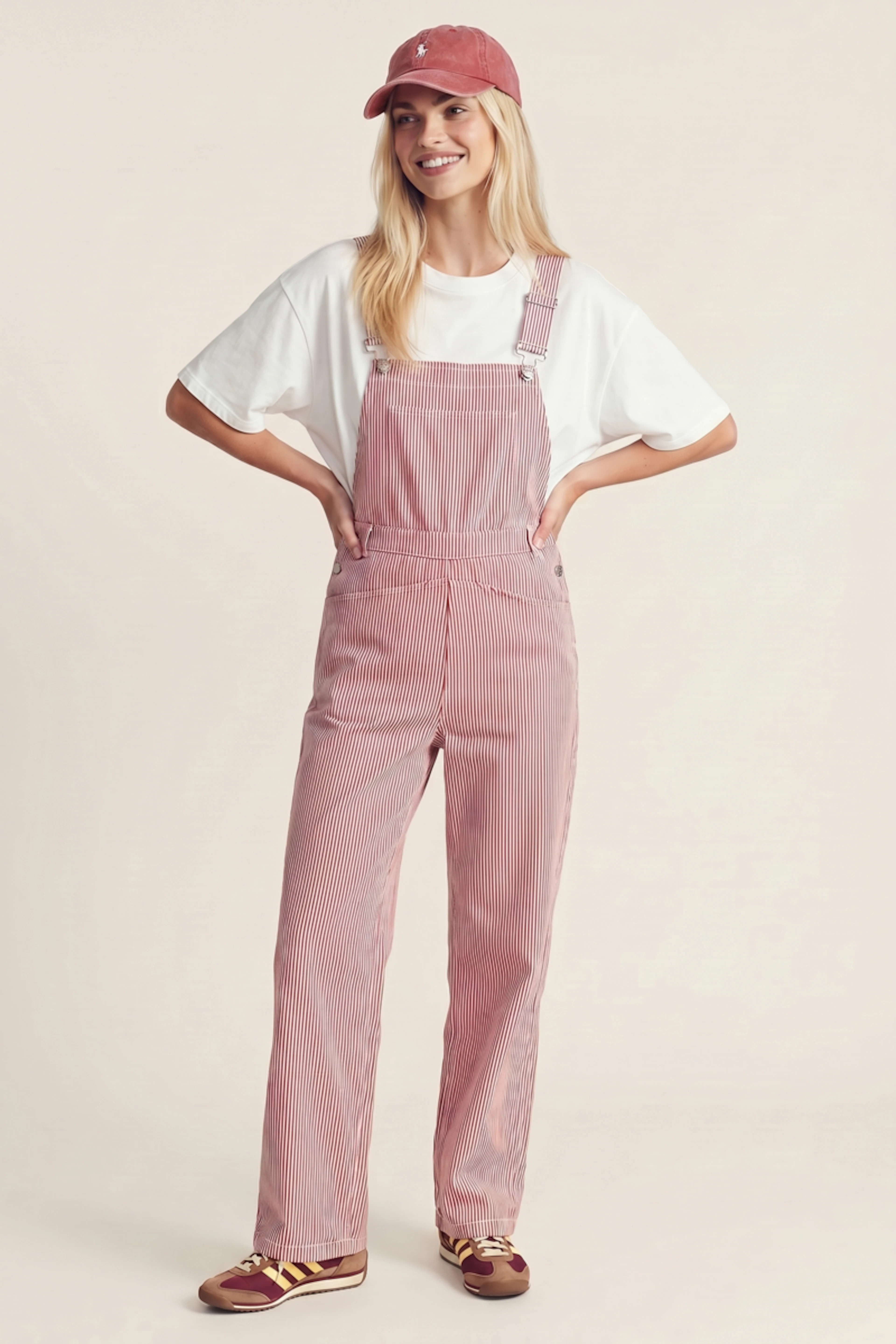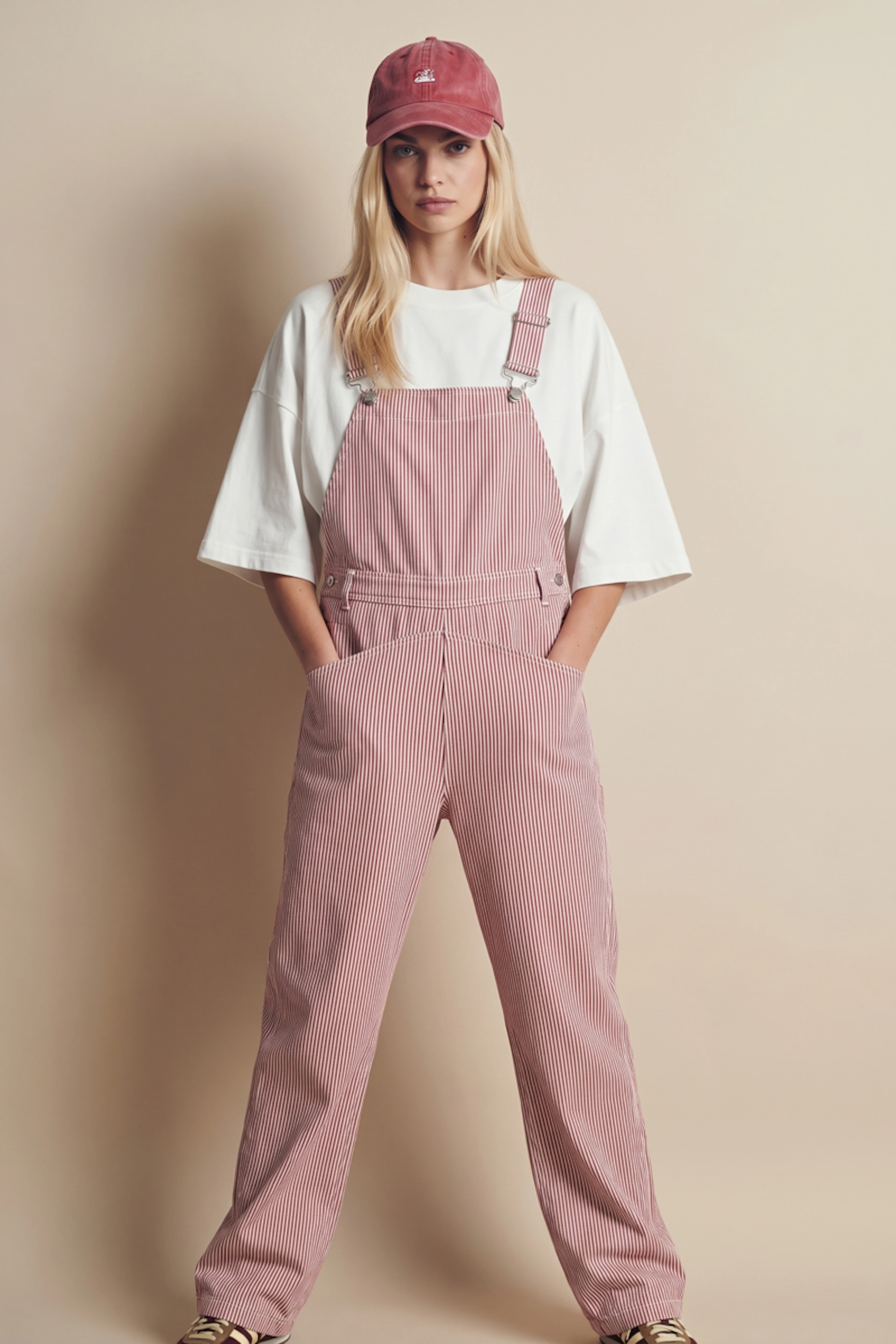 Ajoutez une touche de fraîcheur à votre look avec un t-shirt basique et des baskets blanches. Idéal pour les journées ensoleillées d'été. • Salopette en coton • Coupe large • Bretelles ajustables • Rayures discrètes • Poche poitrine pratique