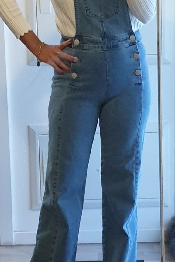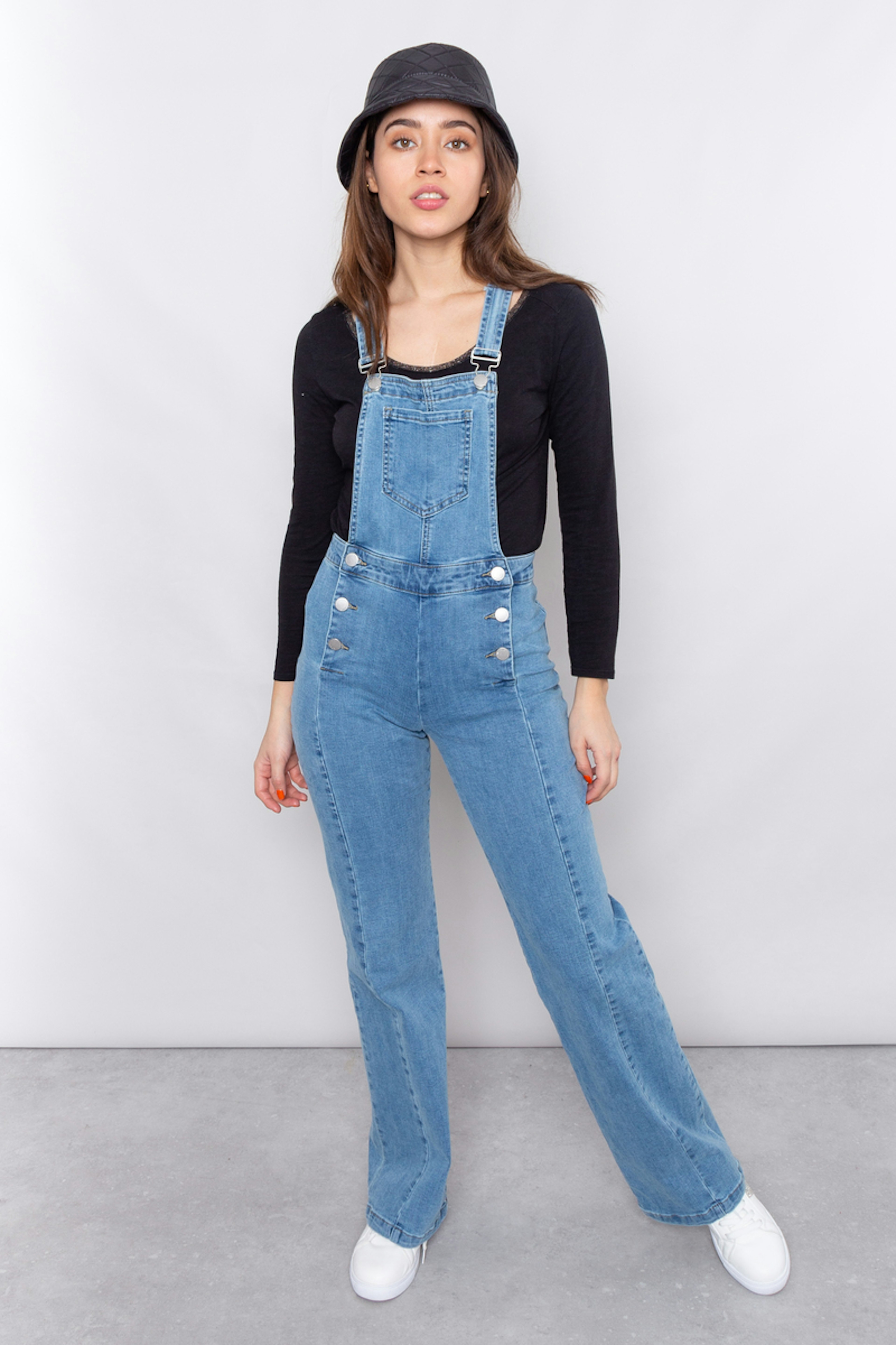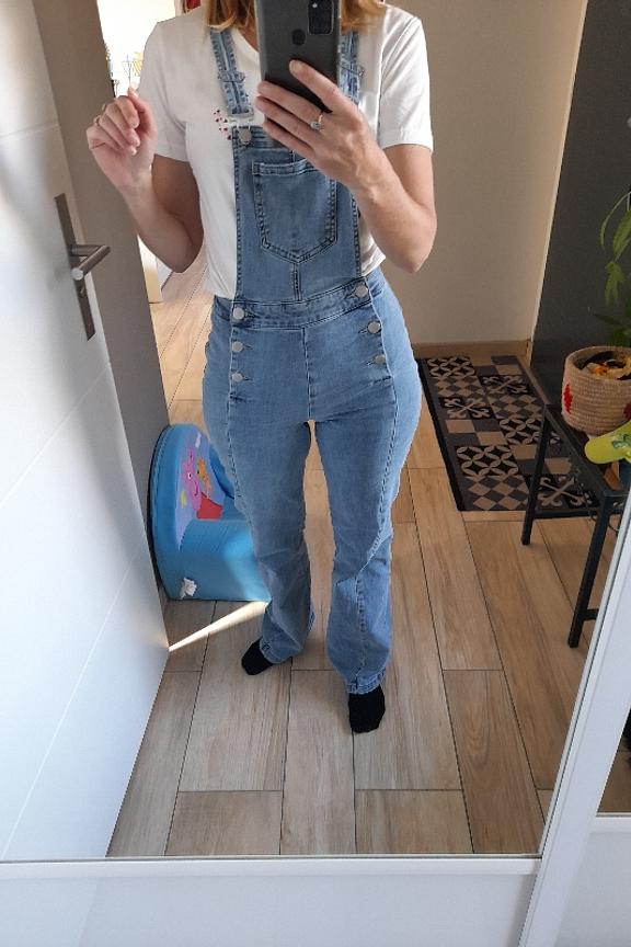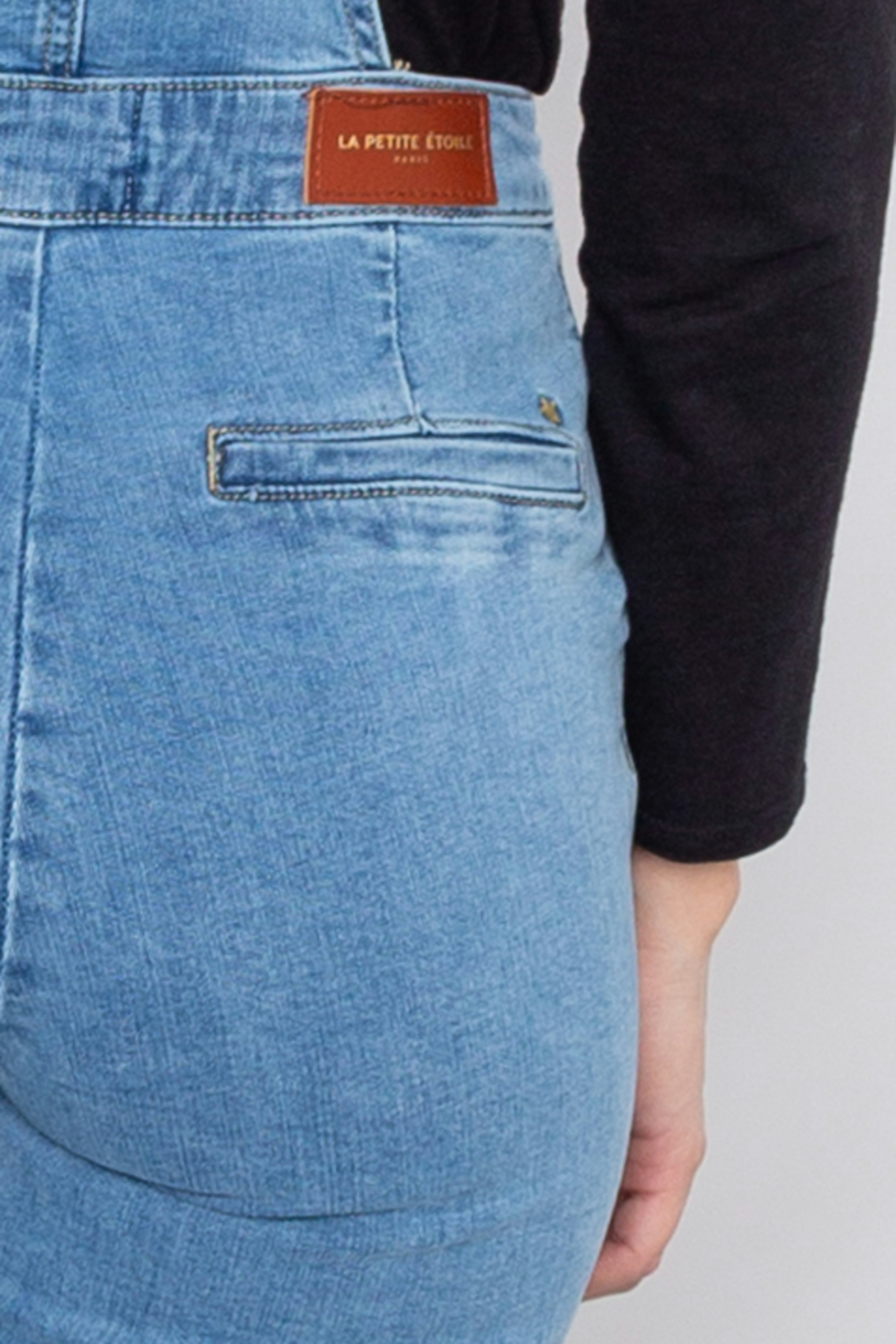โข Salopette en jean bleu โข Poche plaquรฉe sur le devant โข Bretelles rรฉglables โข Pantalon ร ponts et jambe รฉvasรฉe