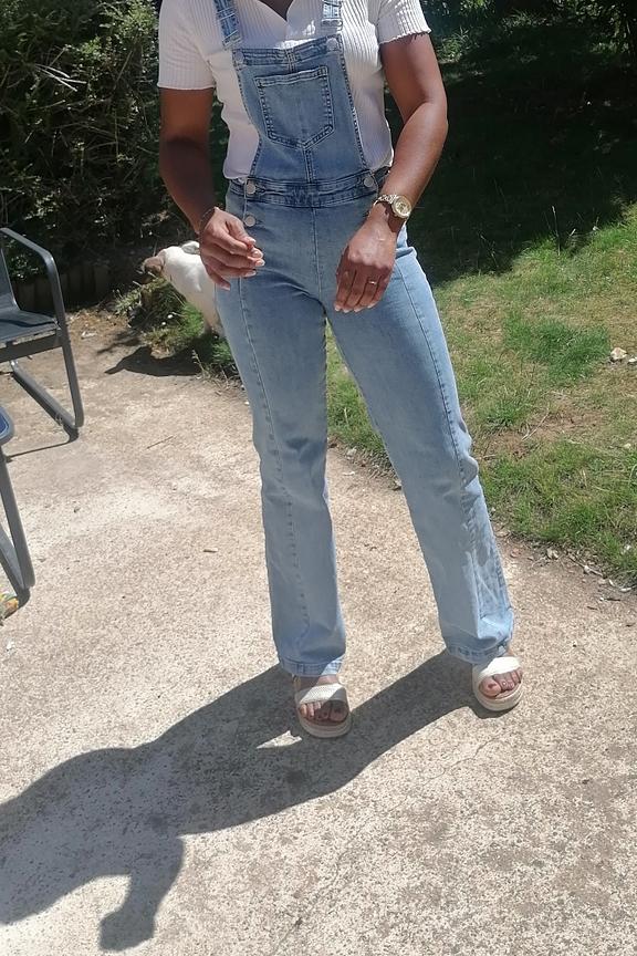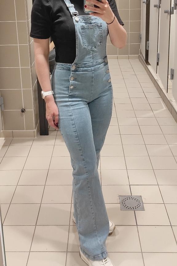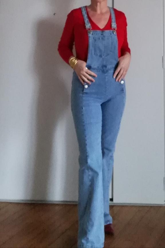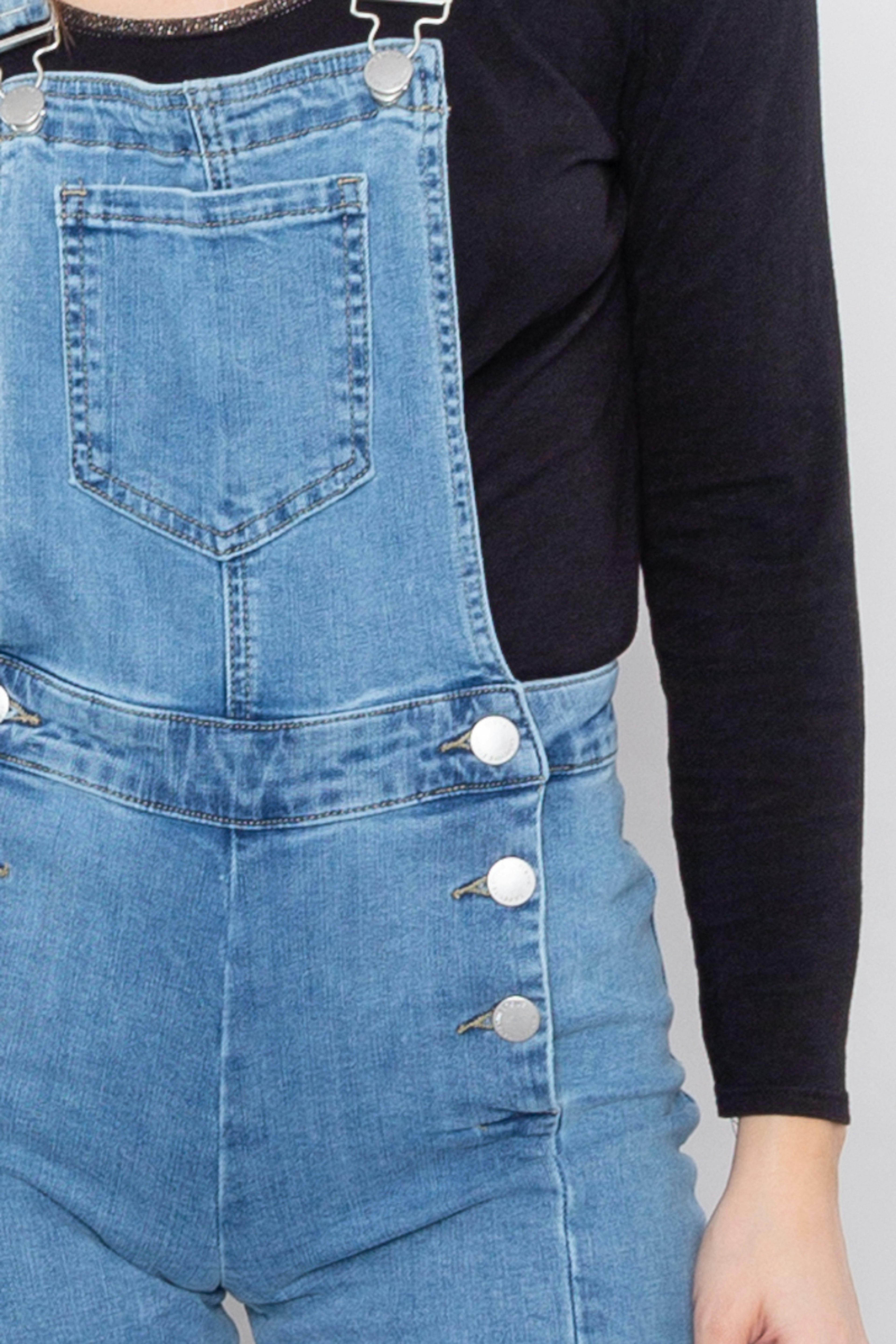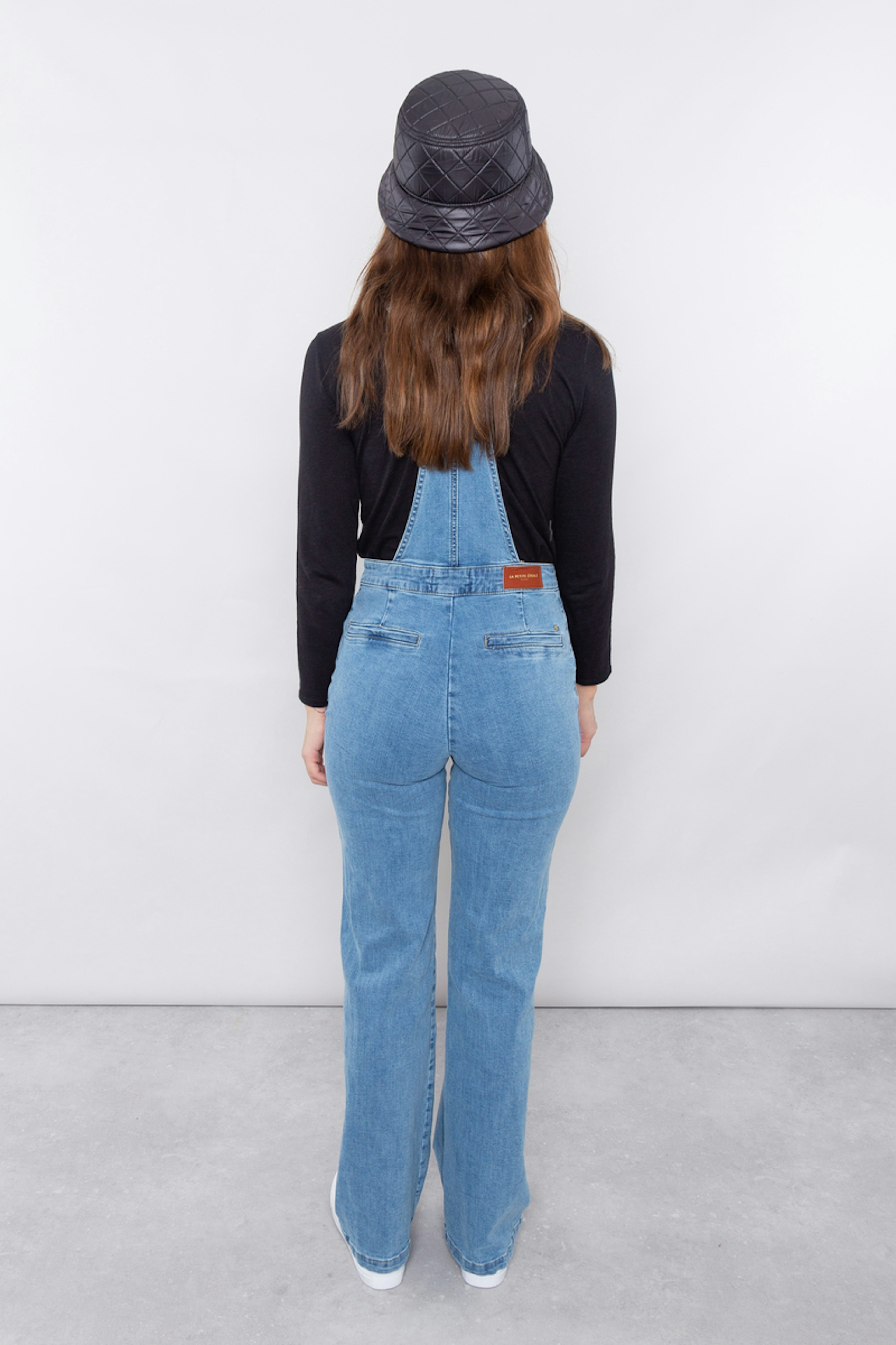 โข Salopette en jean bleu โข Poche plaquรฉe sur le devant โข Bretelles rรฉglables โข Pantalon ร ponts et jambe รฉvasรฉe