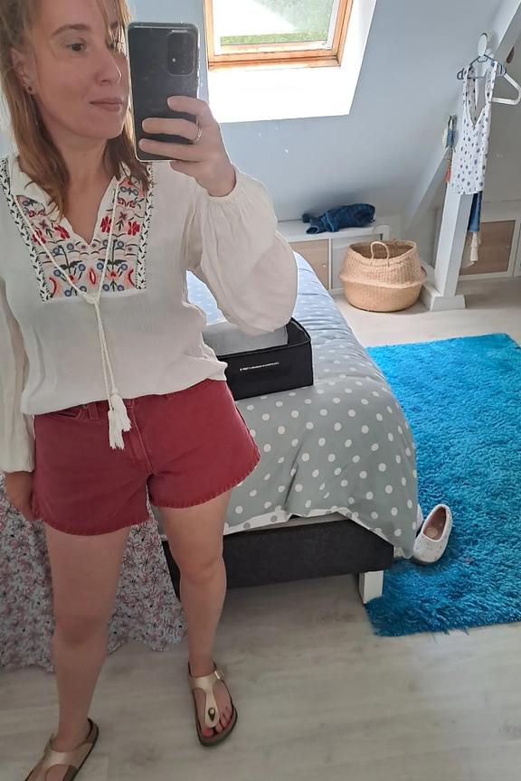 โUn peu grand au niveau de la taille, avec une ceinture, cetait mieux. Le rouge est moins vif en vrai.โ