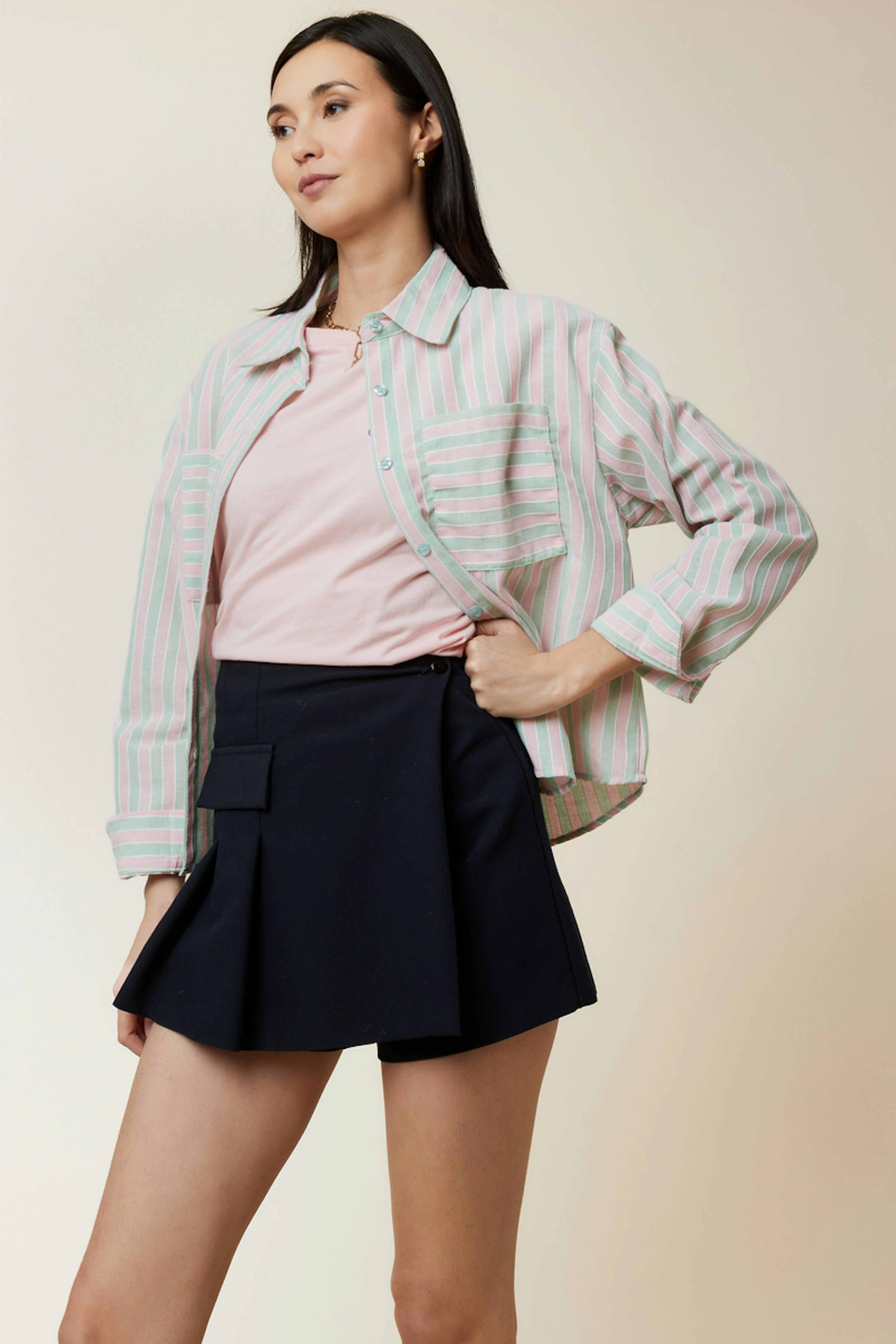 Pour un look chic et décontracté, associez ce short bleu avec une chemise blanche en coton et un blazer à carreaux. Ajoutez des bottines en cuir pour une touche d'élégance. Idéal pour les journées hivernales. • Coupe asymétrique • Poche plaquée sur le devant • Fermeture par bouton doré • Découpe plissée sur le côté