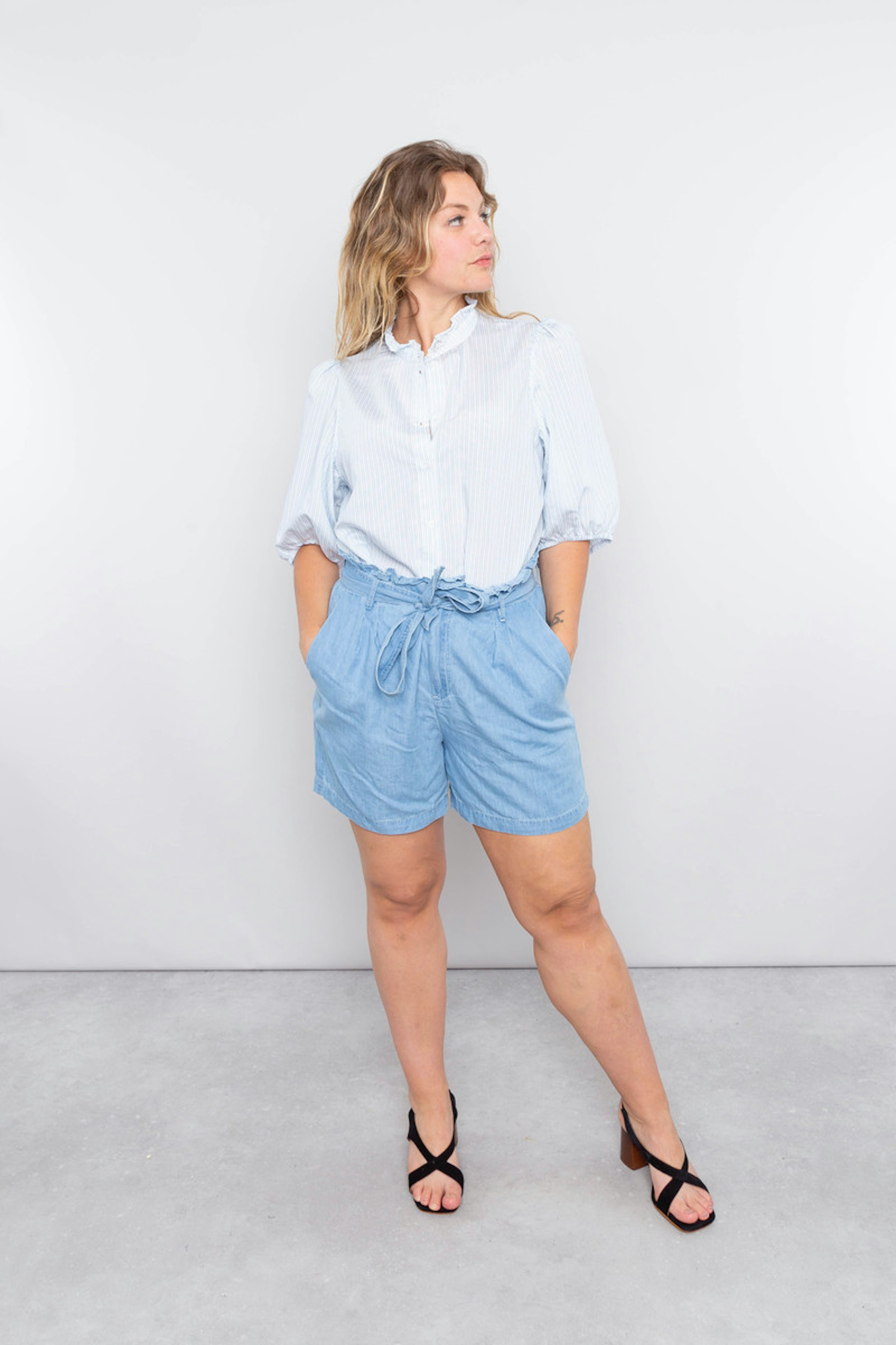 โข Short en denim bleu clair โข Forme paperbag โข Taille haute avec ceinture โข Ceinture avec passants