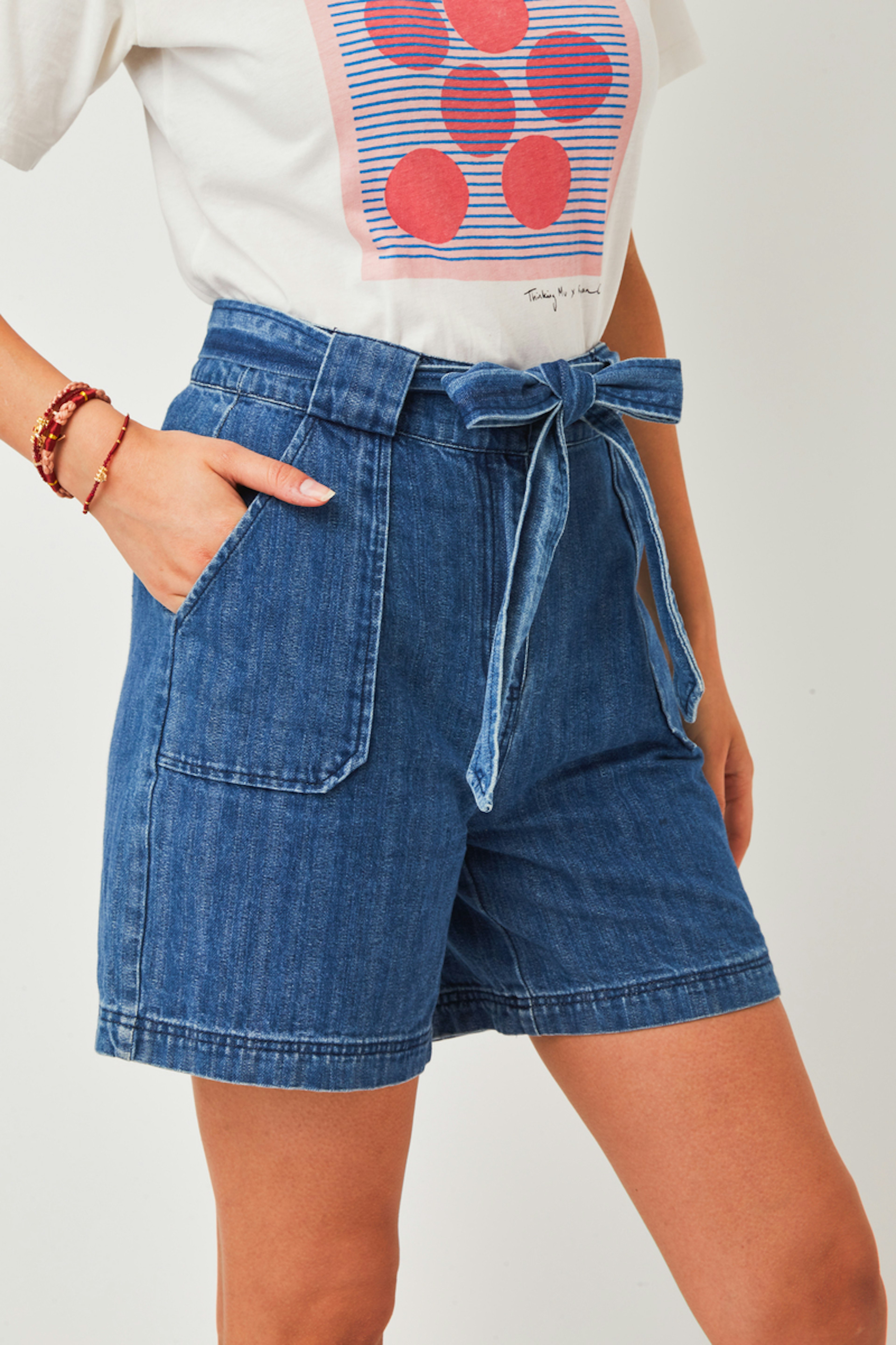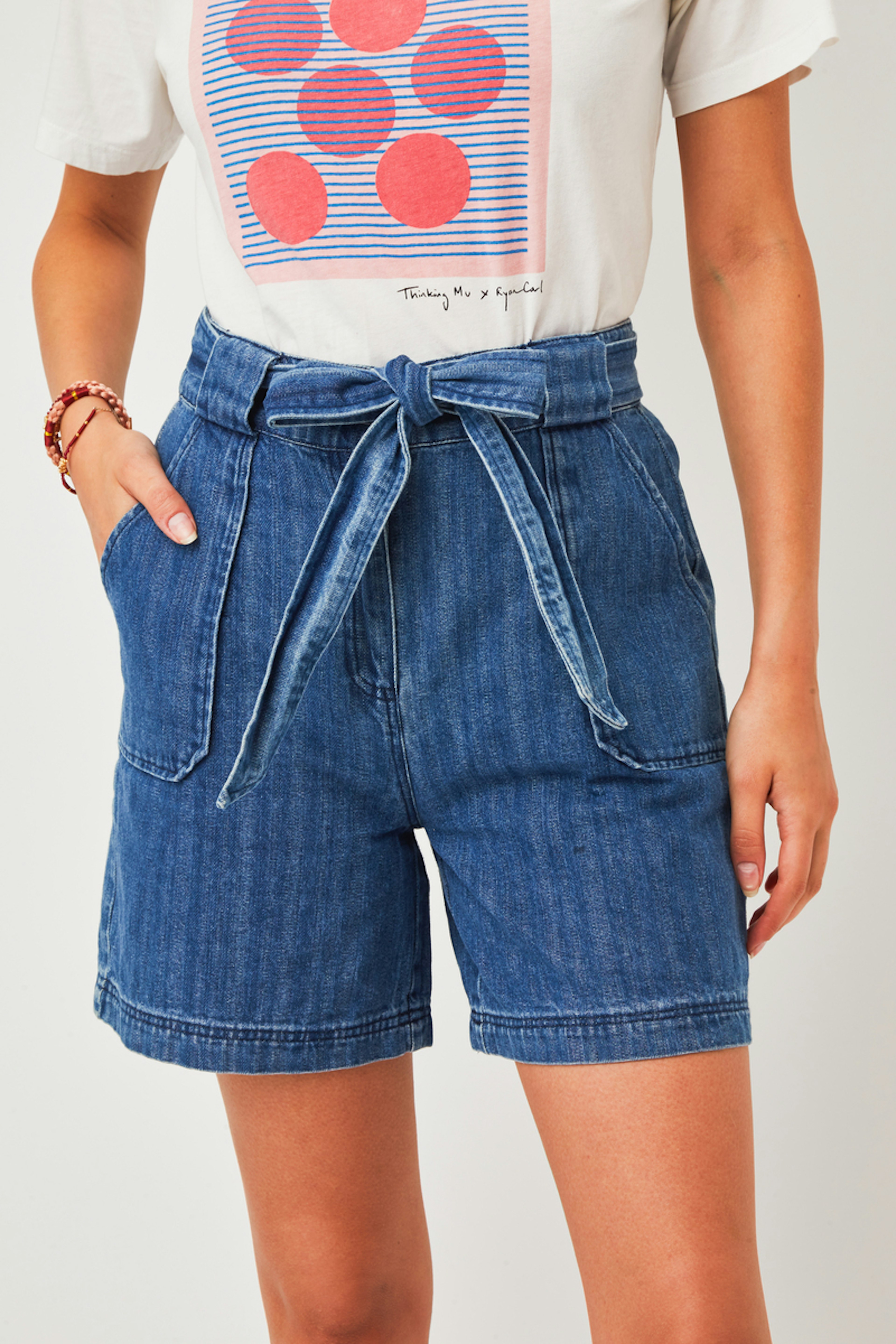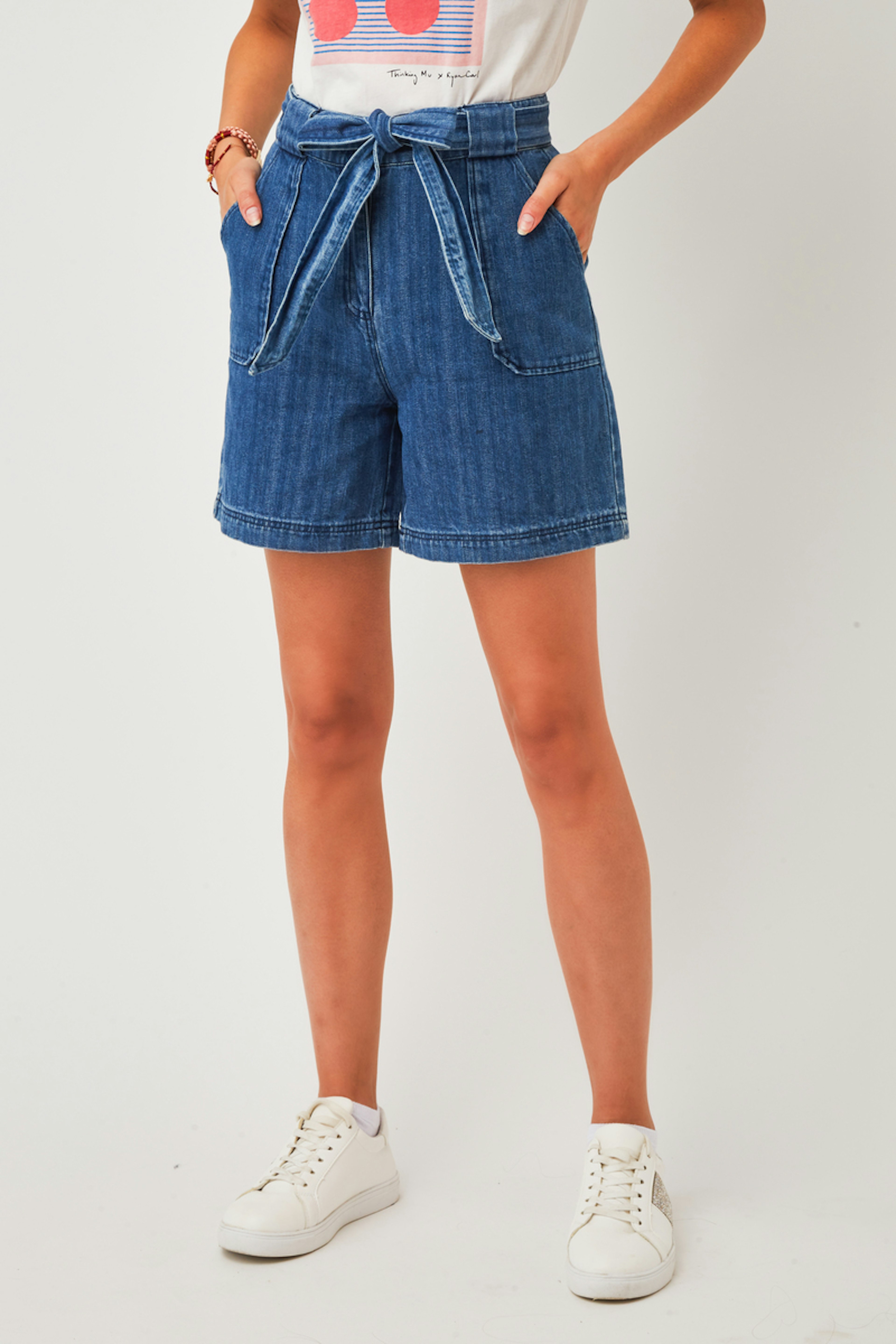 โข Short en denim taille mi-haute avec deux grandes poches plaquรฉes โข Passants et ceinture ร nouer dans la mรชme matiรจre โข Surpiqรปres sur le bas du short โข Modรจle confectionnรฉ dans un tissu 100% coton biologique