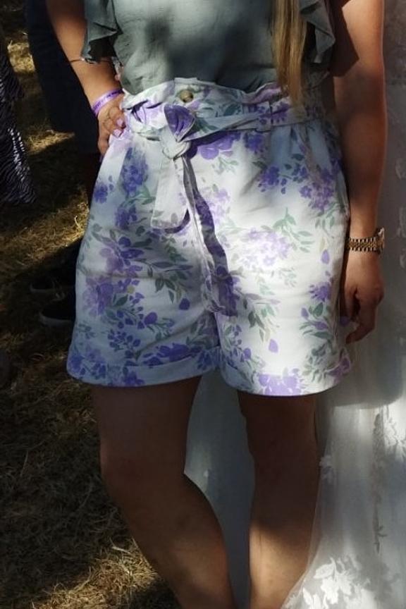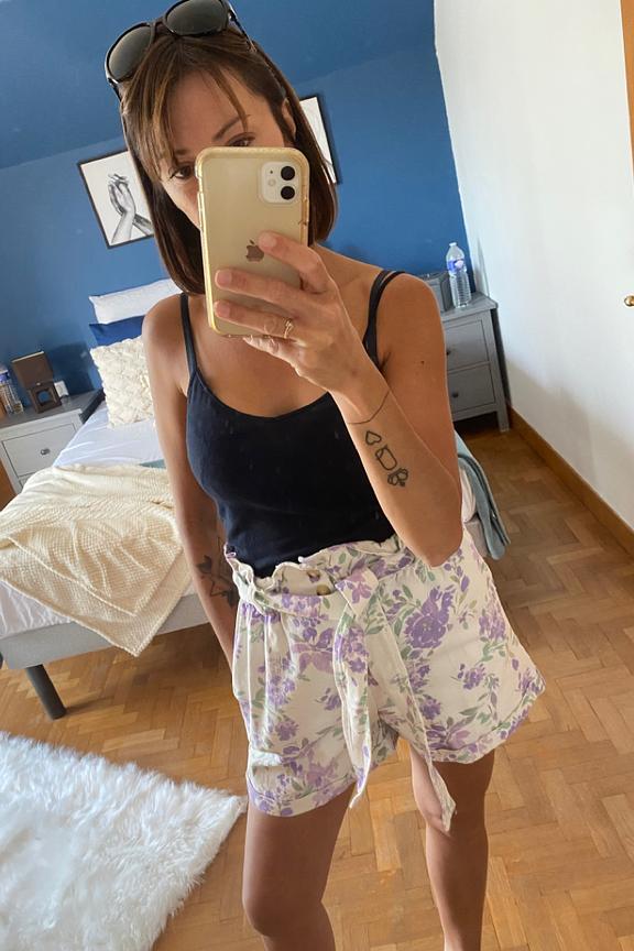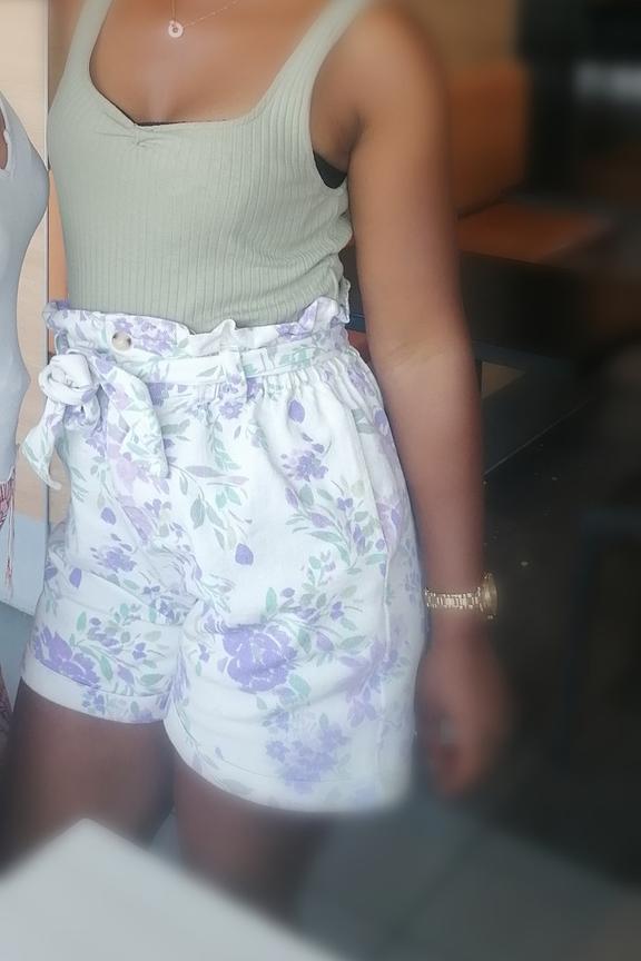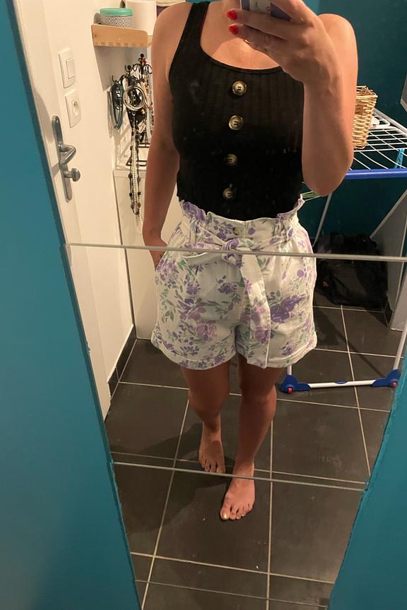 โข Short paperbag taille mi-haute โข Imprimรฉ fleuri violet sur fond blanc โข Patte de boutonnage sur le devant โข Taille รฉlastiquรฉe avec ceinture de tissu ร nouer