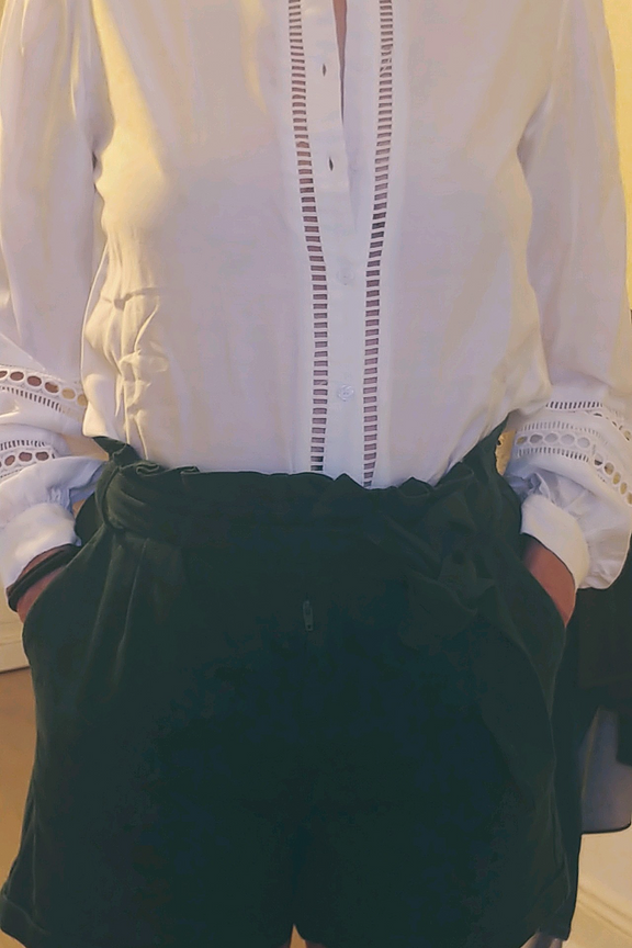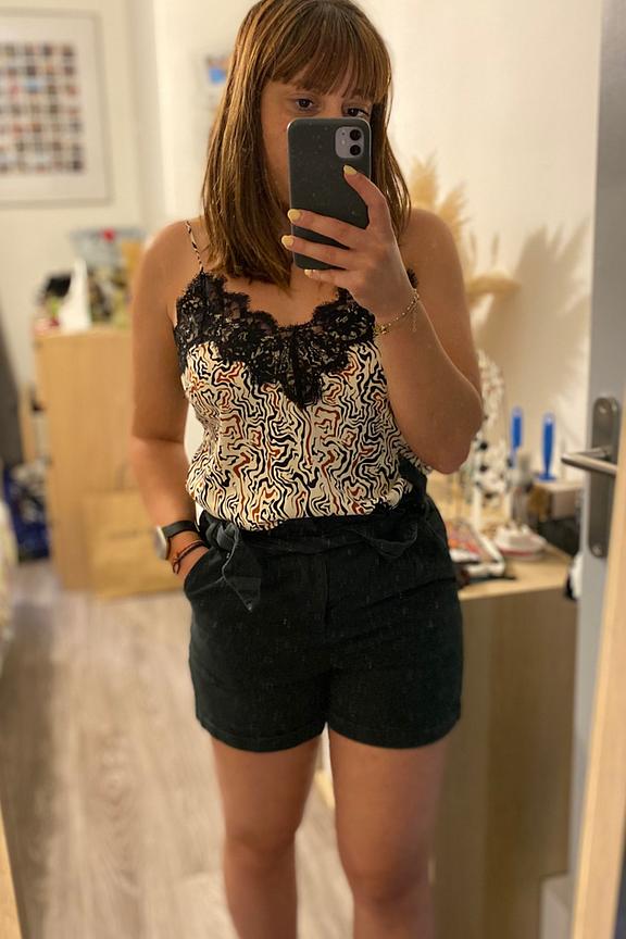 - Short Kaki taille haute - Passants pour ceinture - Ceinture amovible ร nouer - 2 poches coupรฉes ร l'avant - Fermeture zippรฉ et un bouton Le mannequin mesure 178 cm et porte une taille 36
