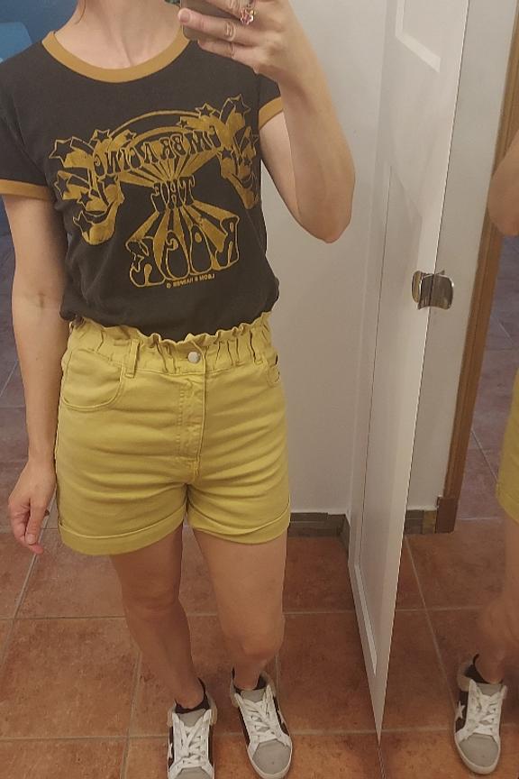 โJโai essayรฉ dโabord en 38 qui est ma taille, mais finalement une taille en-dessous va mieux. Ceinture รฉlastique, taille haute, belle couleur moutarde. Bonne longueur, je le garde !โ