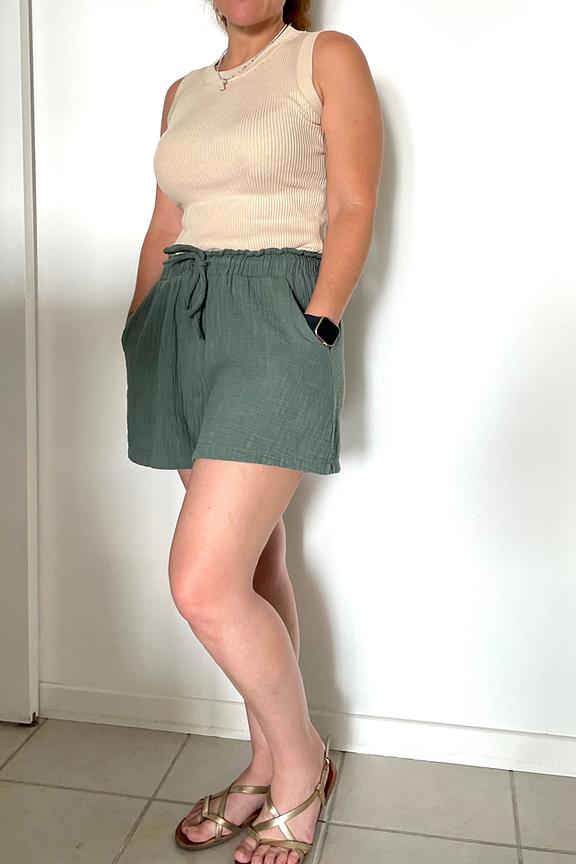 โข Short kiwi โข Short large ร taille haute รฉlastiquรฉe et cordon โข Dรฉtail de volants ร la ligne de taille โข Poches italiennes