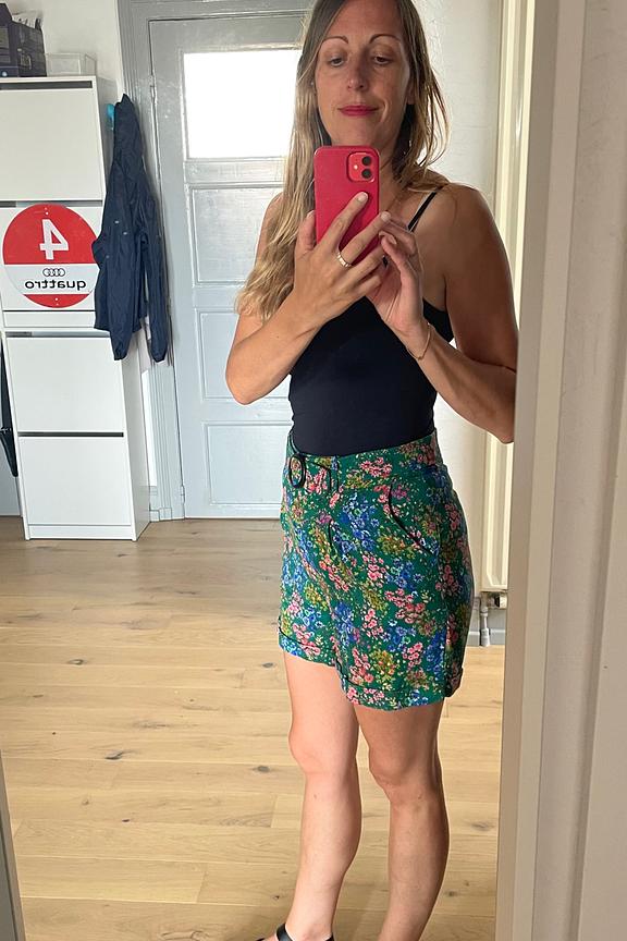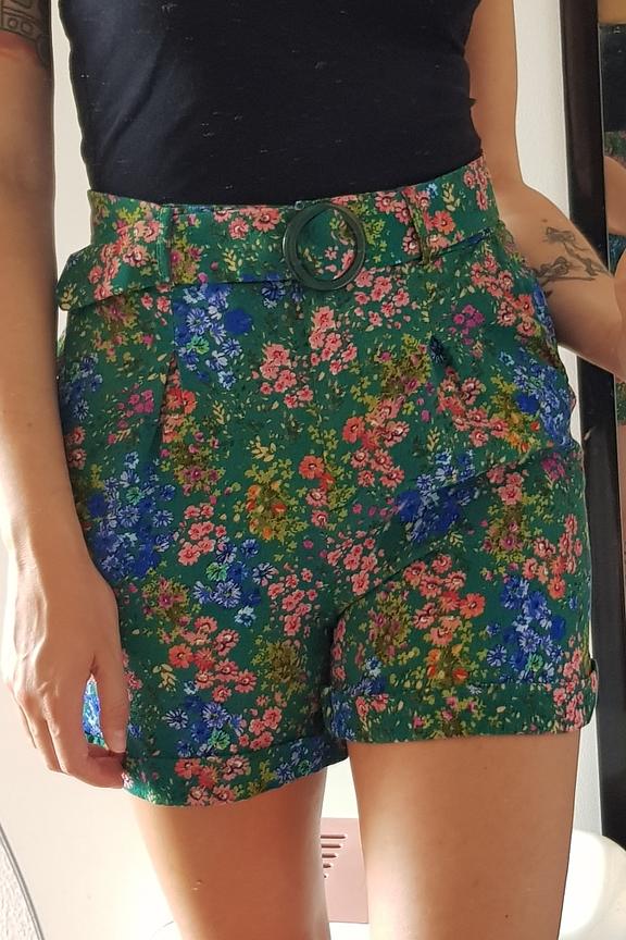 โข Short vert imprimรฉ fleuri โข Forme paperbag โข Braguette zippรฉe โข Ceinture en tissu ton sur ton