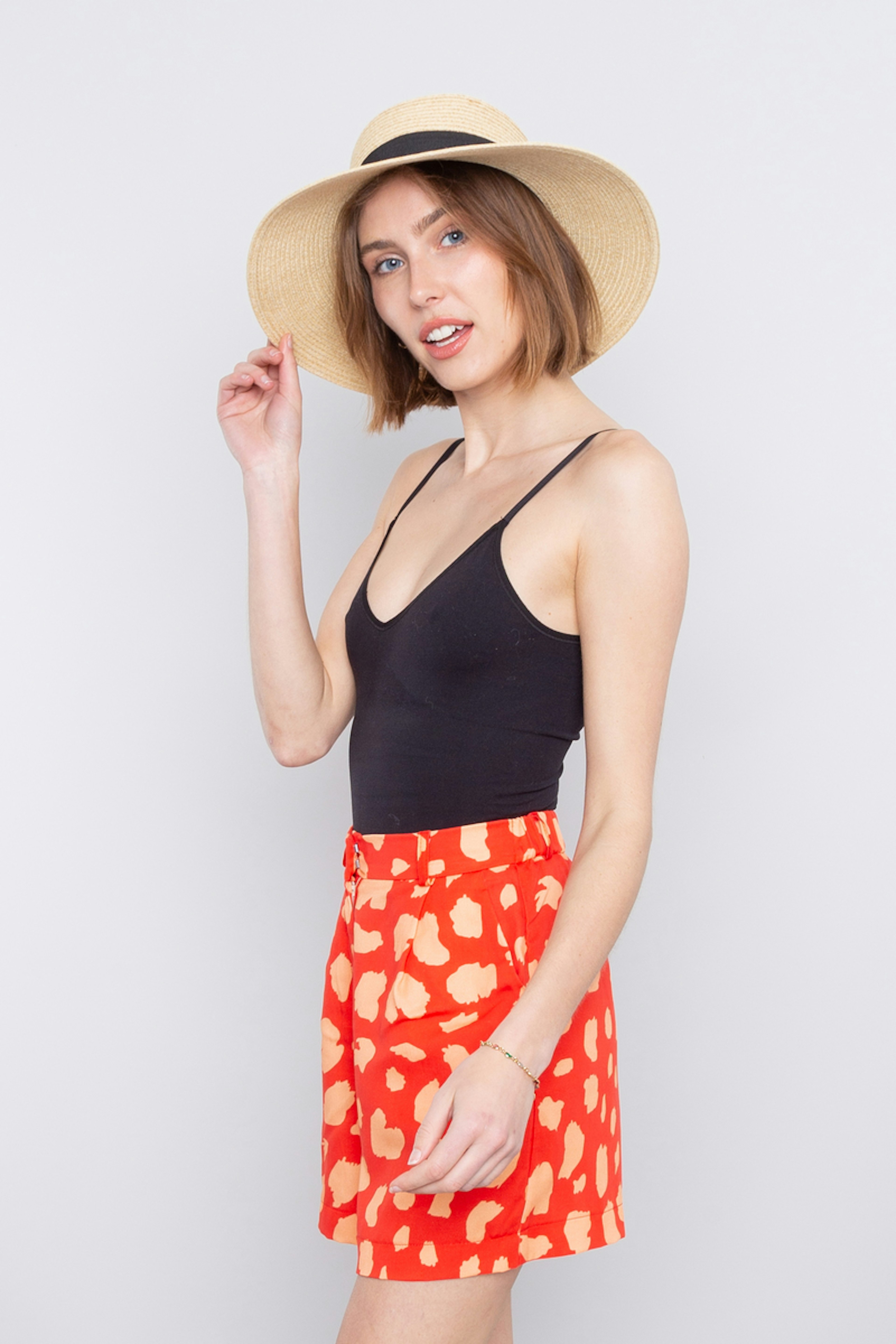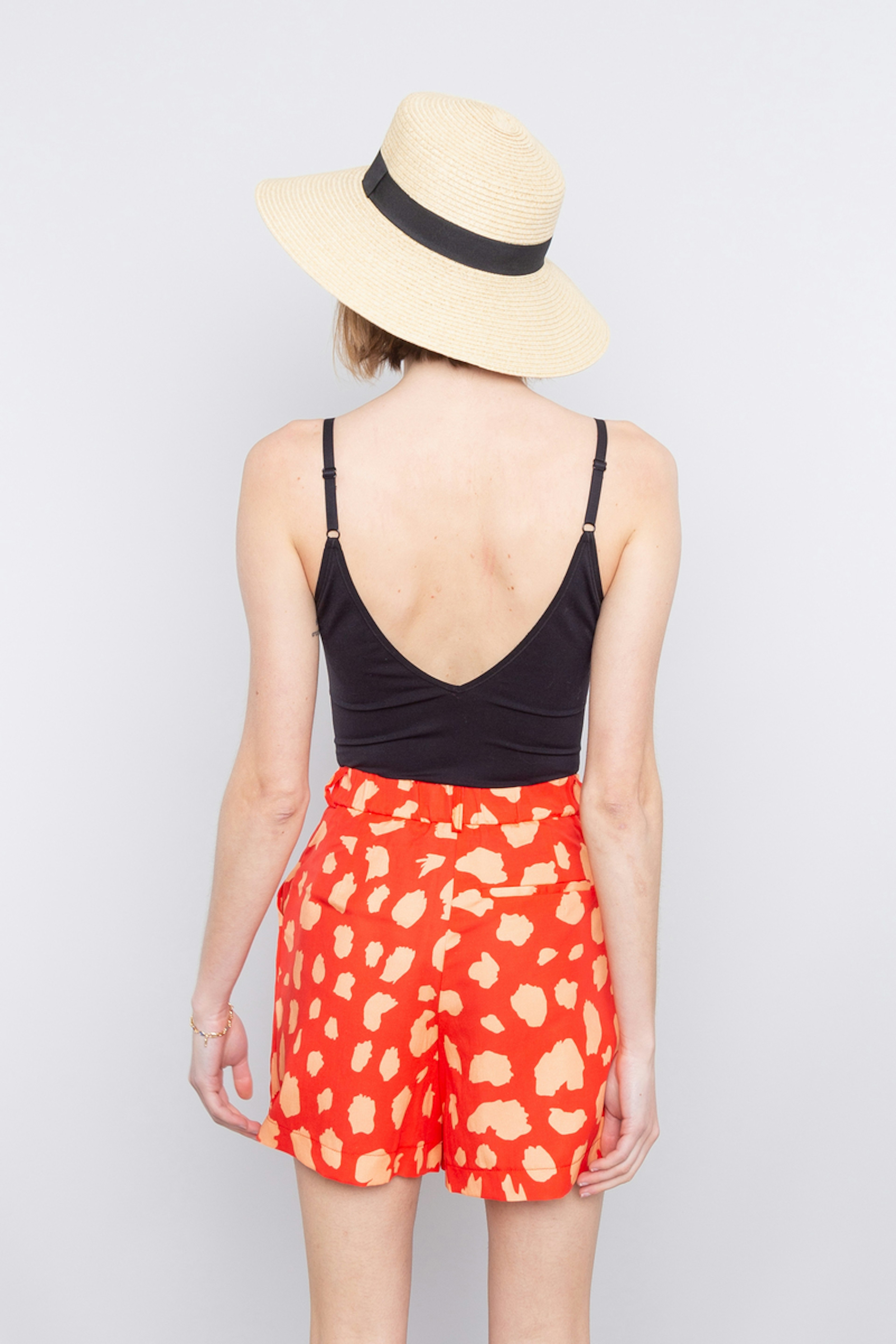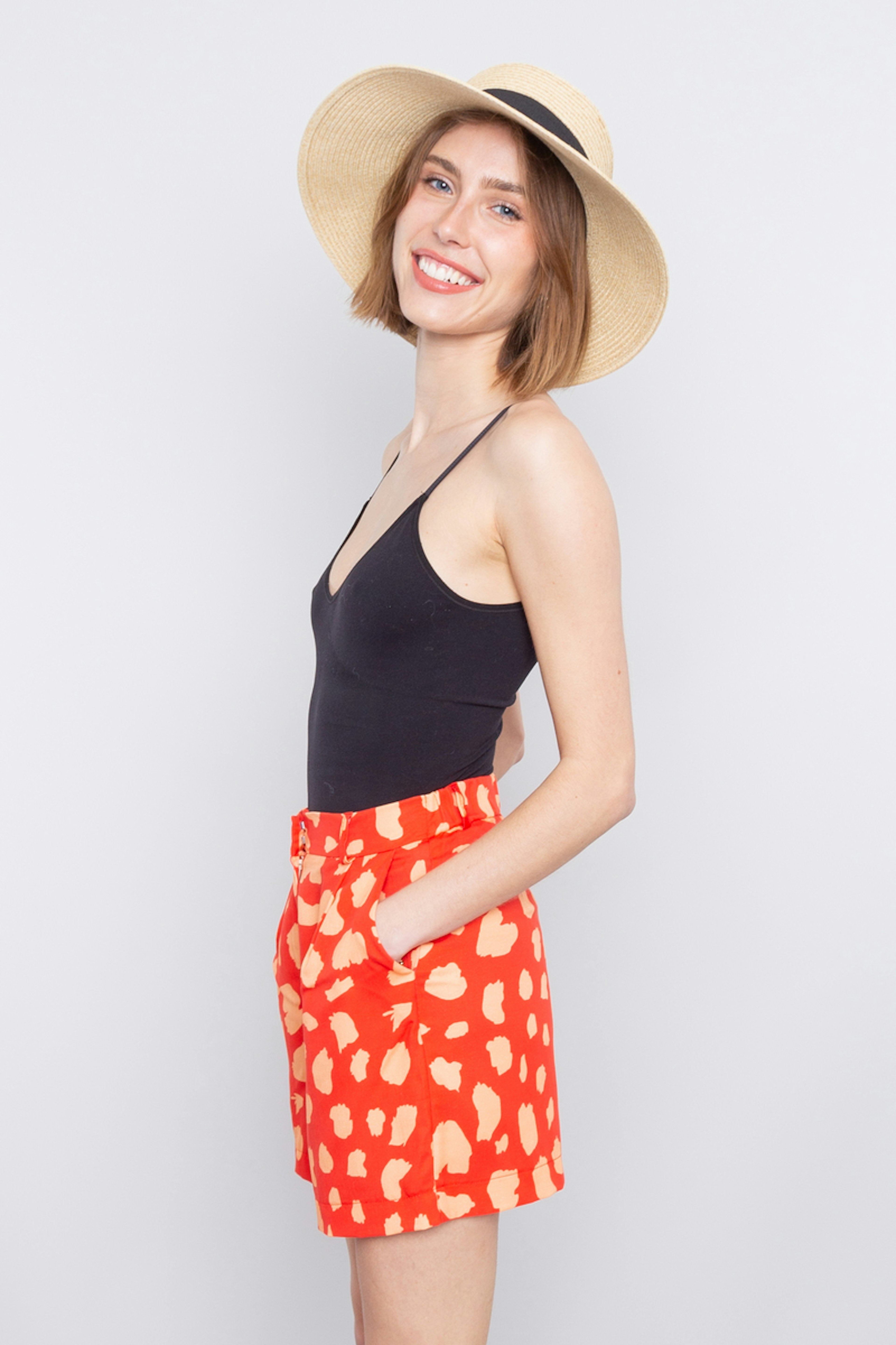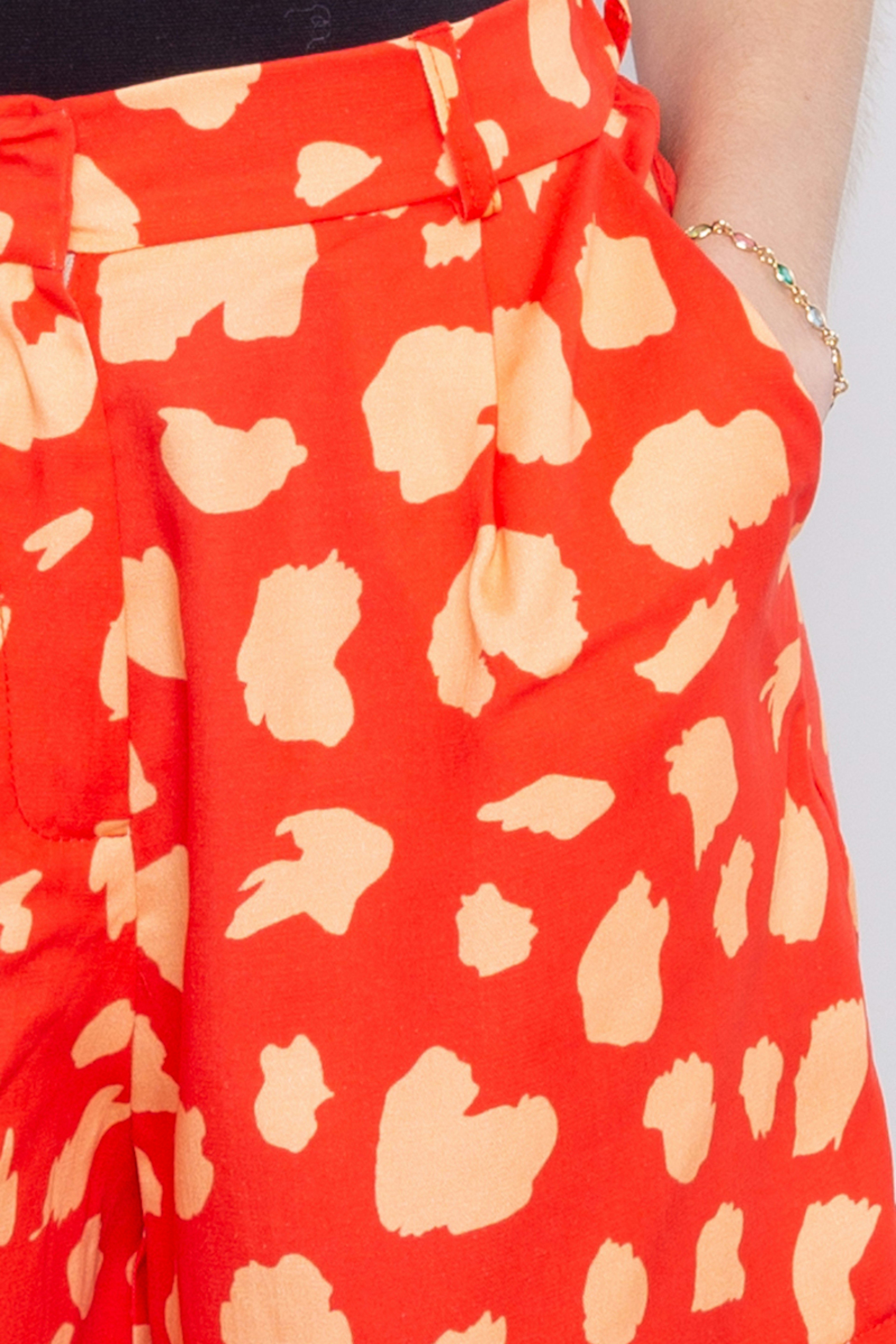 โข Short court imprimรฉ orange et rose โข Taille haute โข Passants pour une ceinture โข Ceinture dos รฉlastiquรฉe โข Deux pinces ร l'avant pour un beau volume โข Fabriquรฉ en Europe
