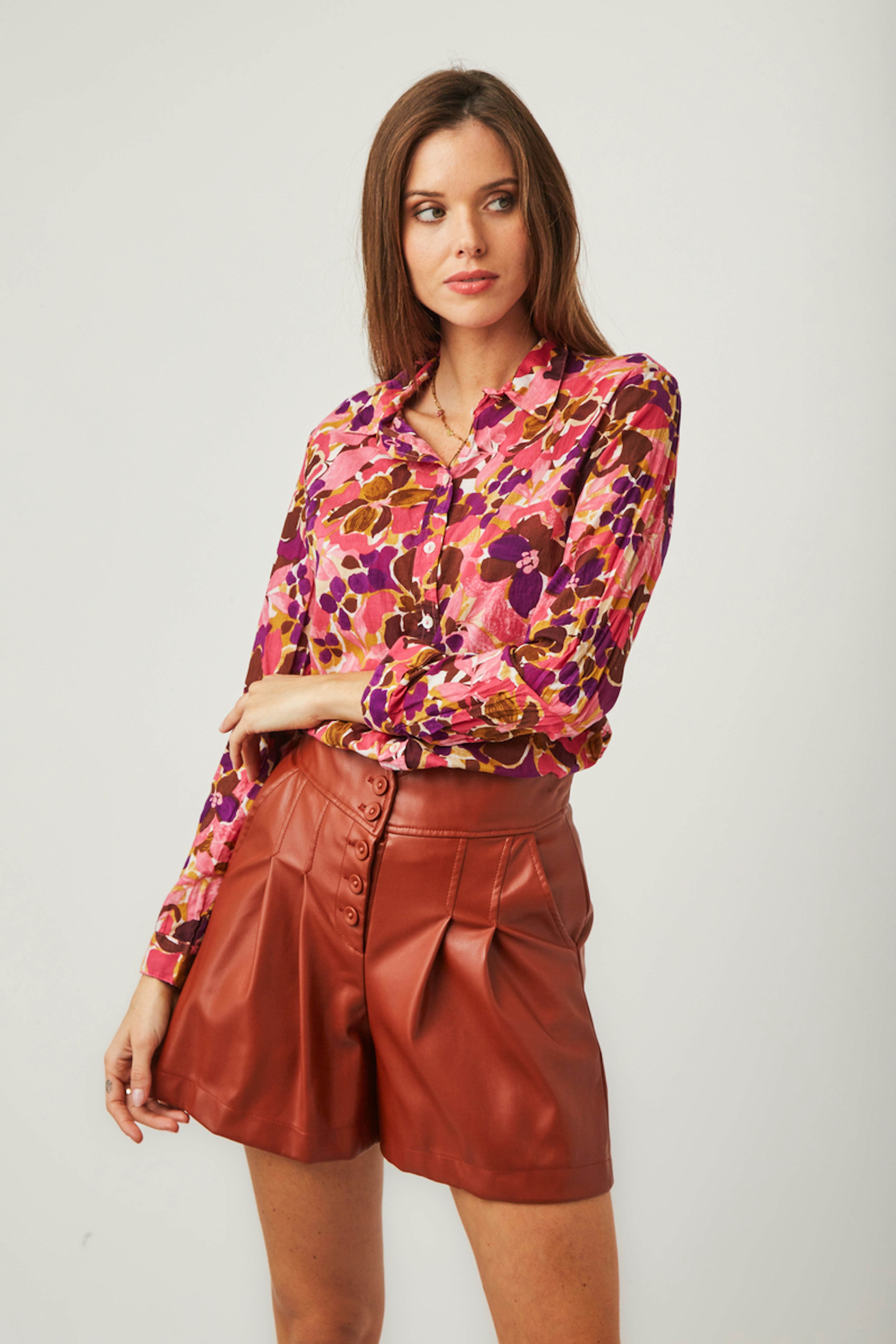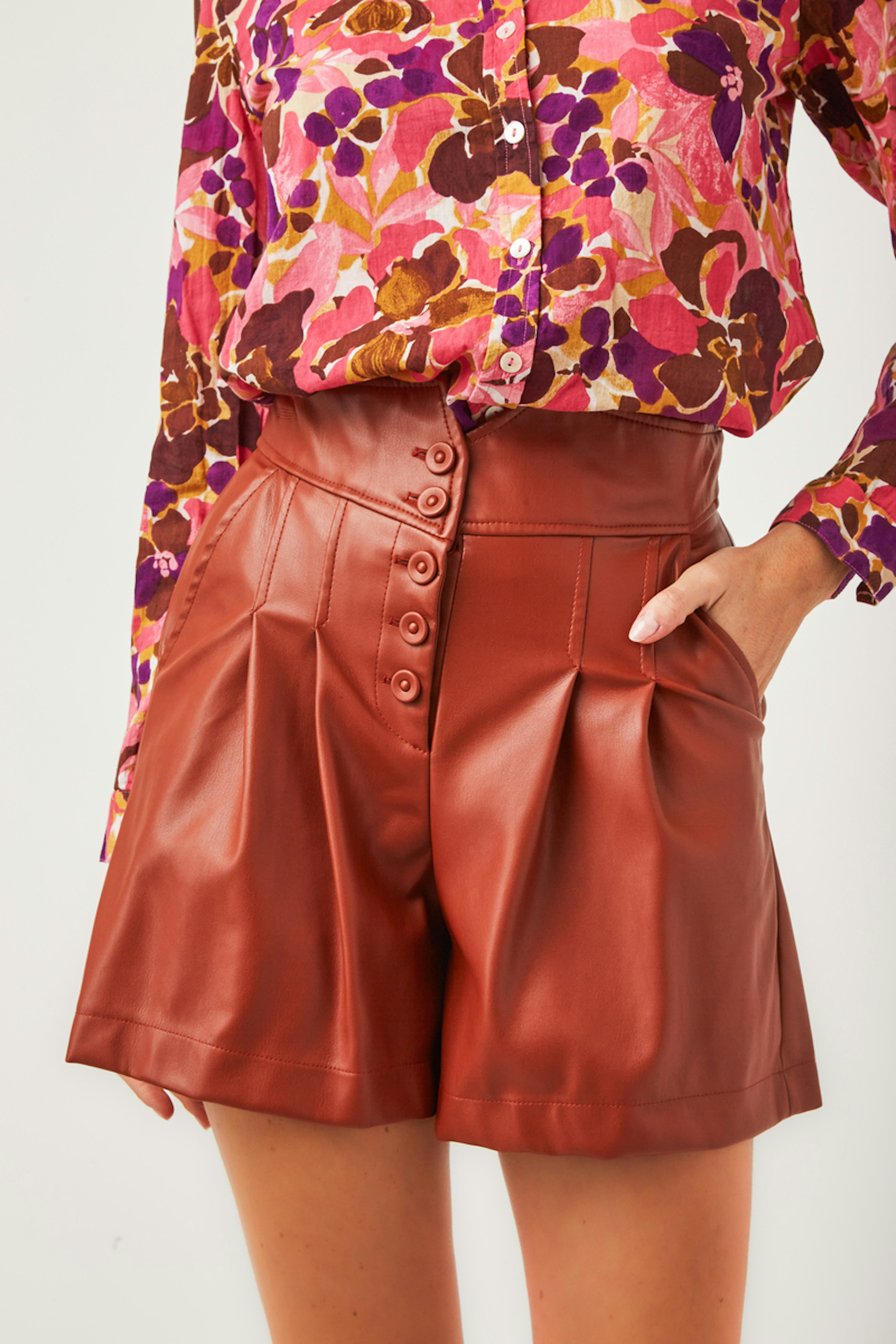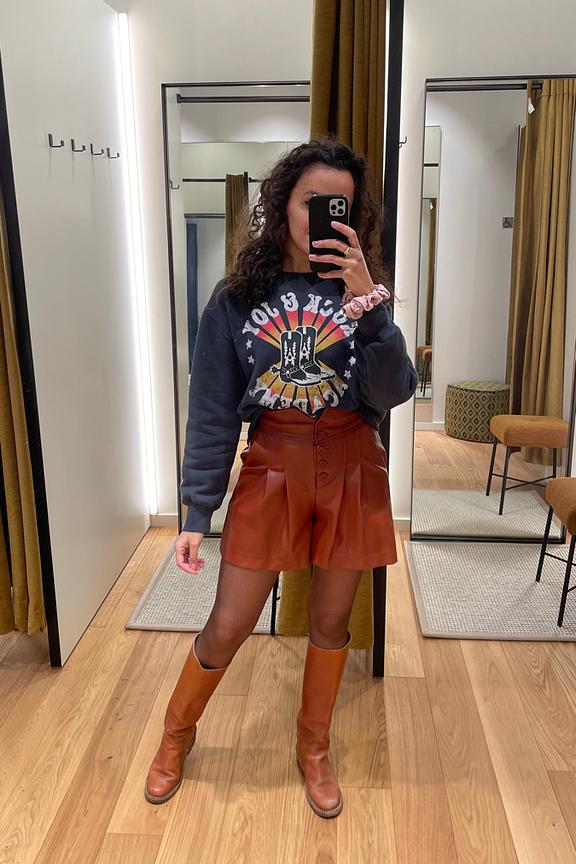 Le short en simili cuir : un must-have de la garde-robe ! Ce short taille haute allonge et met en valeur vos gambettes. Sa coupe รฉvasรฉe le rend si confortable, on adore ! โข Short en simili cuir camel fermรฉ par 5 boutons โข Taille haute โข 2 poches latรฉrales โข Longueur mi longue โข On aime le porter avec : Une blouse pour une allure bohรจme, un pull pour une touche cosy, un tee-shirt pour un style casual.