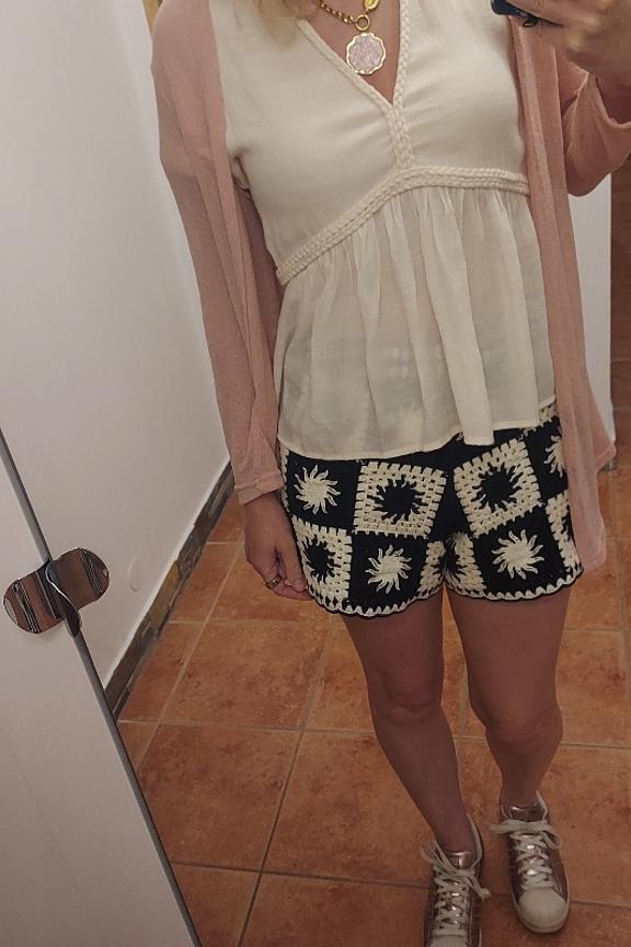 Associez ce short avec un dรฉbardeur blanc et des sandales pour un look estival chic et dรฉcontractรฉ. Parfait pour les journรฉes ensoleillรฉes ! โ€ข Short en coton โ€ข Taille รฉlastique โ€ข Jambe ample โ€ข Motif crochet โ€ข Noir et blanc