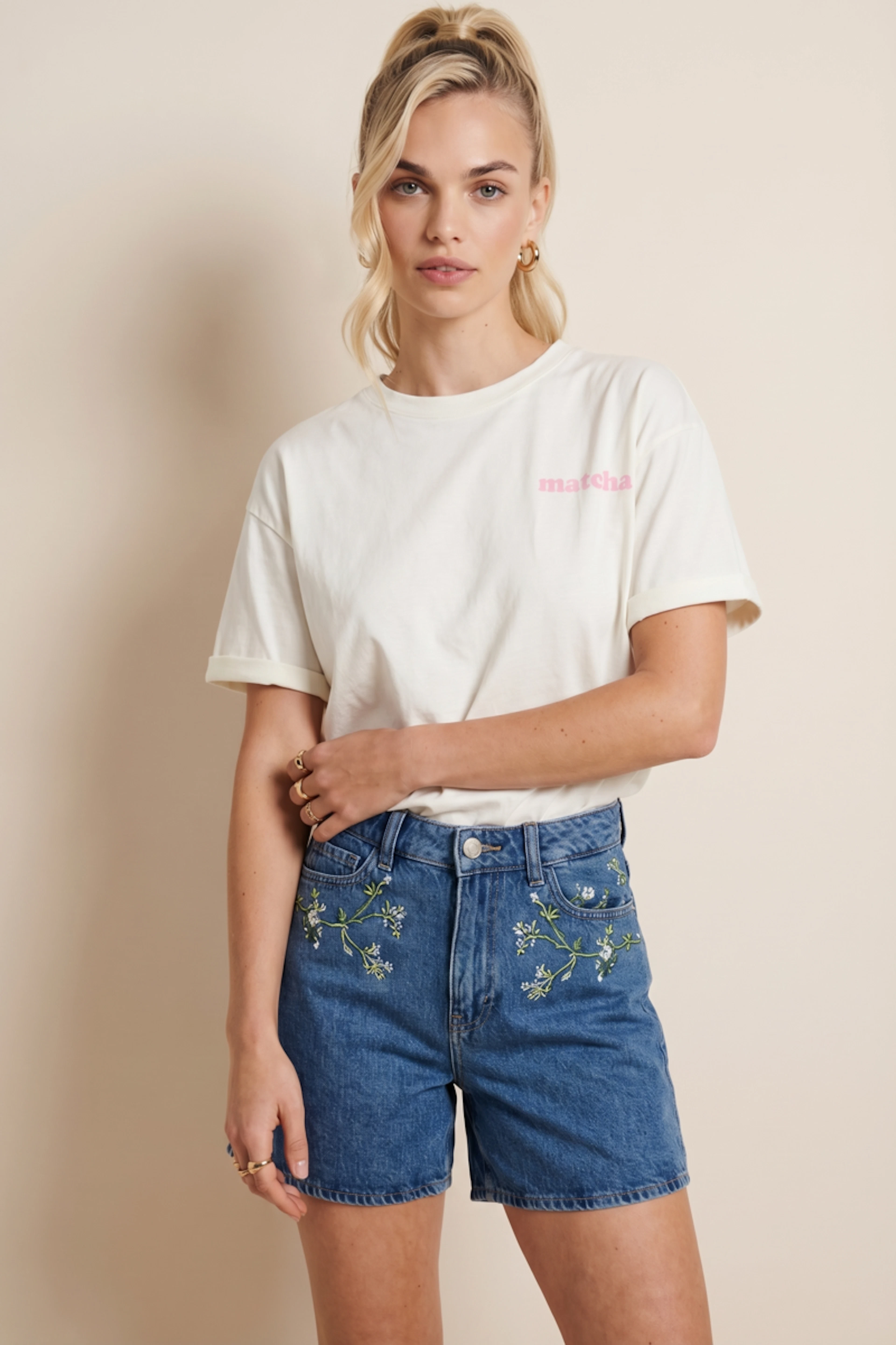Associez ce short en denim à une blouse légère et des sandales pour un look estival parfait. • Short en denim • Taille haute flatteuse • Motif floral brodé • Couple ample et décontractée • Fermeture à zip et bouton