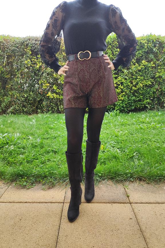 Associez ce short imprimé à une blouse noire et des bottines pour un look chic d'hiver. • Short imprimé • Coupe ajustée • Taille haute • Fermeture zip discrète