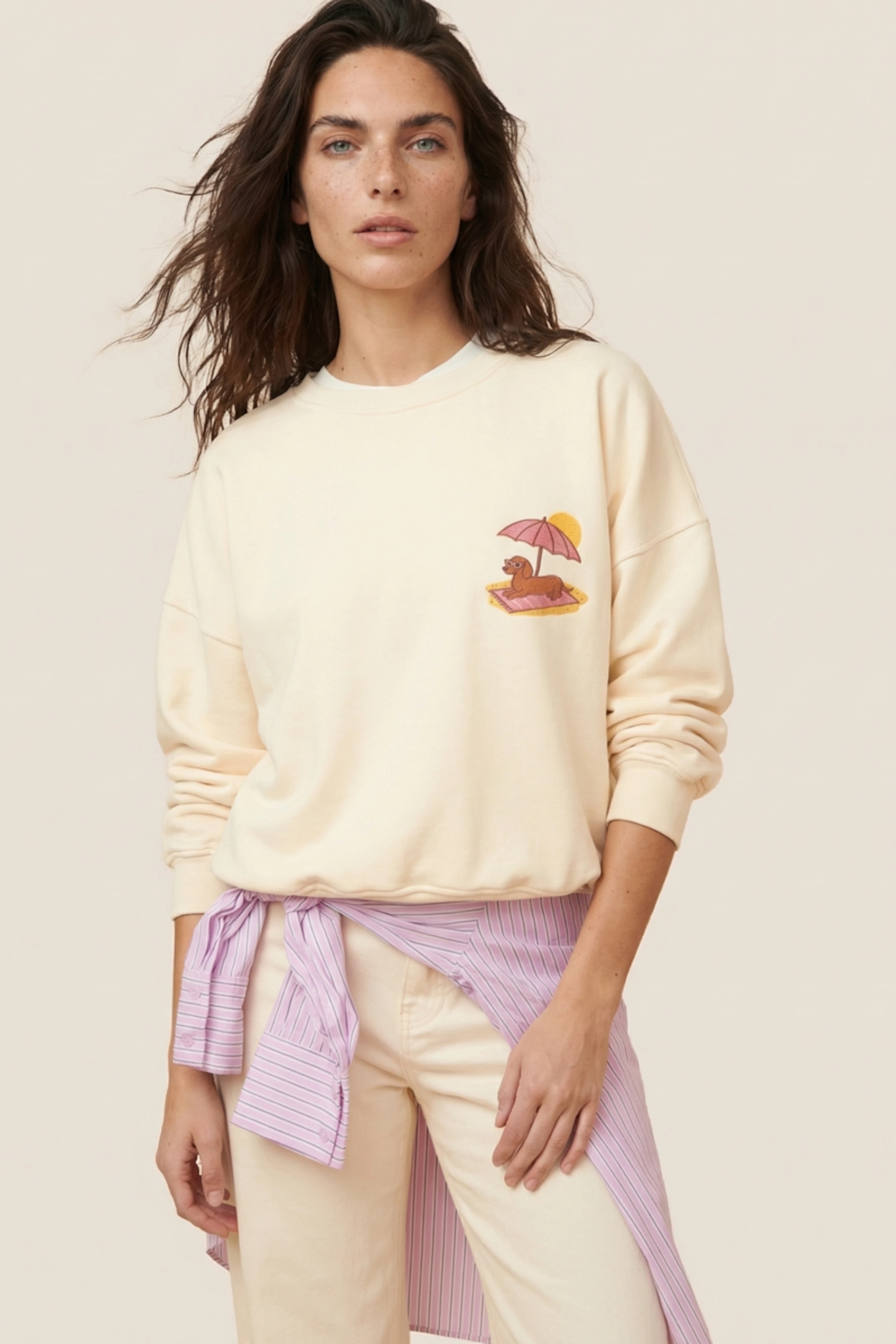 Ce sweat se mariera parfaitement avec un jean mom et des sneakers blanches pour un look décontracté estival. • Sweat coupe droite • Manches longues • Imprimé ludique • Col rond • Poignets côtelés