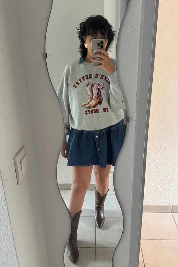Ajoutez une touche de style avec un jean brut et des baskets pour un look décontracté parfait pour la saison hivernale. • Sweat en gris • Coupe tempérée • Col rond • Manches longues • Imprimé boots avec texte ludique