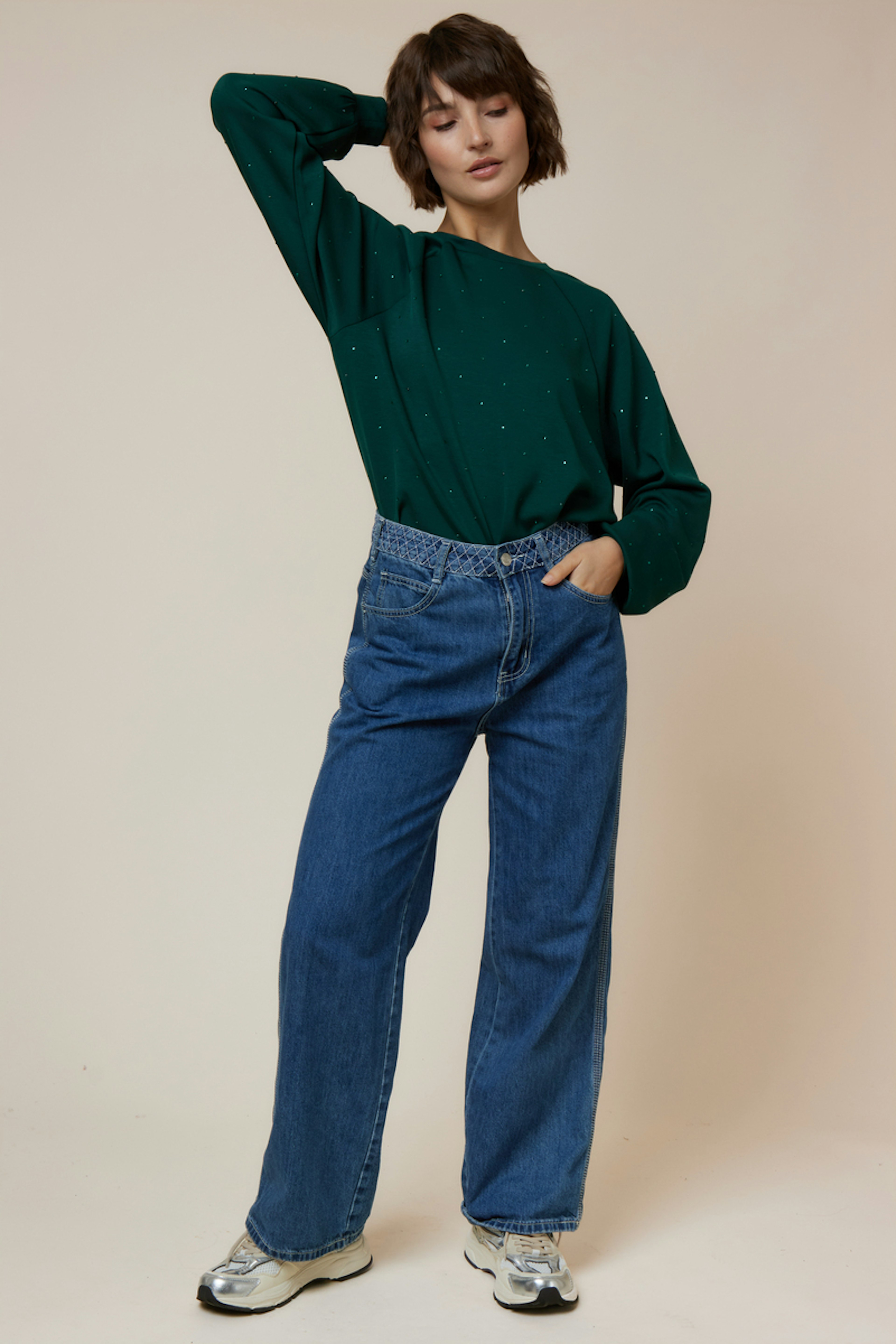 Portez ce sweat avec un jean décontracté ou sous un manteau cocooning. Idéal pour les journées d'hiver avec style. • Sweat à pois discrets • Coupe légèrement ample • Manches longues • Encolure ronde • Détails brillants subtils