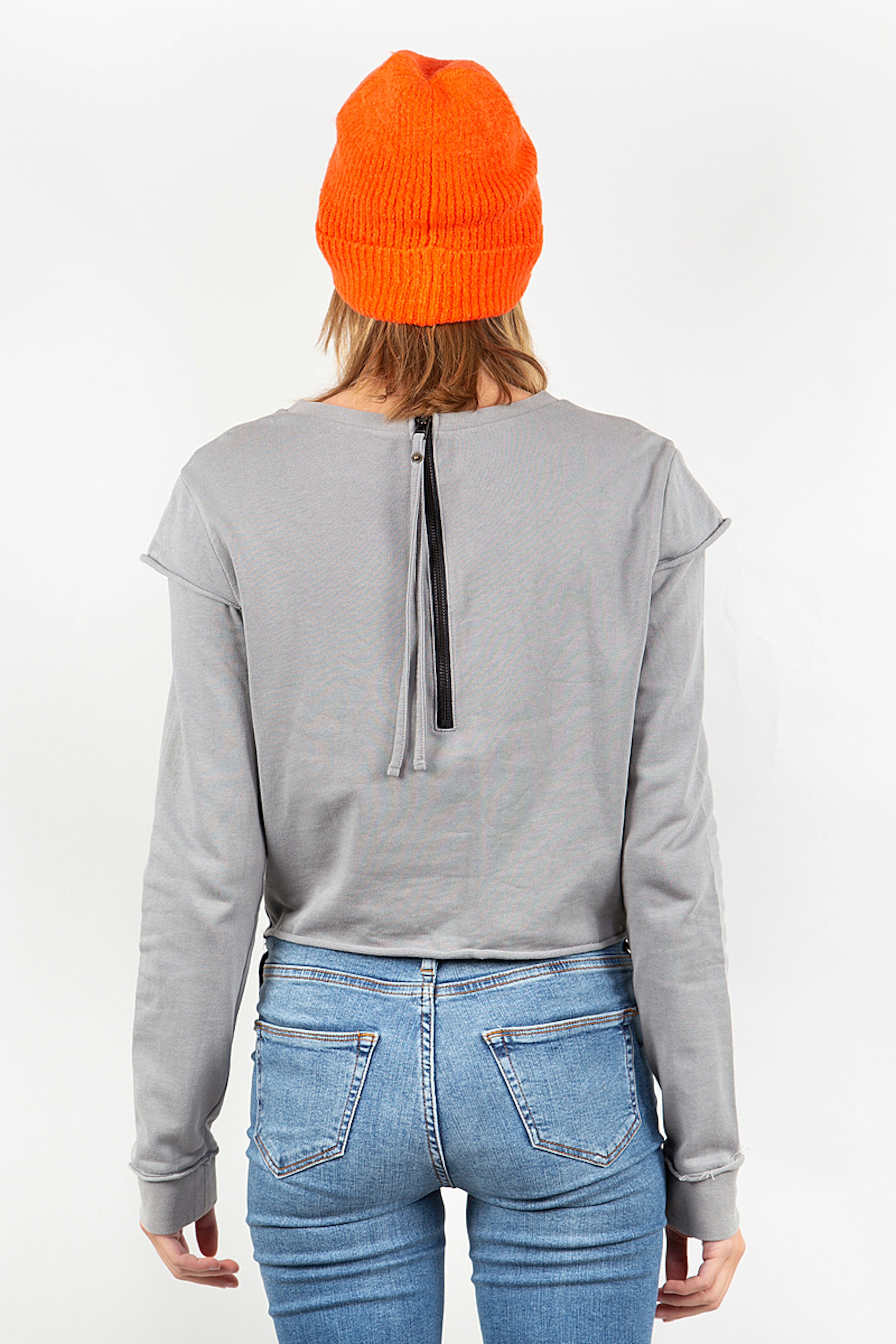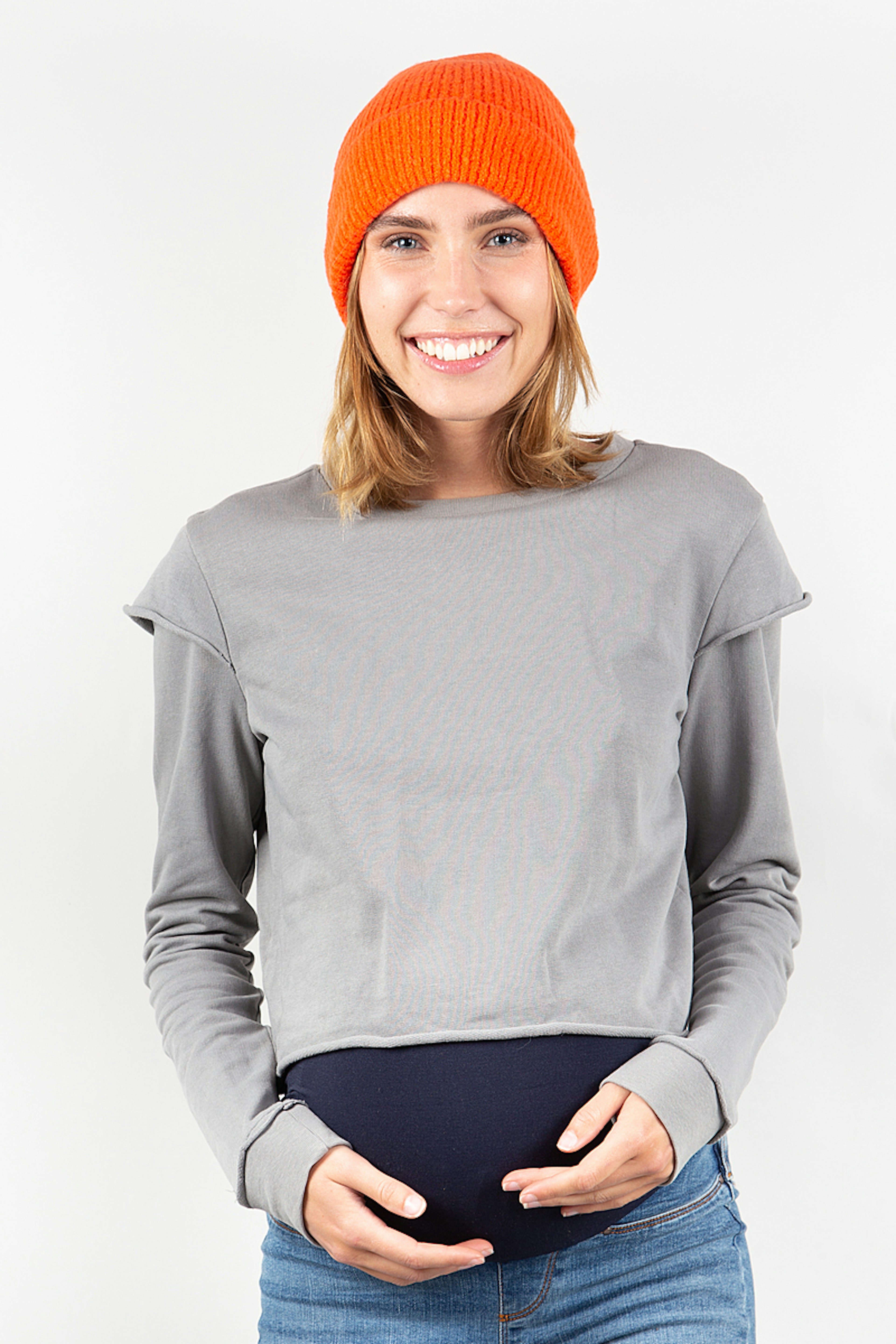 โข Sweat de grossesse croppรฉ โข Couleur grise โข Coupe originale avec mancherons au niveau des รฉpaules โข Bas du sweat coupรฉ ร cru