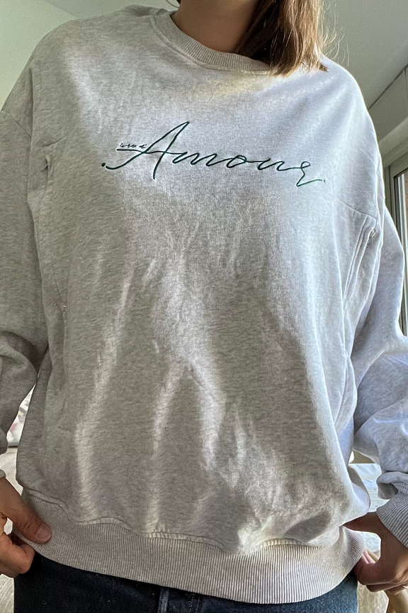 Associez ce sweat gris ร un pantalon en cuir pour un look chic et dรฉcontractรฉ. Parfait pour vous accompagner toute l'annรฉe ! โข Sweat 100% coton โข Coupe tempรฉrรฉe โข Ouvertures zippรฉes latรฉrales โข Doublure douce et grattรฉe โข Broderie "Amour" verte sur le devant