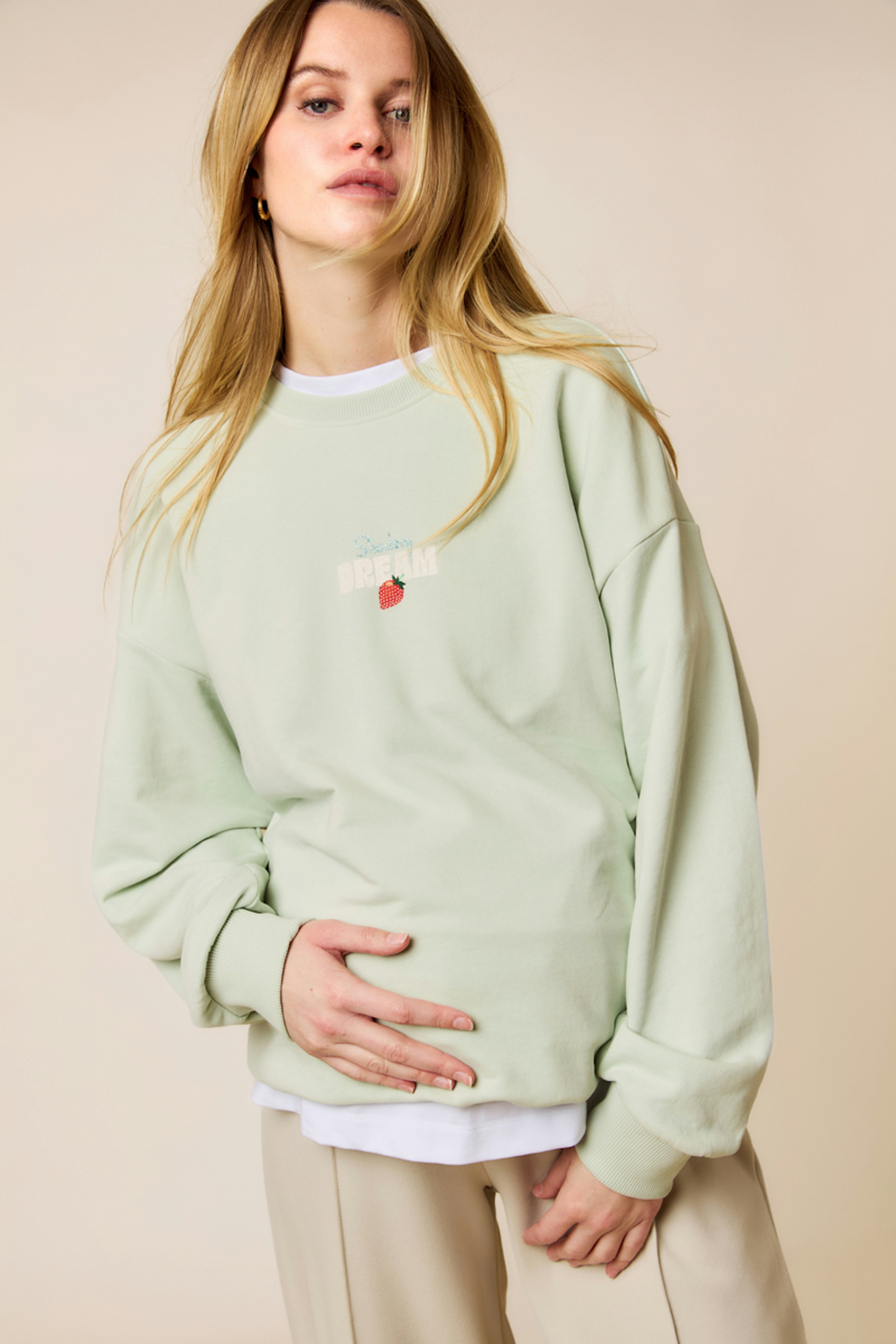 Portez ce sweat avec un jean relaxed et des baskets pour un style décontracté et confortable, parfait pour l'hiver. • Sweat en coton • Coupe confortable • Manches longues • Imprimé au dos • Couleur verte douce