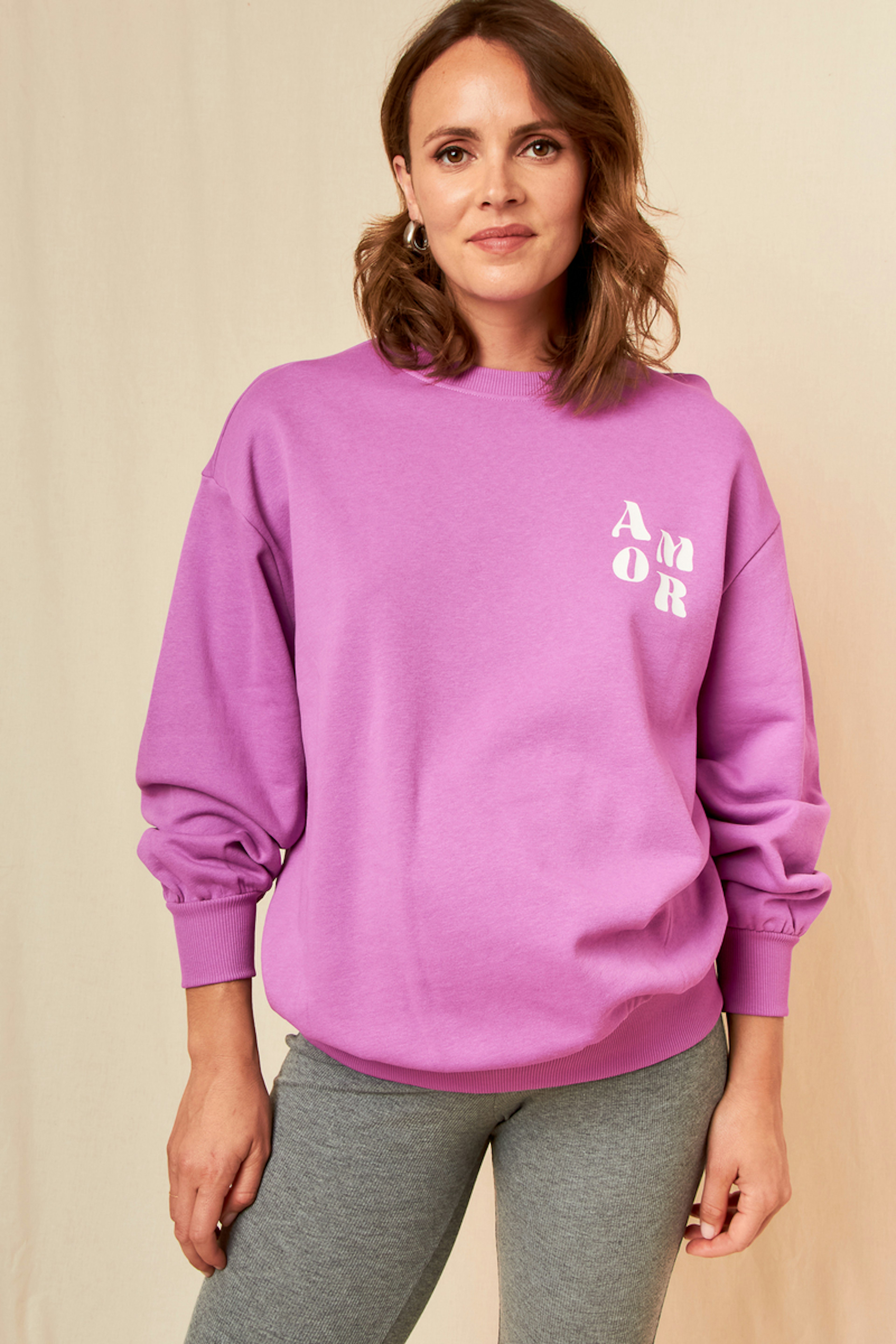 Associez ce sweat à un jean relaxed fit et des baskets pour un look décontracté vibrant. Parfait en toute saison. • Sweat en coton biologique • Coupe tempérée • Manches longues confortables • Ourlet côtelé • Motif imprimé "AMOR"