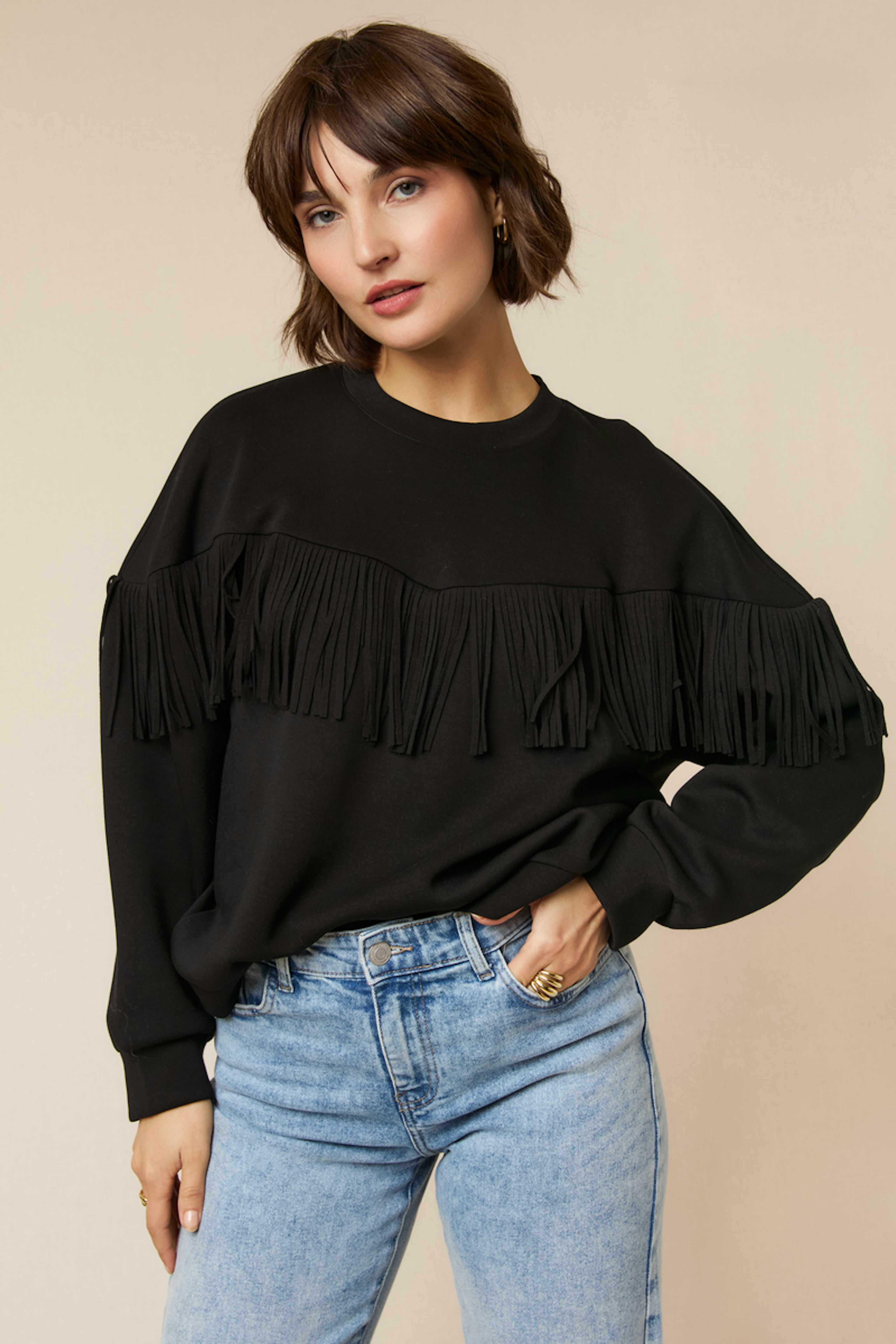 Associez ce sweat avec un jean taille haute et des baskets blanches pour un look moderne et décontracté. • Sweat ample • Manches longues • Franges en détail • Col rond classique • Bordures côtelées