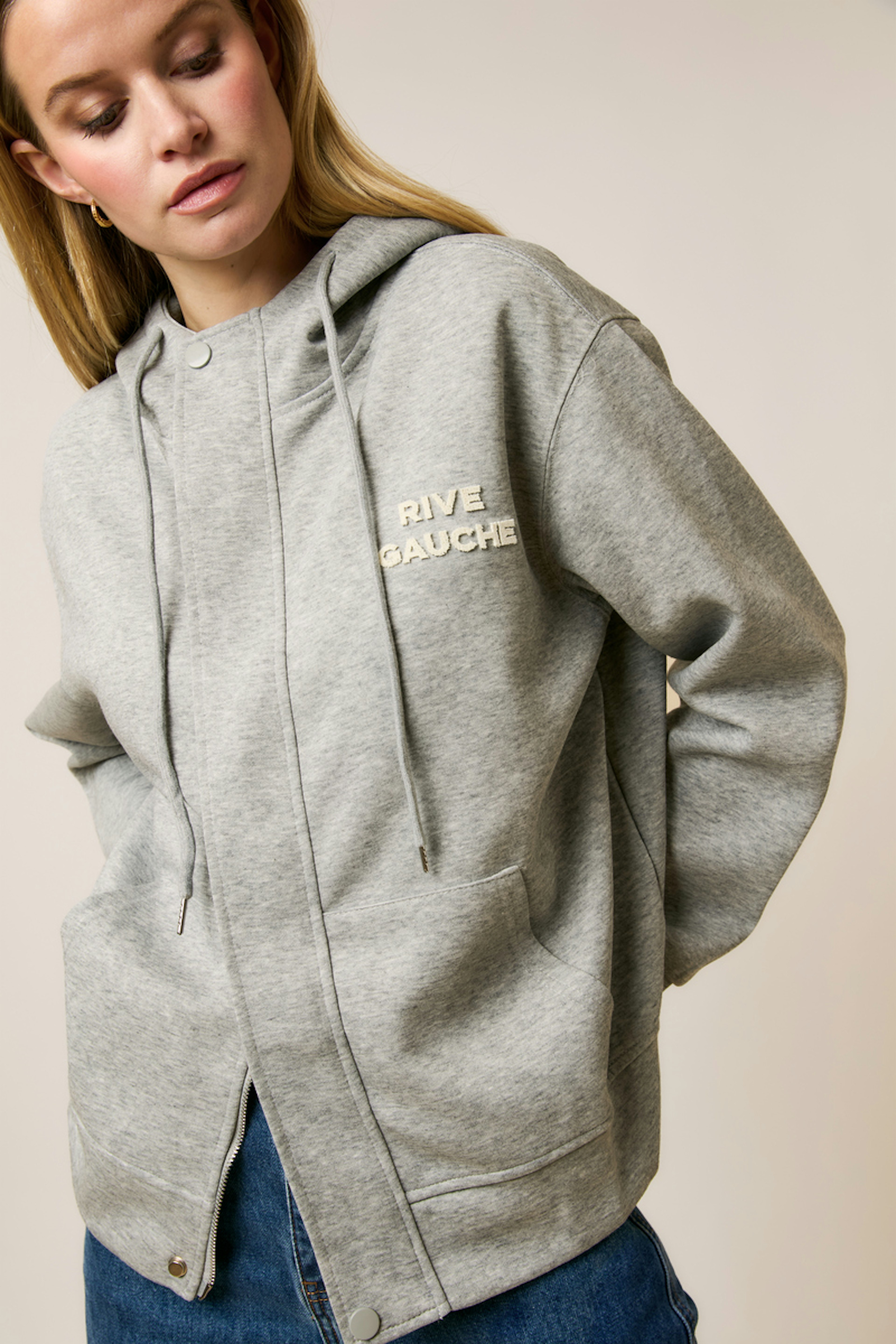 Associez ce sweat à un jean droit pour une tenue décontractée et chic en hiver. • Sweat à capuche • Coupe ample • Manches longues • Fermeture zippée dissimulée • Imprimé sur la poitrine