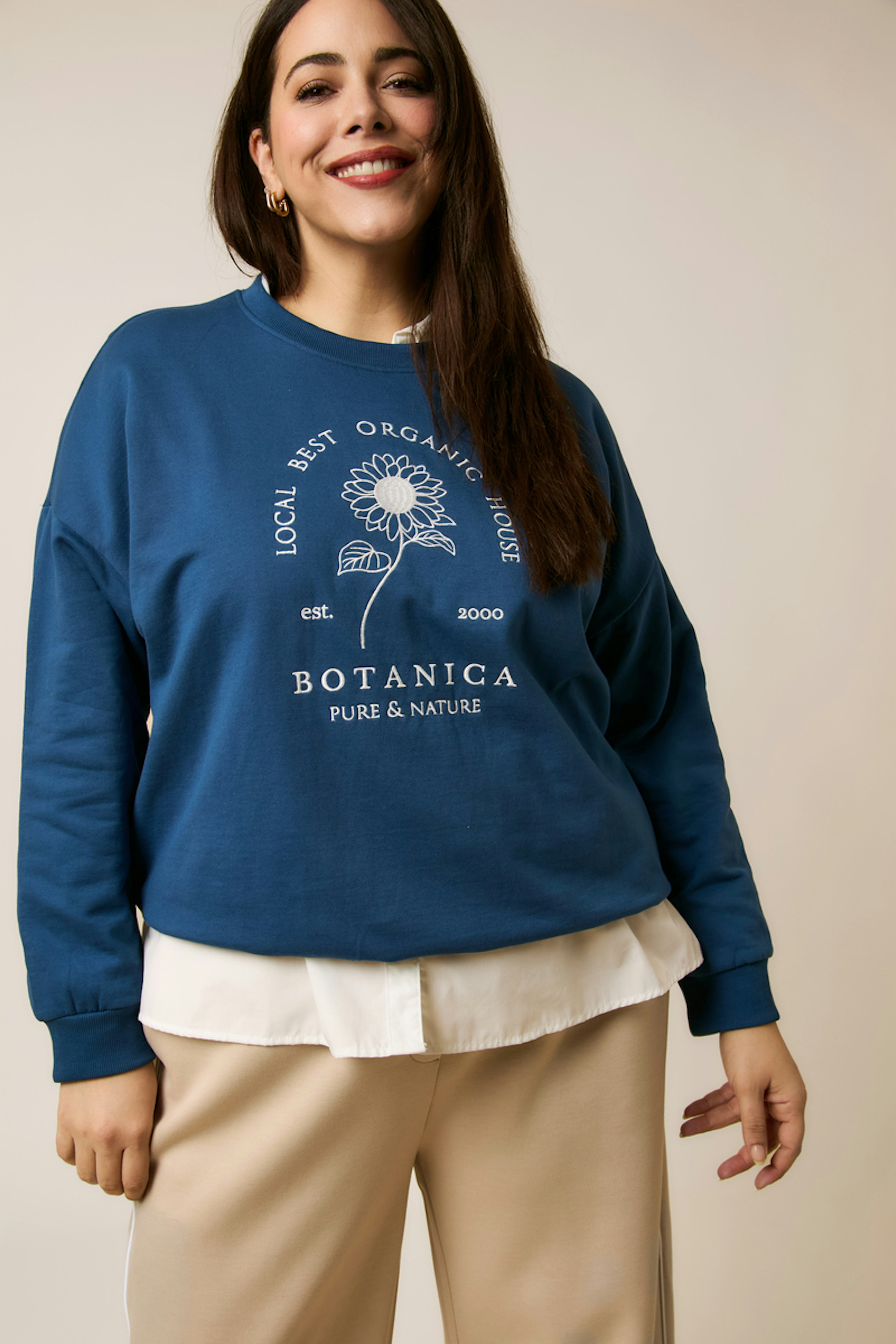 Associe ce sweat à un jean décontracté et des baskets blanches pour un look cosy et tendance en hiver. • Sweat en coton recyclé • Coupe ample confortable • Manches longues • Col rond classique • Motif floral élégant