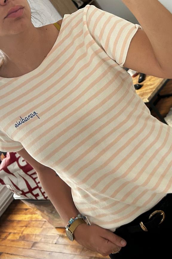 โข T-shirt mariniรจre rose et blanc โข Inscription brodรฉe "Paradisio" sur le devant โข Jersey 100% coton biologique certifiรฉ GOTS โข Coupe droite lรฉgรจrement ajustรฉe โข Finition encolure bateau finie en ourlet une aiguille โข Fabriquรฉ au Portugal