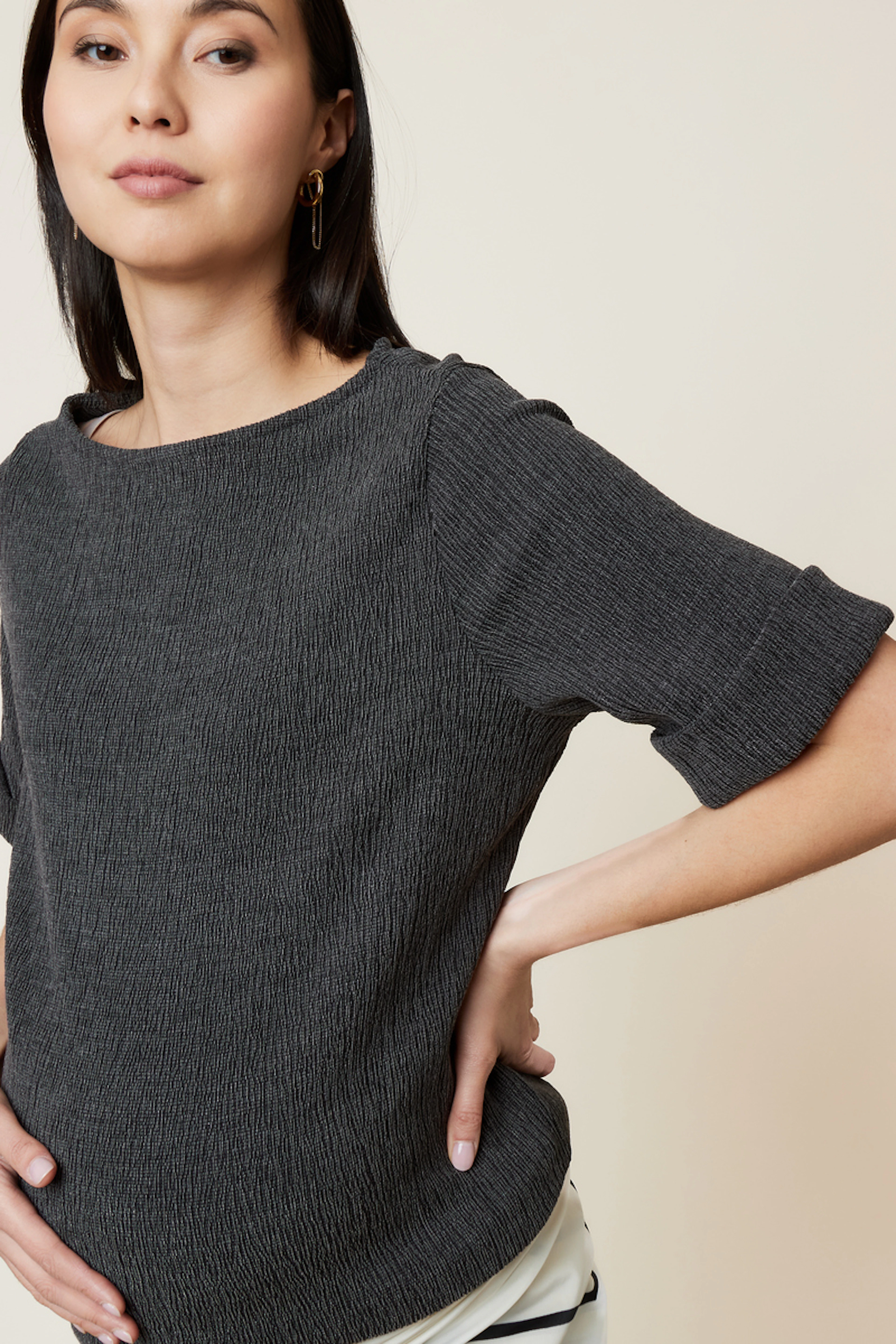 Ajoutez une touche chic à ce t-shirt en l'associant à un pantalon ample et des accessoires dorés. Parfait pour les journées ensoleillées. • T-shirt ample et confortable • Col bateau élégant • Manches courtes retroussées • Conçu pour les futures mamans • Tissu texturé moderne